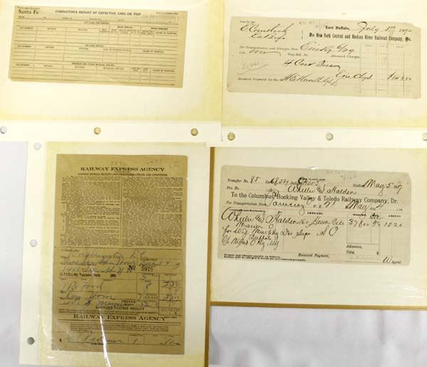 Railroad Ephemera, includes 1. Receipt to Columbus, Hocking Valley & Toledo Railway Company, Dr. dated May 6, 1887 2. Receipt to Columbus, Hocking Valley & Toledo Railway Company, Dr. dated May 5, 1887 3. Railway Express Agency Uniform Receipt, dated Dec. 19, 1853 4. Receipt to Columbus, Hocking Valley & Toledo Railway Company, Dr. dated May 4, 1887 5. Receipt to Indiana, Decatur & Western Railway Co., Dr. dated June 3, 1897 6. Receipt to New York Central and Hudson River Railroad Company, Dr., dated July 1st, 1890 7. Santa Fe Railroad Conductor's Report of Defective Cars on Trip Form