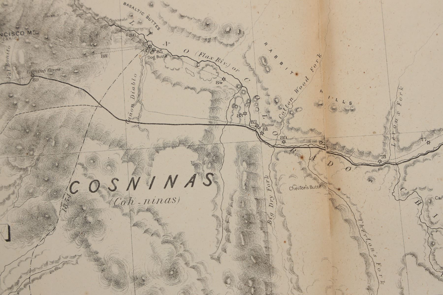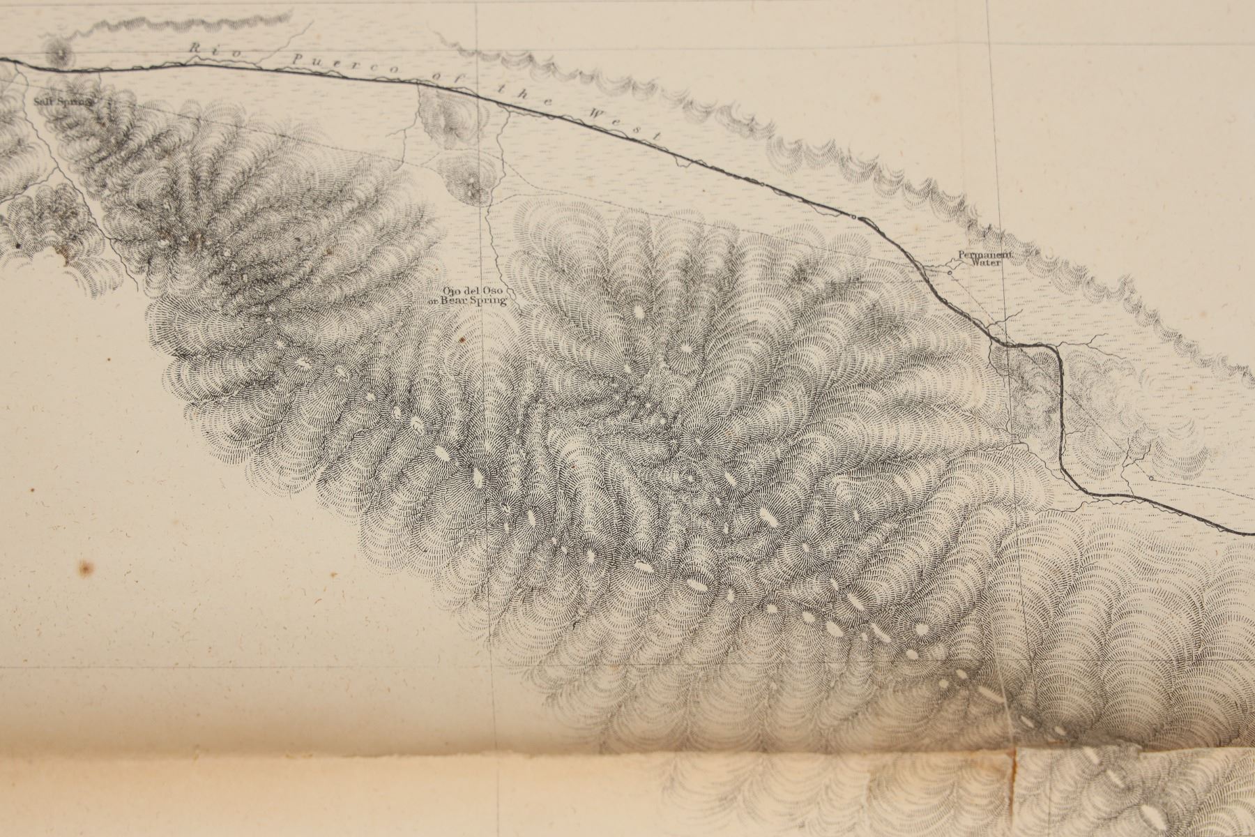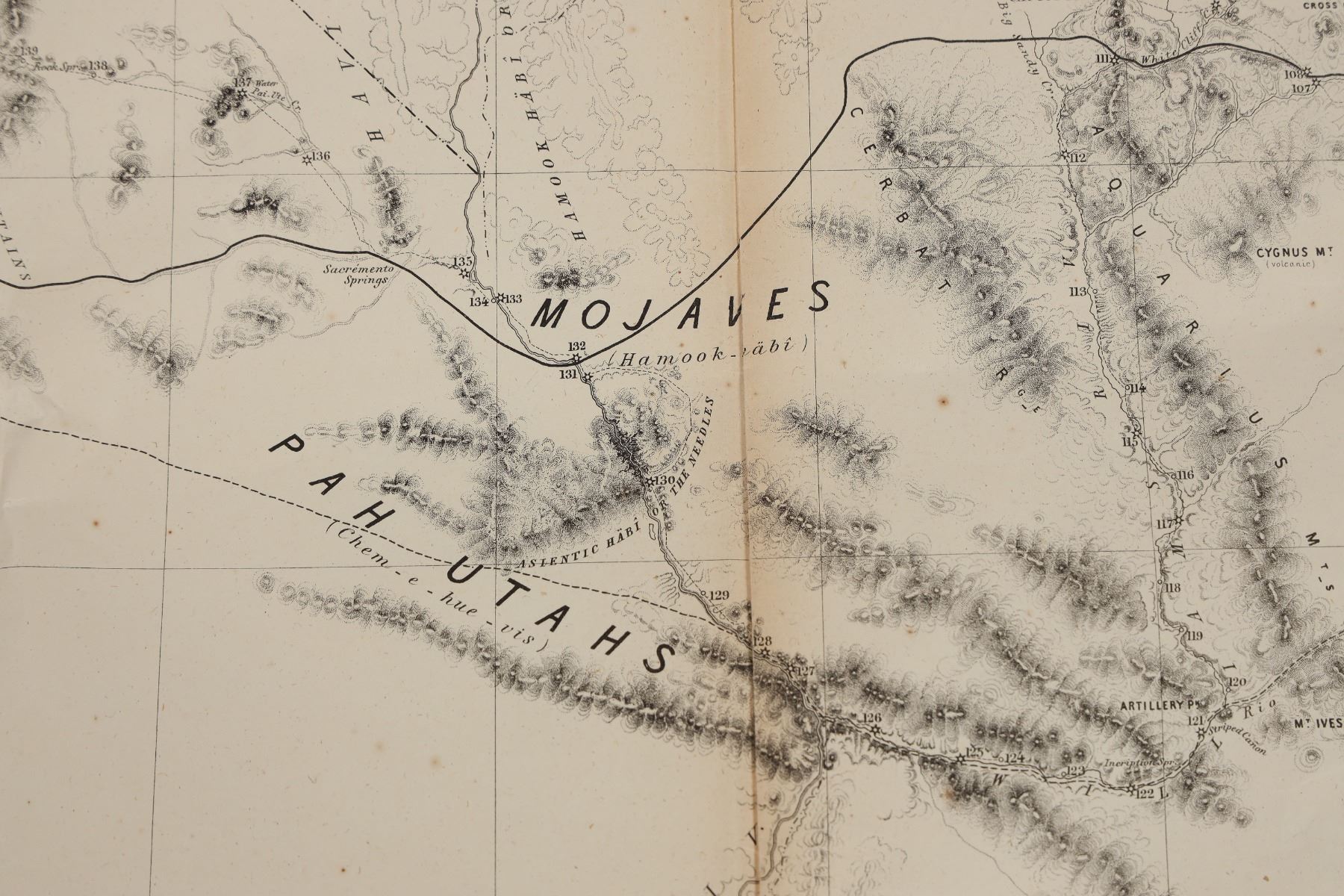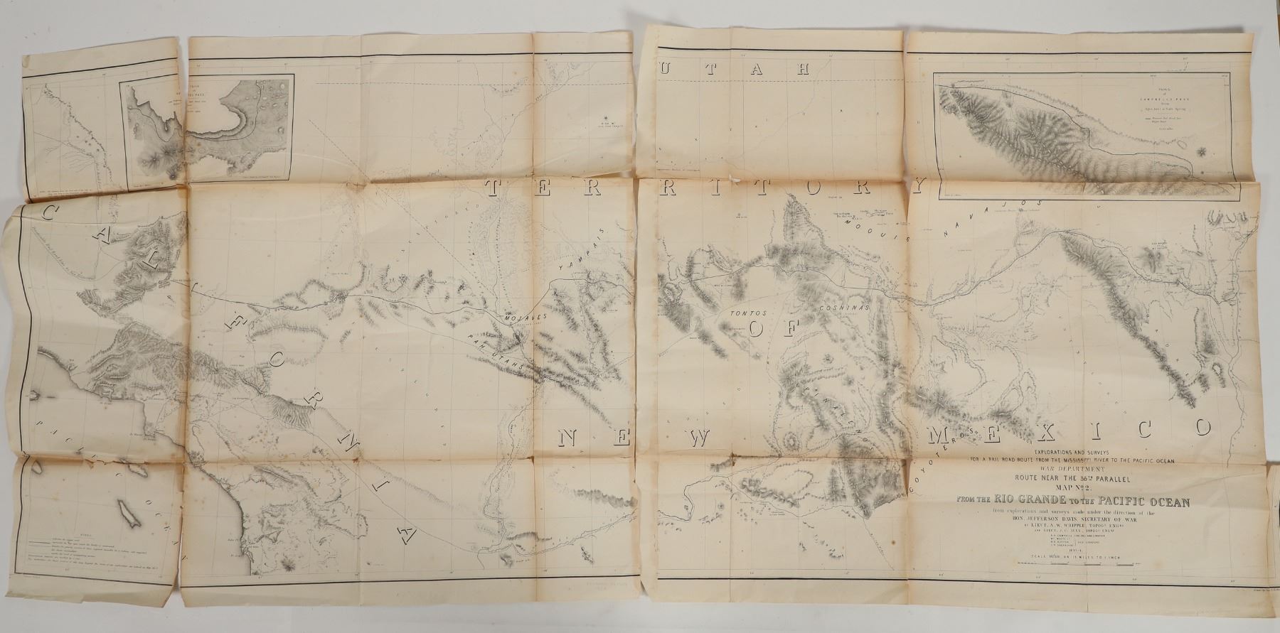 This is a railroad explorations and surveys map from the Rio Grande to the Pacific Ocean under the direction of Jefferson Davis Secretary of War. 1853-54. At 24 in. X 53 in. in segments. Printed by Selmar Siebert mapped by Lieut. A.W. Whipple Topographic Engineer. They largely followed the 35th parallel. An important map that developed the nation. In several pieces, tears at folds, but complete in need of restoration. Please see photos for details.