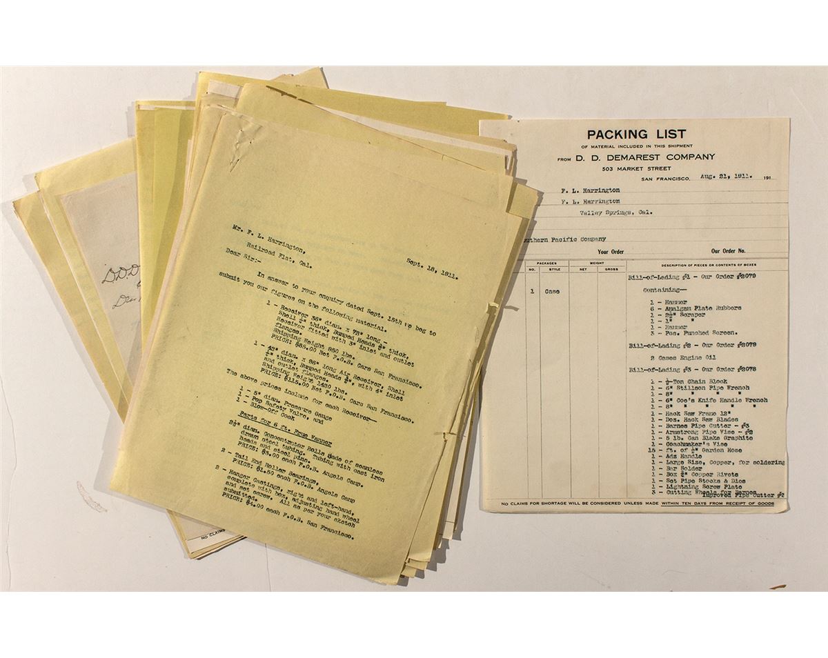 Letters, receipts, orders between Railroad Flats (F. L. Harrington)and D. D. Demarest Co. Railroad flats, a historic mining town, elevation 2,600 feet (788 m), was named after primitive mule-drawn ore cars used here. There was never actually a railroad here. The town was established in 1849. It was the site of an Indian council as well as the center of rich placer and quartz mining. Its largest producer was the Petticoat Mine. The post office was established in 1857, closed in 1858, and re-established in 1869[2] and the Edwin Taylor store built in 1867. The town's population was decimated in 1880 by black fever.