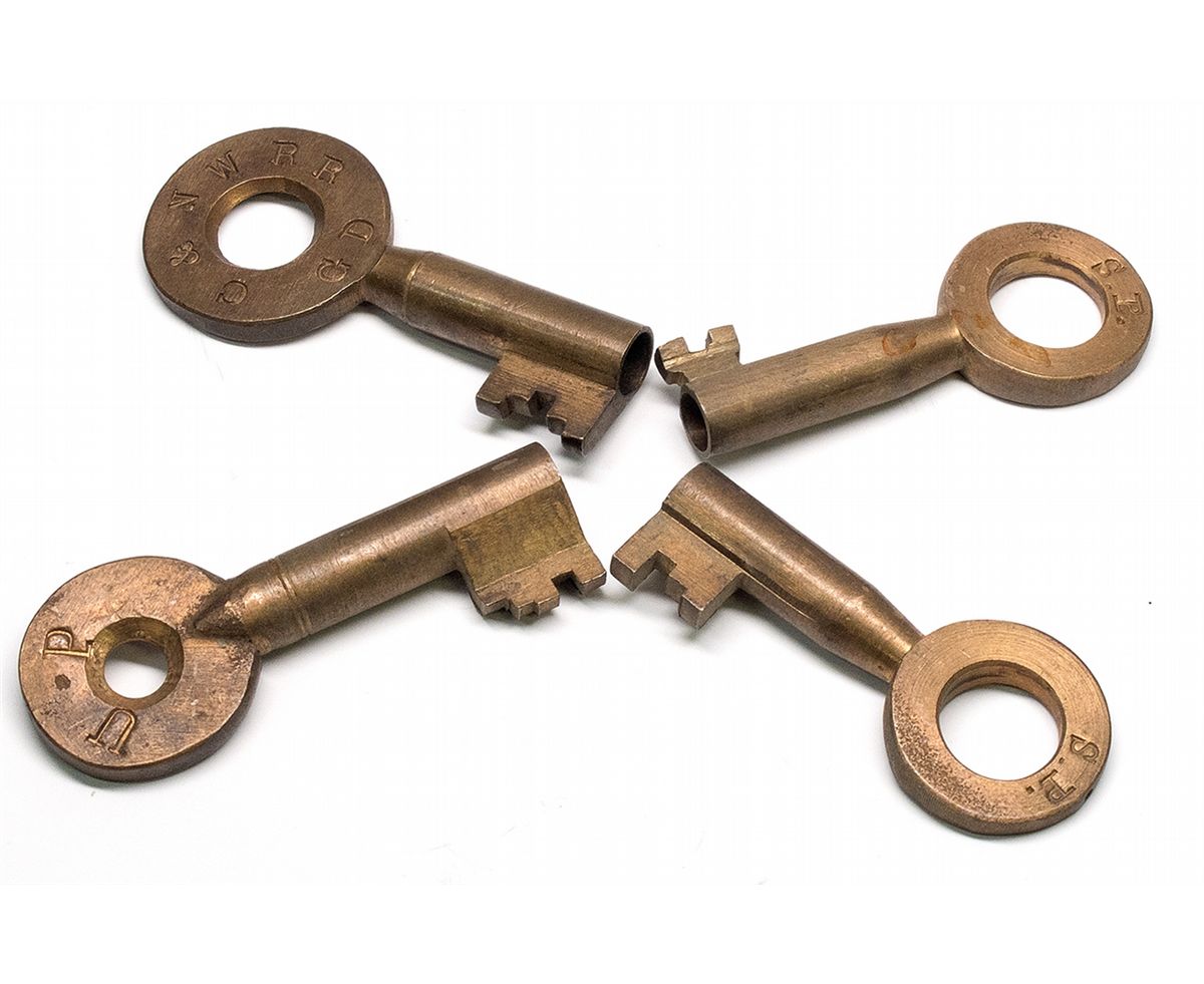 c1900 This is a lot of four railroad keys. Tey include one is from the Union Pacific, Southern Pacific, Santa Fe and the Chicago & Northwestern. Gordon Harris Estate - HKA#65764
