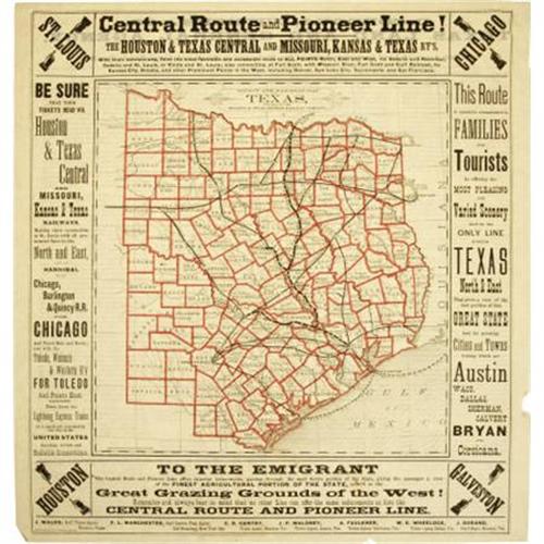 <B>Railroad Map: "Central Route and Pioneer Line!: The Houston & Texas Central and Missouri, Kansas & Texas Rail Yards"</B></I> (Chicago: Rand McNally, ca. 1875), 15.5" x 16.5". This map shows the counties of Texas and the two railroad routes through the state. An advertisement at the bottom appeals "TO THE EMIGRANT / The Central Route and Pioneer Line offers superior inducements, passing through the most fertile portion of the State, giving the passenger a view of the FINEST AGRICULTURAL PORTION OF THE STATE, as well as the Great Grazing Grounds of the West!" The map is in very good condition with minor chipping on the right and bottom edges. <I>Ex. Dallas Historical Society.</B></I><BR><BR><b>Shipping:</b> Flat Material, Large (<a target="_blank" href="http://www.heritageauctions.com/common/shipping.php">view shipping information</a>)