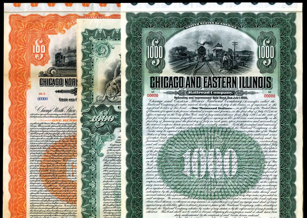 Illinois. Indiana. Wisconsin. Lot of 3 Specimen Gold Coupon Bonds, Includes 1925, Chicago, North Shore and Milwaukee Railroad Co., $100, 6%, Orange; 1905, Chicago and Eastern Illinois Railroad Co., $1000, 4%, Green; and 1922, Vandalia Railroad Co., 4%, Green, splitting at top horizontal fold. Attractive trio of specimen bonds. ABNC or WBNC.