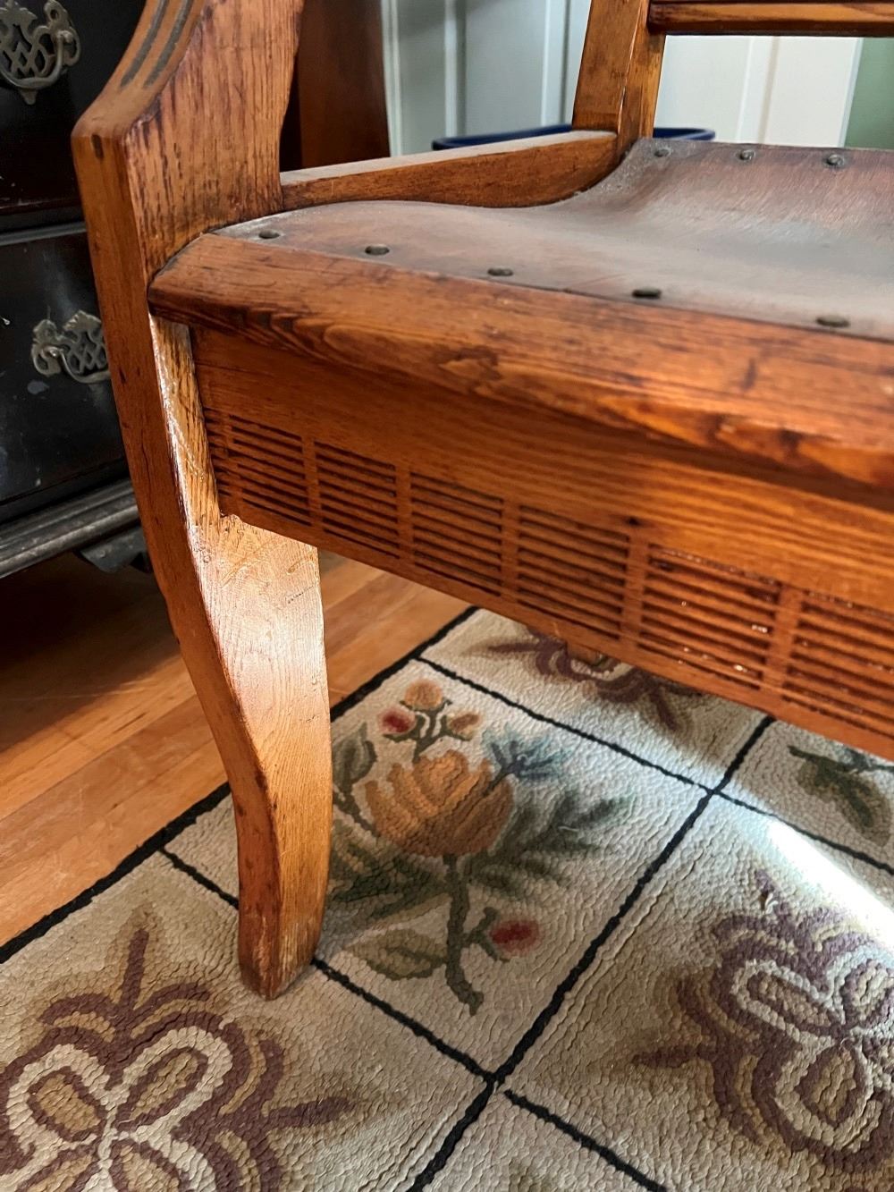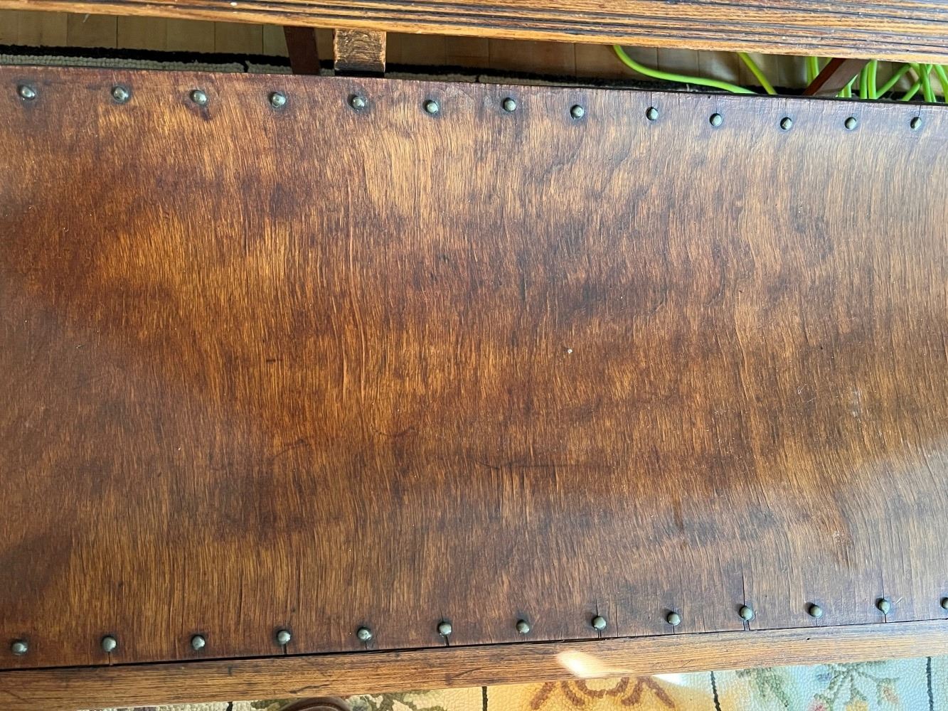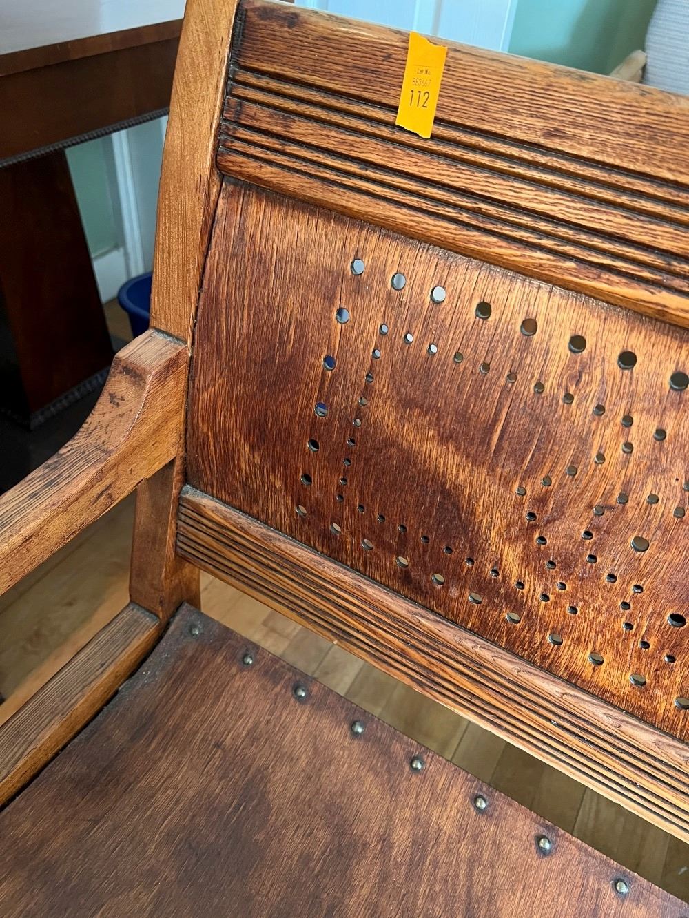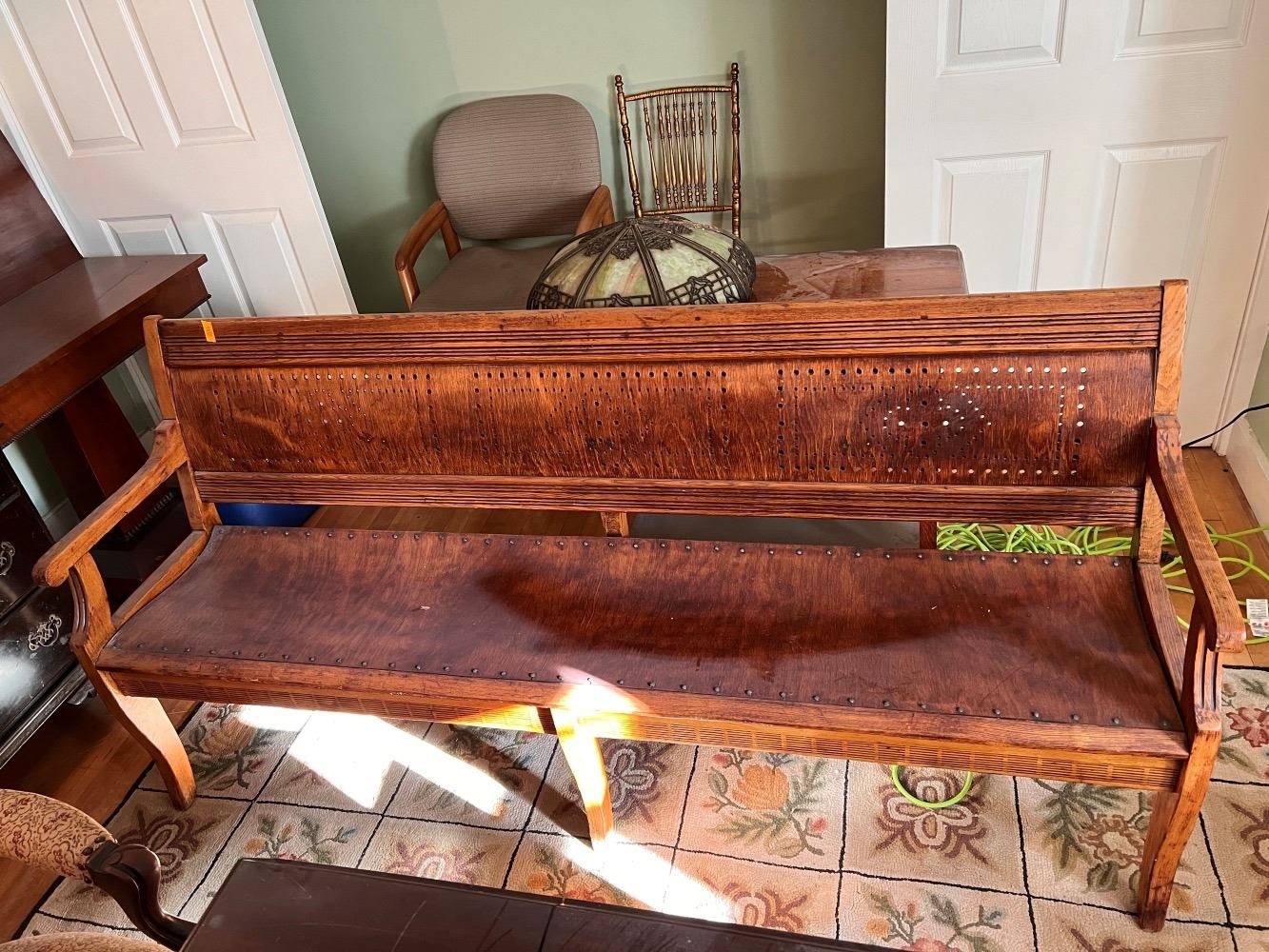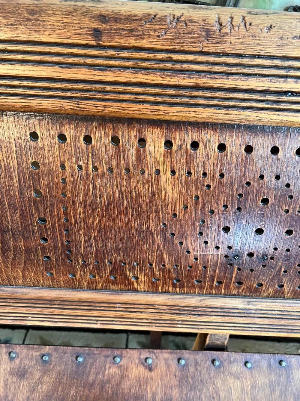 Meeting Bench came from a railroad station, in beautiful shape, main wood is oak, has unusual punch hole design in seat back, has extra legs in middle. Measures approx. 6 feet long x 34.5 inches tall x 17 inches deep. Beautiful piece, great for large farm table!