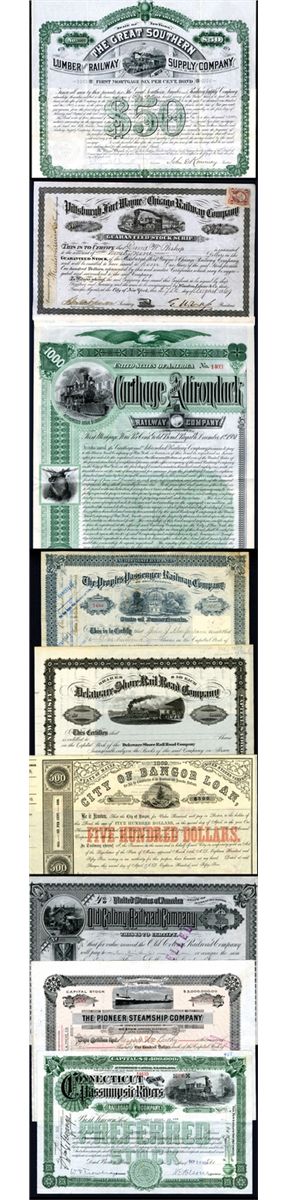 Lot of 9 items, Highlights include New York, 1892, Carthage and Adirondack Railway Co., $1000 green, 1st Mortgage 4% Gold bond, I/U; NY, 1882, Great Southern Lumber and Railway Supply Co., $50, 6% Bond, I/U; CT. 1934, Connecticut and Passumpsic Rivers RR CO., 26 Shrs, I/U; and 6 additional issued and unissued stocks and bonds. Overall in Choice Fine to XF condition. Attractive assortment.