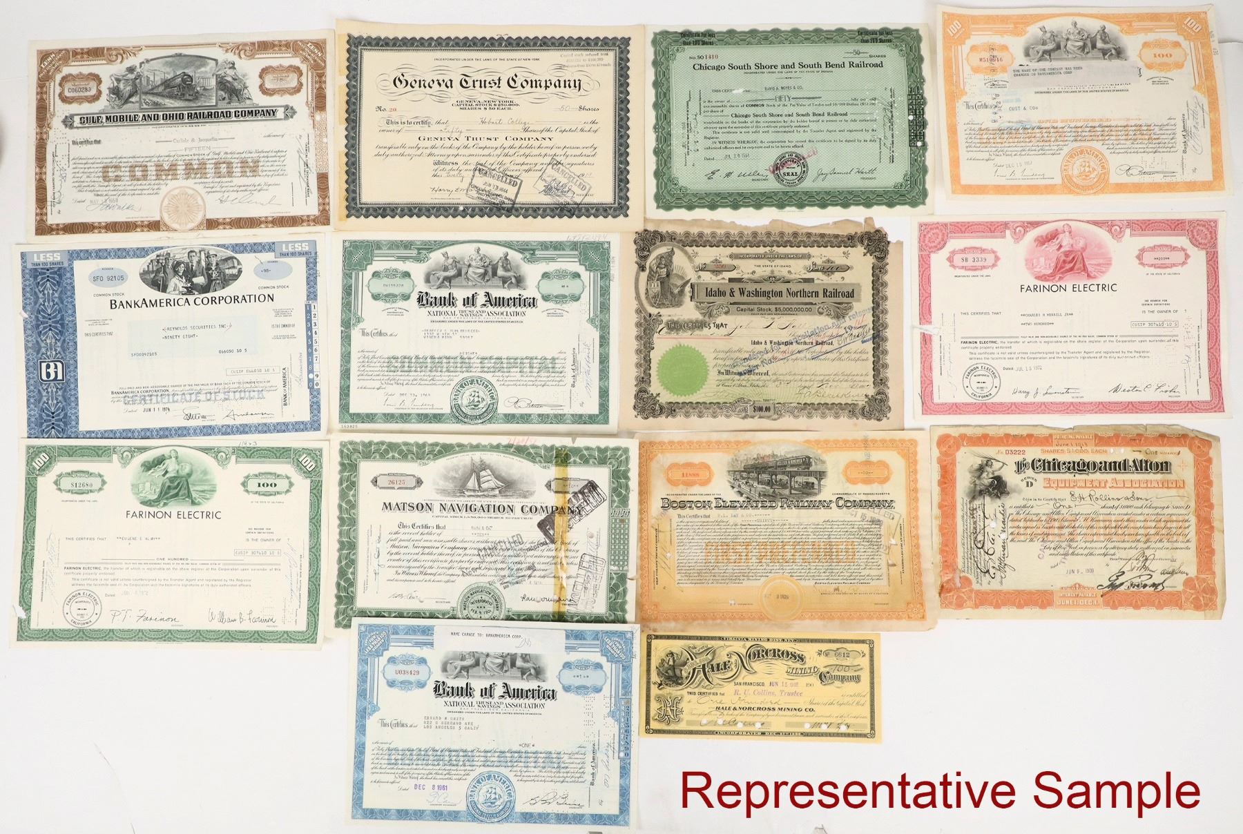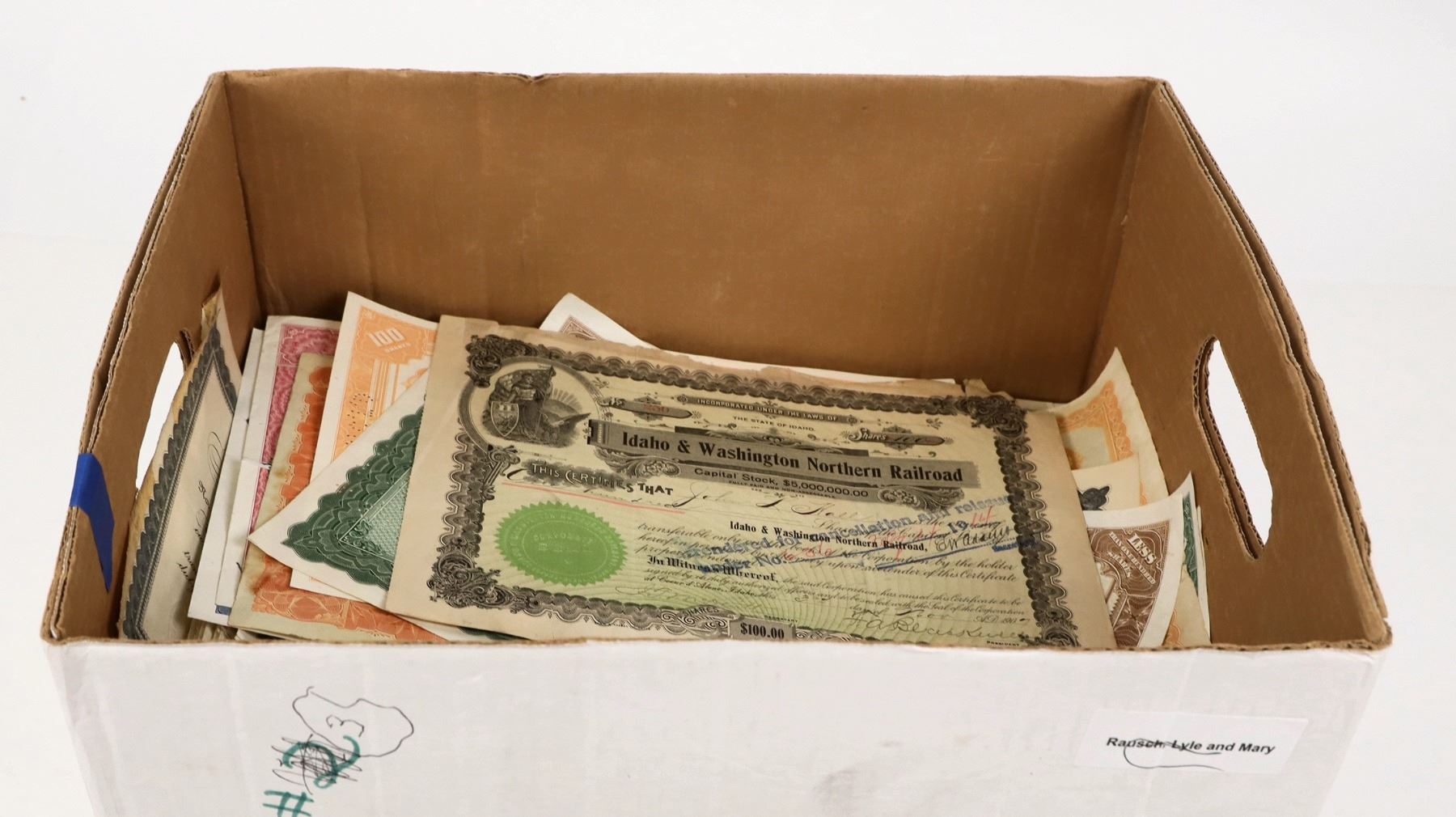 Approx 500-700 certs, mostly damaged, wide date range, mostly railroads. Please inspect. This is a random group.