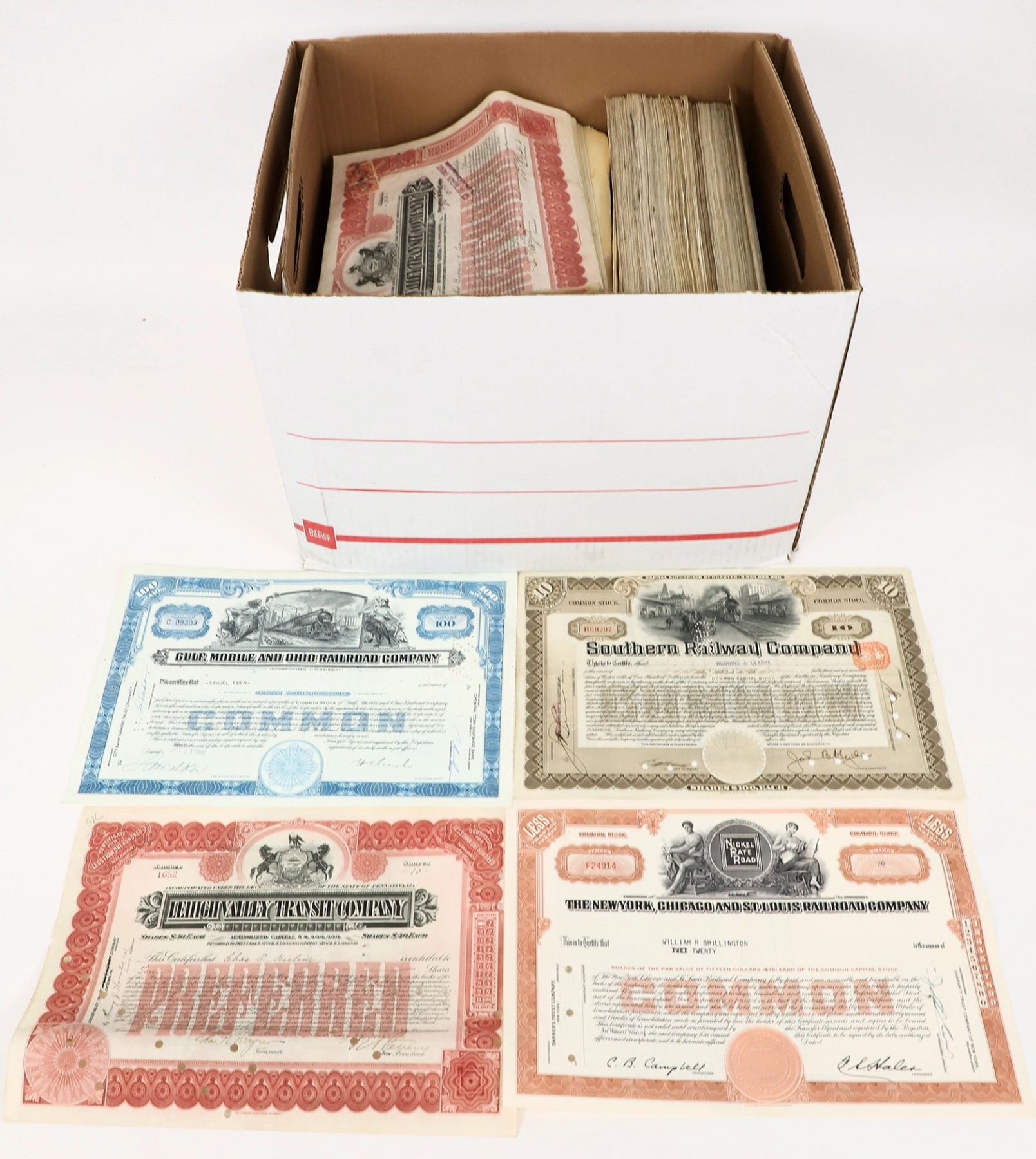 Gulf Mobile and Ohio 500 each blue, brown. Lehigh Valley about 200 red, Southern Railway about 300 brown; NY, Chicago about 500 brown.