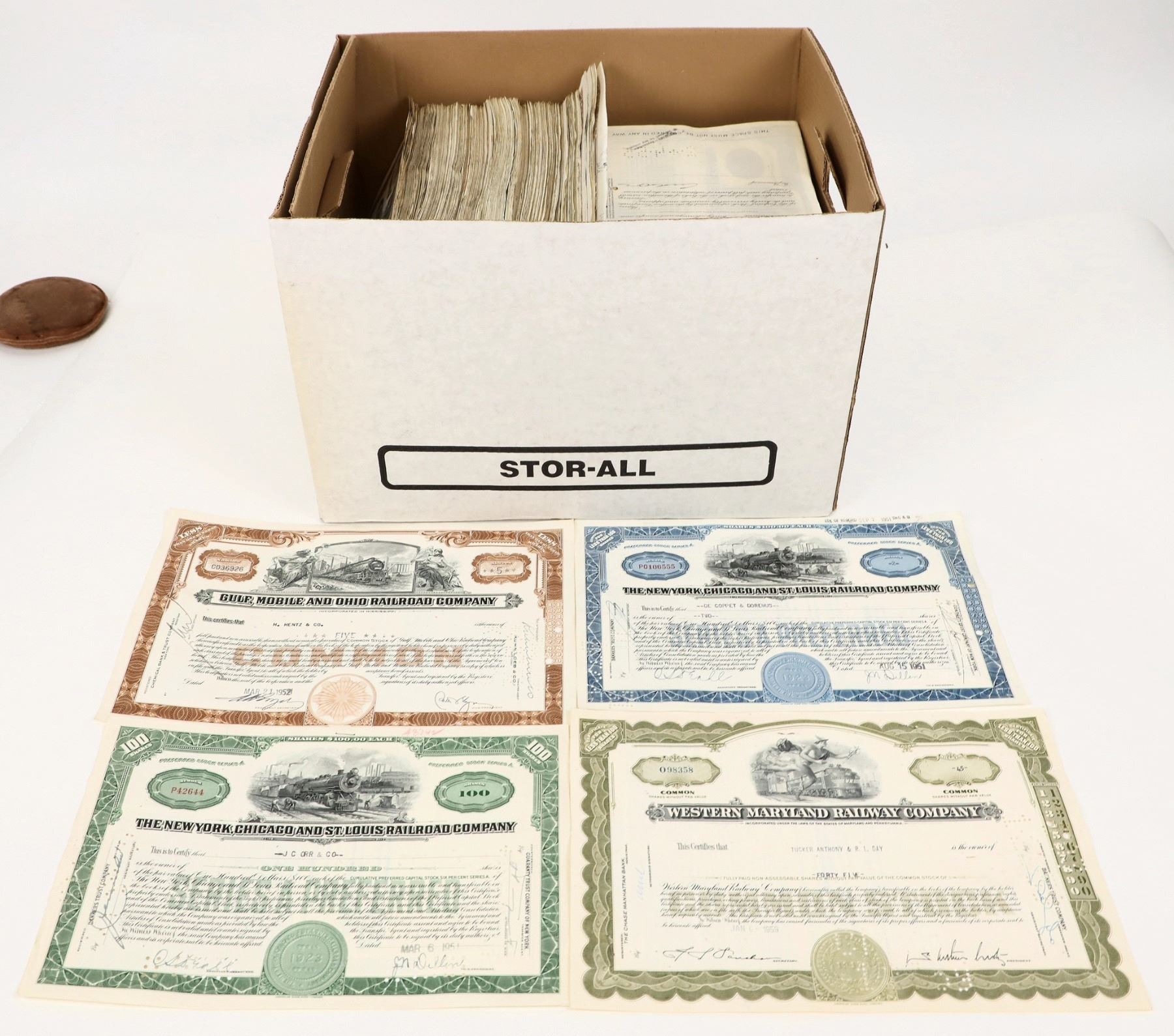 Railroad Box Lot, 5 different rails: South Penn RR 1800s 300 plus, Gulf Mobile Ohio about 700 brown, New York, Chicago about 400 blue and green, Western Maryland about 400 plus blue and olive, Southern Railway about 300 brown. See photos.
