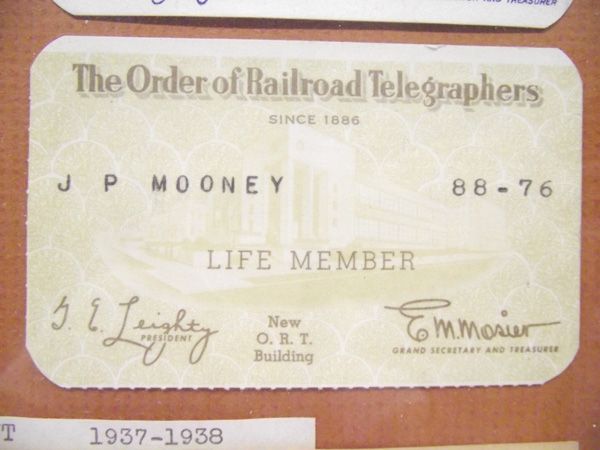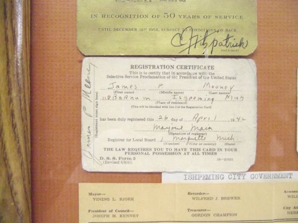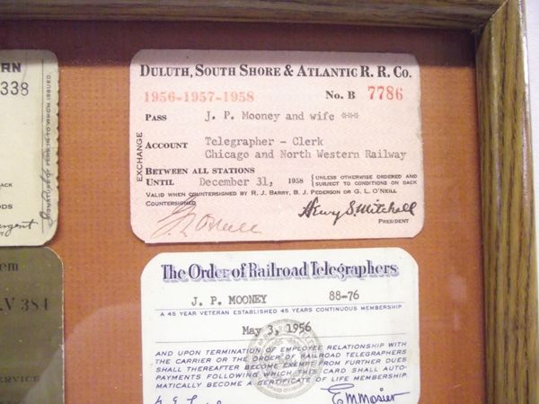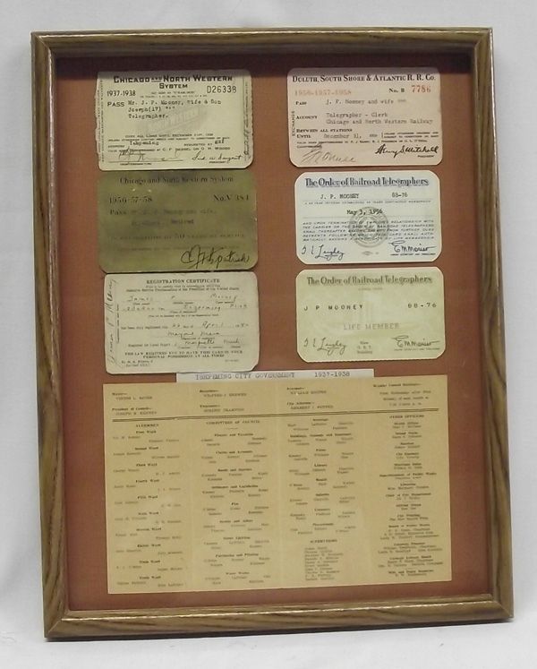 Railroad Telegraph, Selective Service Memorabilia. Framed presentation of 5 Railroad identification cards for Telegraph operators, a Registration Certificate for Selective Service and a paper showing the names of the Ishpeming City Government 1937-1938. In wood frame, under glass. The cards are approximately 2.5''x4''.