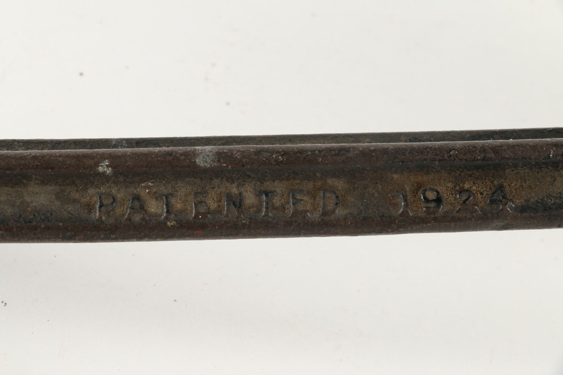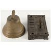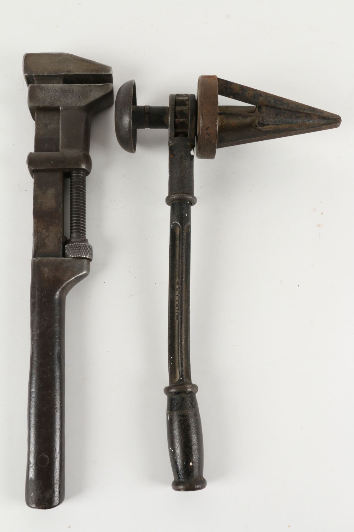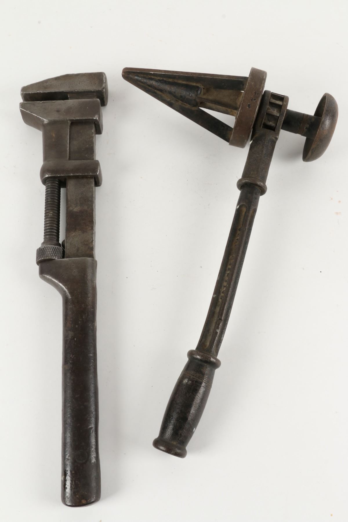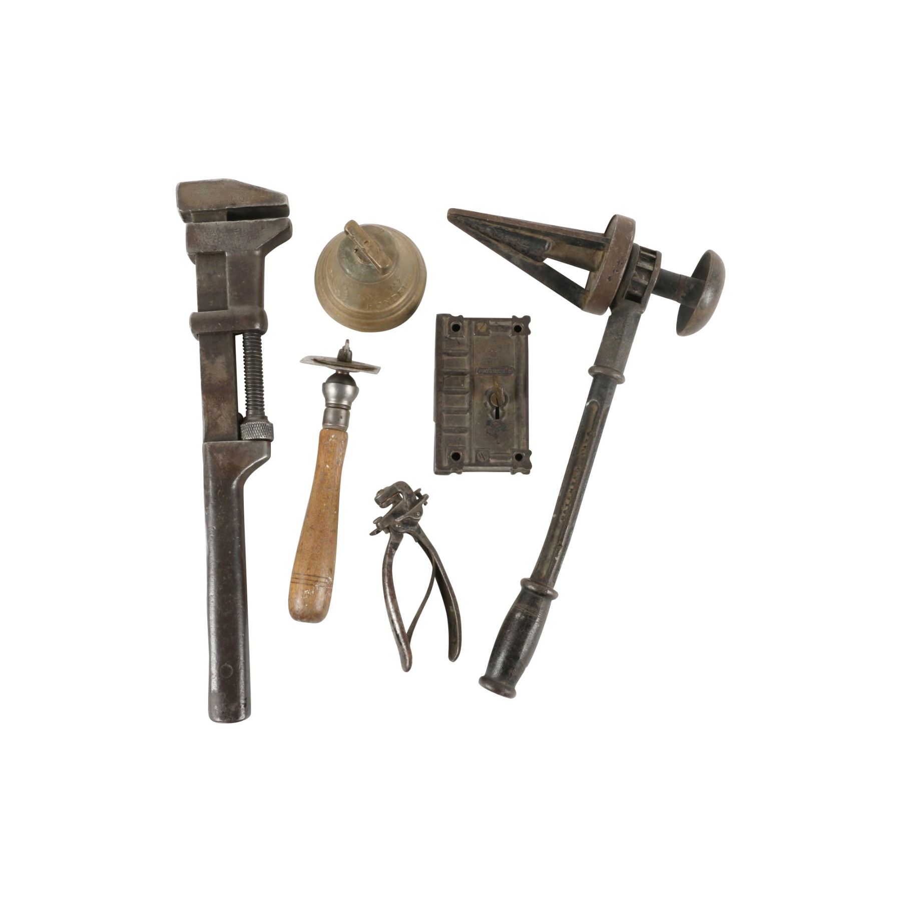 Six (6). Pipe wrench stamped’ ”Mfd. Under L. Cof...CPR (Canadian Pacific). Steam fitting tool. Saw blade hone. Blade scraper. Cast brass embossed bell. Cast lock embossed, “Peterboro”. CPR wrench 17”. Complete. $100-150.