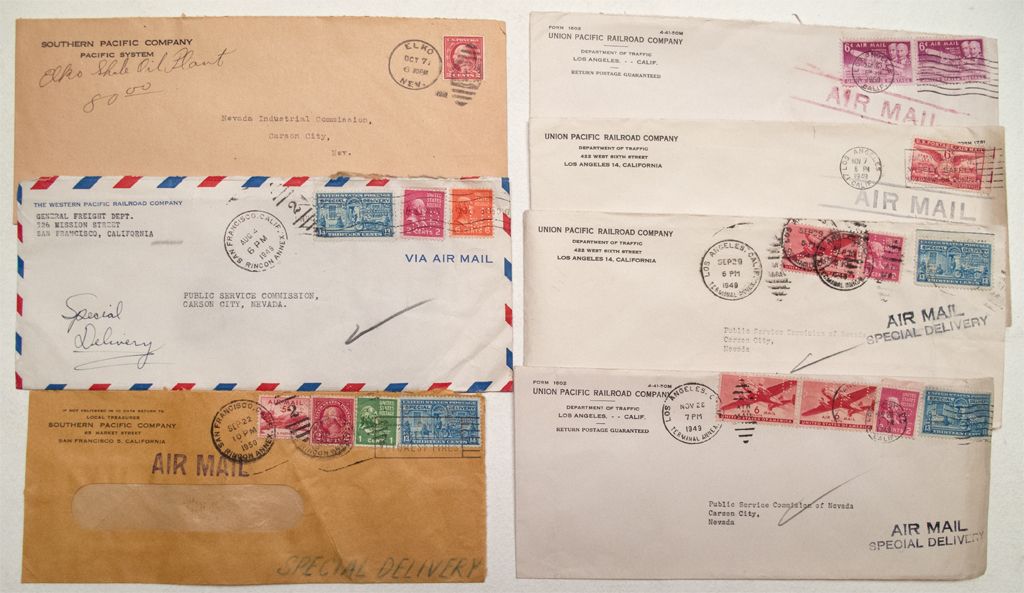 Union Pacific, Southern Pacific, and Western Pacific. Five air mail and one special delivery. One Elko cancel.