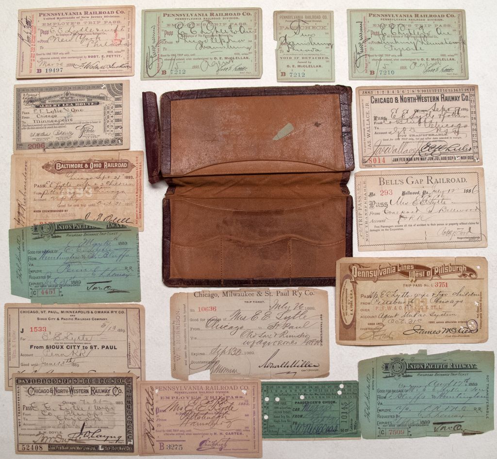 1882-1893. Papers include Union Pacific, Pullman, Minneapolis & St. Louis, Baltimore & Ohio, Pennsylvania Lines, Bell's Gap, Chicago & North-Western, Pennsylvania Railroad ,and Chicago, Milwaukee & St. Paul. Old well-worn wallet.