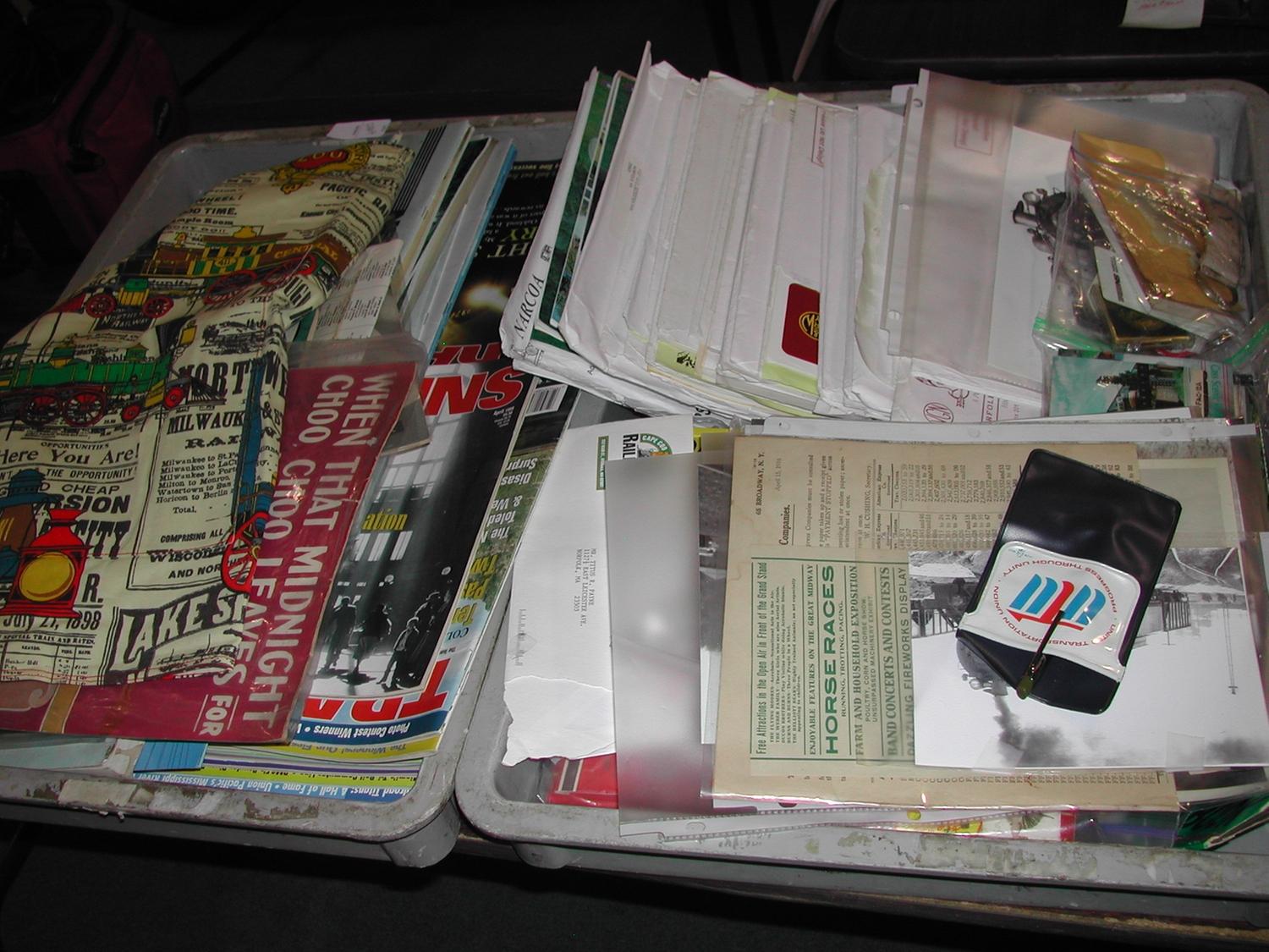 2 Tray lots Railroad postcards, books of matches, pin back buttons, an apron, NARCOA papers, and more