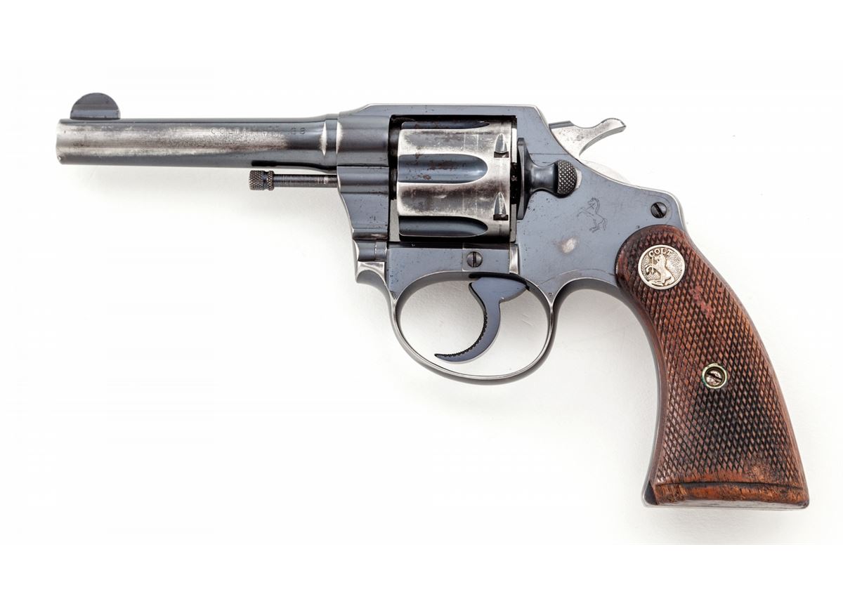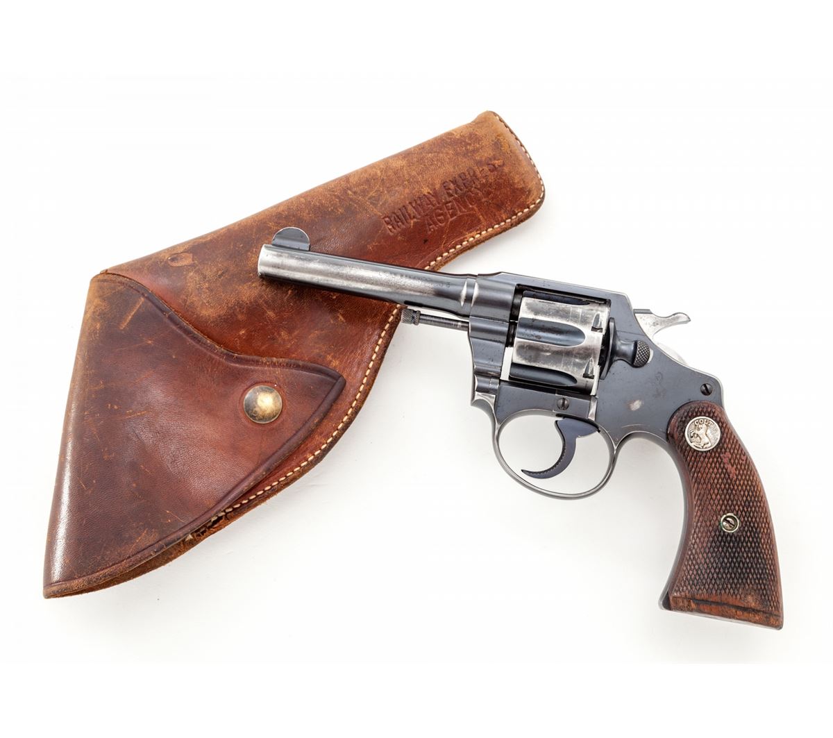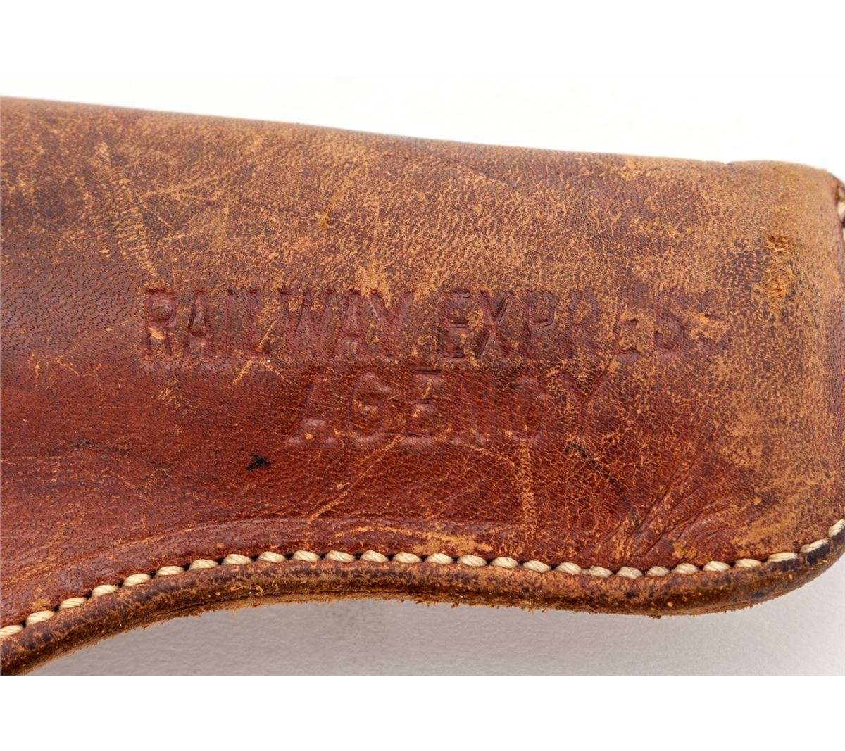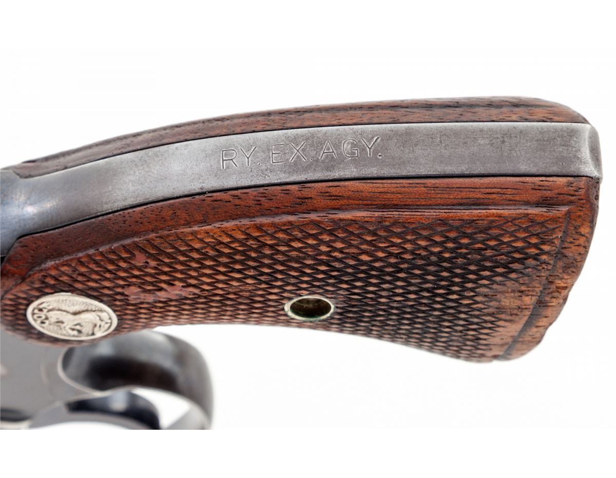 Railway Express Agency marked Colt Police Positive Double Action Revolver, #324166, .38 Colt cal., 4'' barrel, blue finish, factory checkered walnut grips with Colt medallions. Backstrap marked ''Ry. Ex. Agy.''. In original ''Railway Express'' marked holster. With factory letter verifying all features including markings to backstrap. As shipped to W.A. Field, Superintendent, Railway Express Agency Inc., San Francisco, CA, July 10, 1929, in a 24-gun shipment. Condition is near fine retaining approx. 80%-90% blue with most of the losses from holster wear. Grips with moderate flattening. Action is crisp, bore is bright. Holster with scuffs along forward edge and some oil darkening. Est.: $500-$750. (C&R)