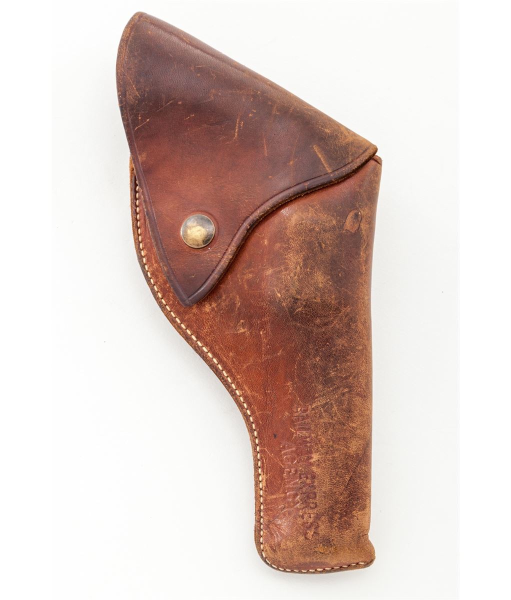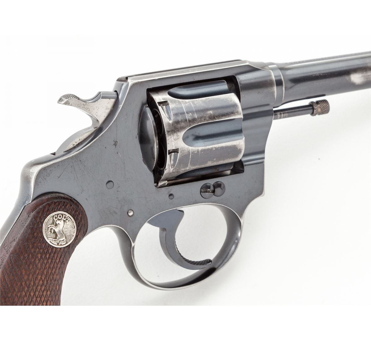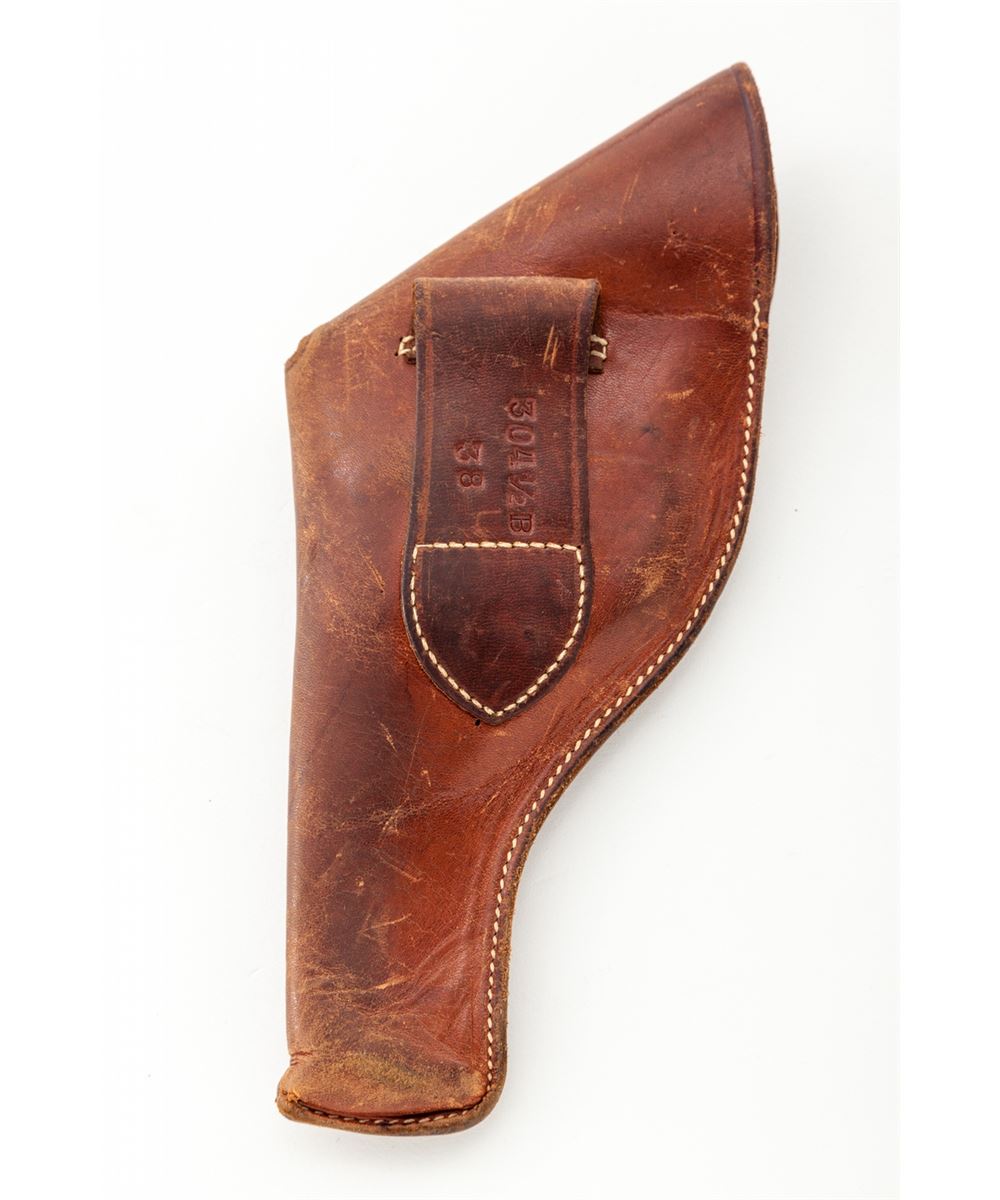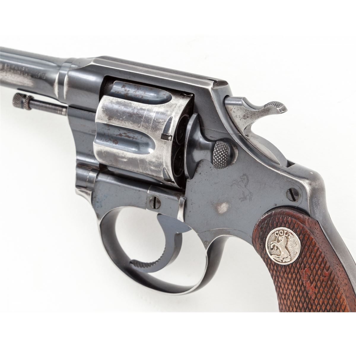 Railway Express Agency marked Colt Police Positive Double Action Revolver, #324166, .38 Colt cal., 4'' barrel, blue finish, factory checkered walnut grips with Colt medallions. Backstrap marked ''Ry. Ex. Agy.''. In original ''Railway Express'' marked holster. With factory letter verifying all features including markings to backstrap. As shipped to W.A. Field, Superintendent, Railway Express Agency Inc., San Francisco, CA, July 10, 1929, in a 24-gun shipment. Condition is near fine retaining approx. 80%-90% blue with most of the losses from holster wear. Grips with moderate flattening. Action is crisp, bore is bright. Holster with scuffs along forward edge and some oil darkening. Est.: $500-$750. (C&R)