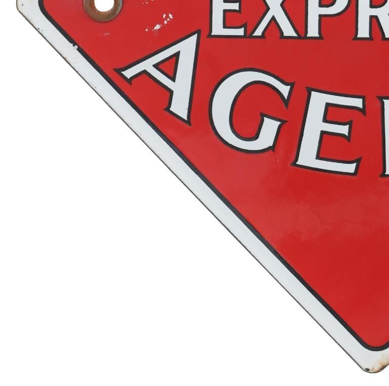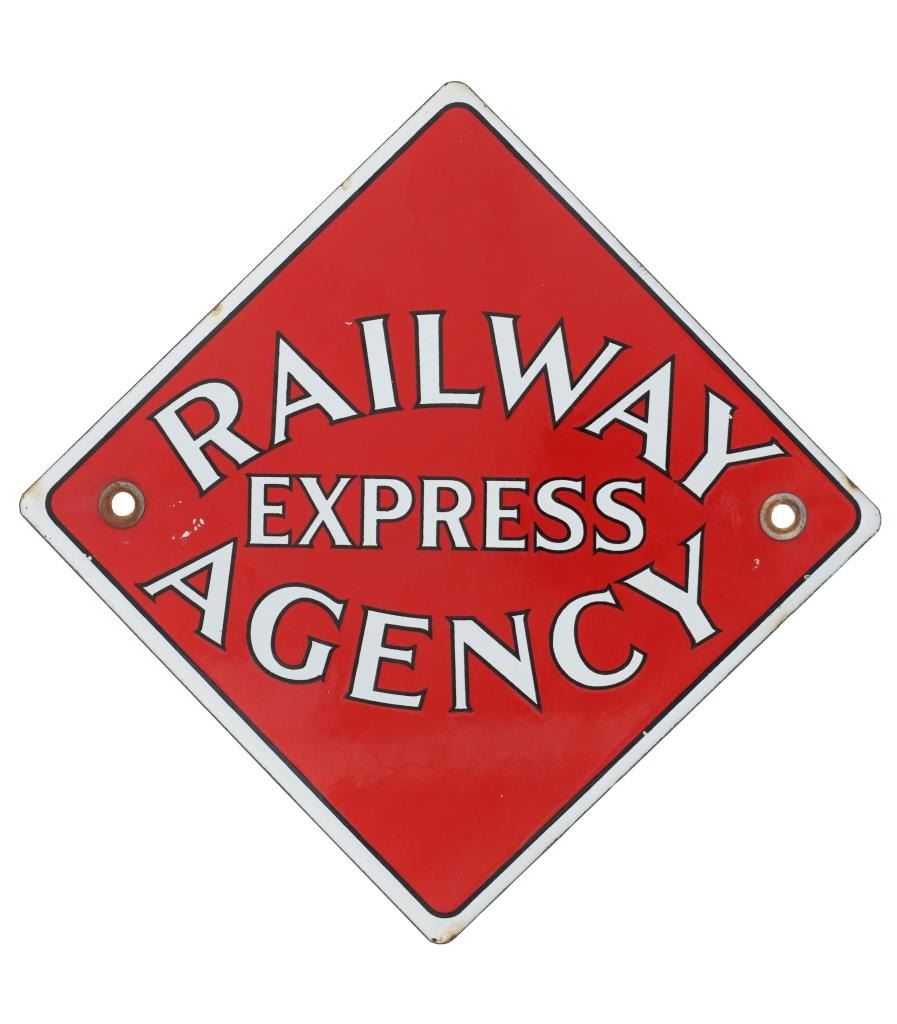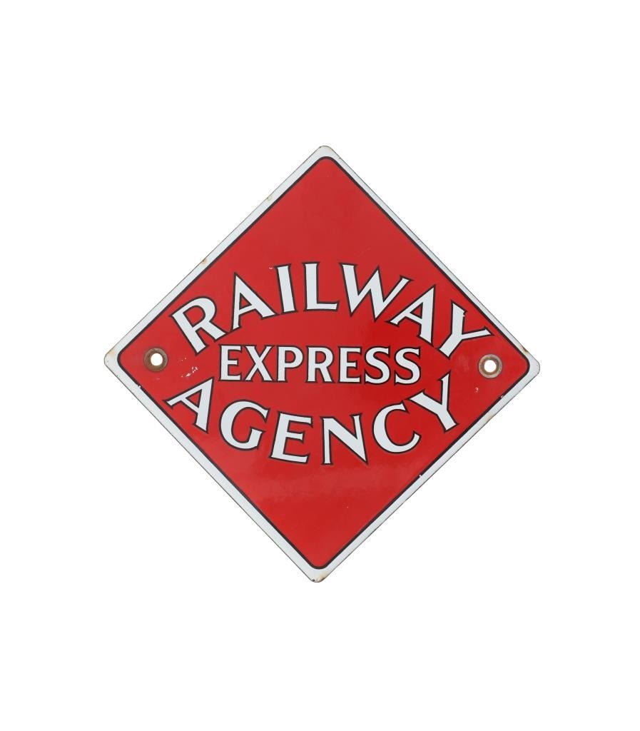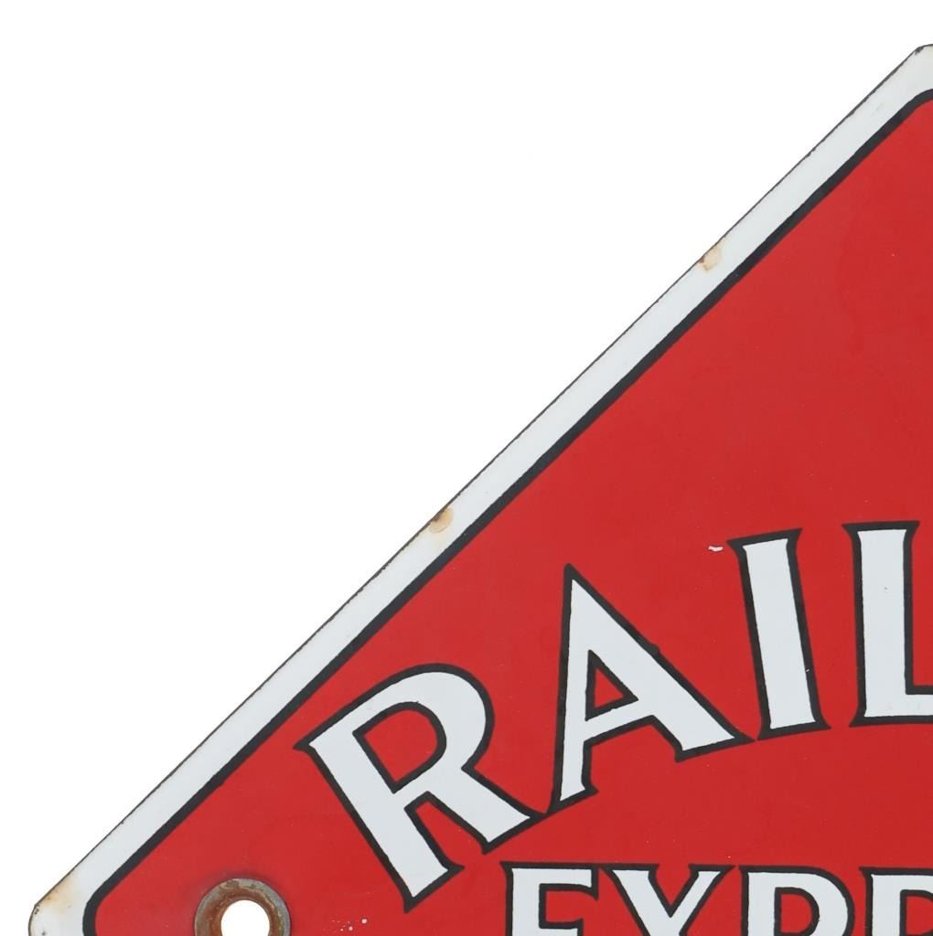 For your consideration is this Railway Express Agency porcelain enamel depot sign circa 1930s. From 1918 until 1975, the Railway Express Agency (REA), formerly known as the American Railway Express Agency and subsequently renamed the American Railway Express Inc., provided nationwide package delivery services throughout the United States. Similar to how modern UPS and DHL companies use roads and air travel, REA arranged transport and delivery via the already-existing railroad infrastructure. During World War I, it was established by forcibly combining pre-existing services into a nationwide quasi-monopoly to guarantee the quick and secure delivery of packages, cash, and merchandise. In March 1929, the assets and operations of American Railway Express Inc. were transferred to Railway Express Agency (REA). REA was owned by 86 railroads in proportion to the express traffic on their lines; no one railroad or group of railroads controlled the agency. In response to customer demand, REA added a Chicago, Illinois-based refrigerator car line. In 1927, REA began an Air Express Division. REA ceased operations in 1975, when its business model ceased to be viable. The sign shows a diamond shape and a red background with white lettering reading, "Railway Express Agency". There are two mounting holes, one on the left and one on the right. The sign shows good condition overall with some slight wear present, but no obvious signs of damage. The sign measures 11 1/8" L x 11 1/8" W and weighs 1 pound and 2 ounces.