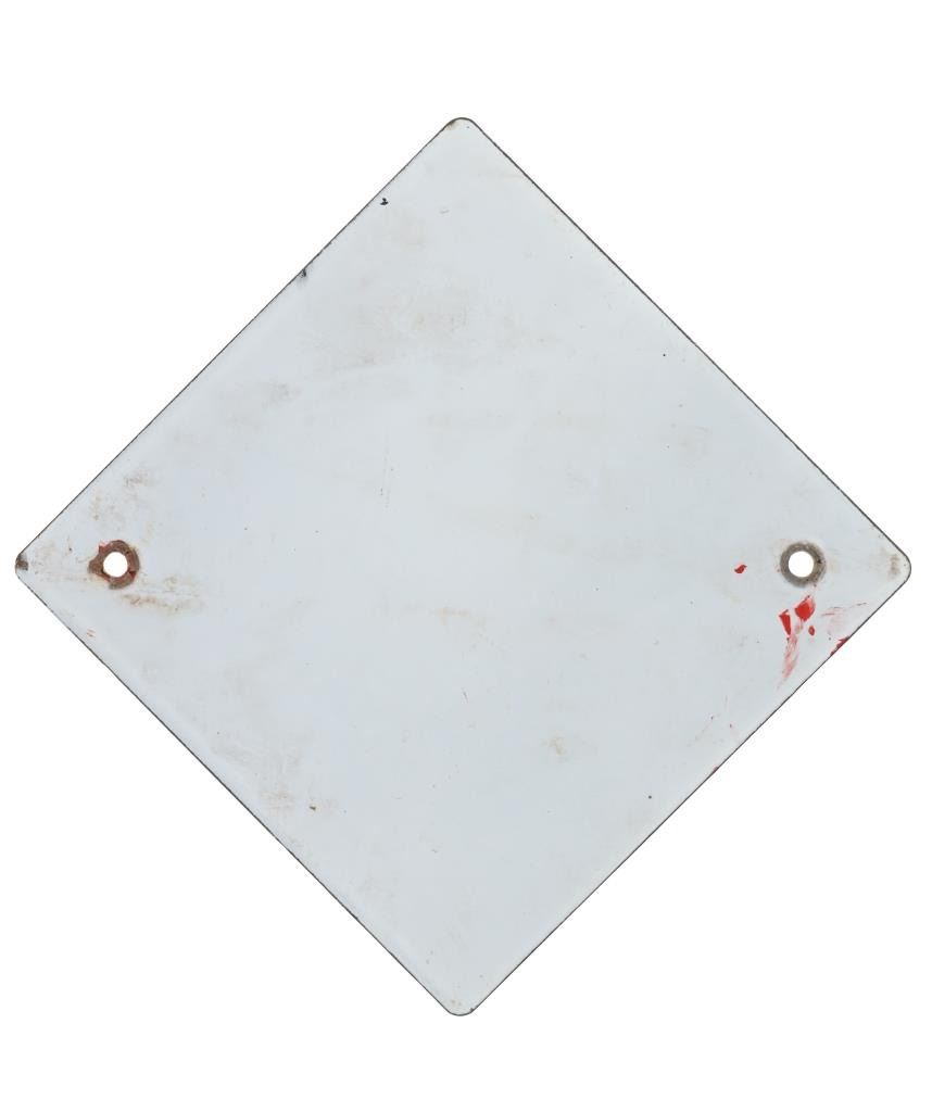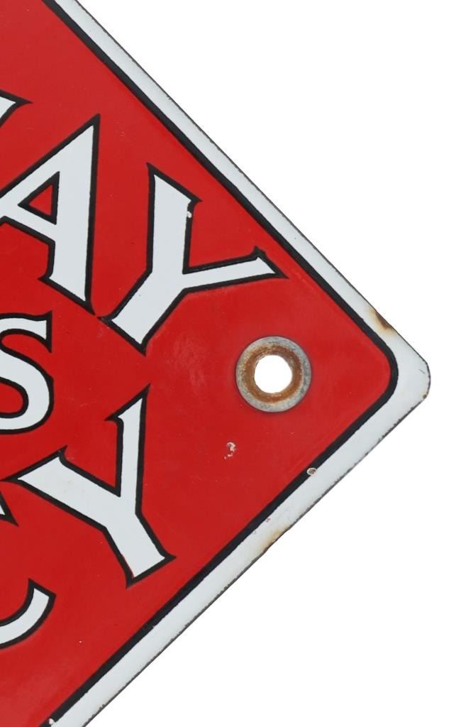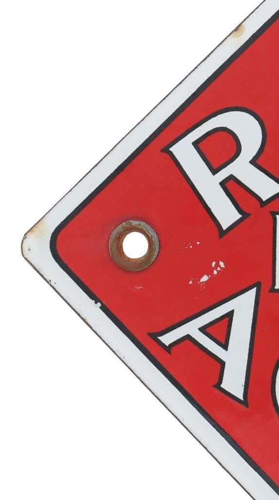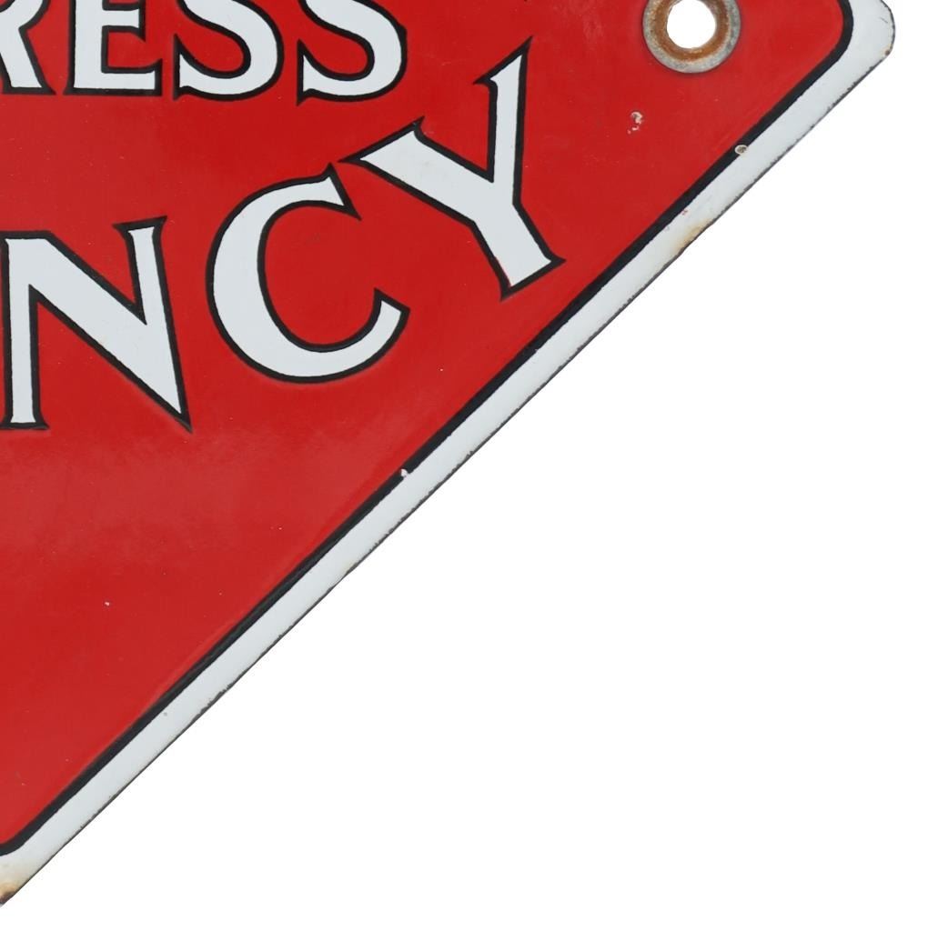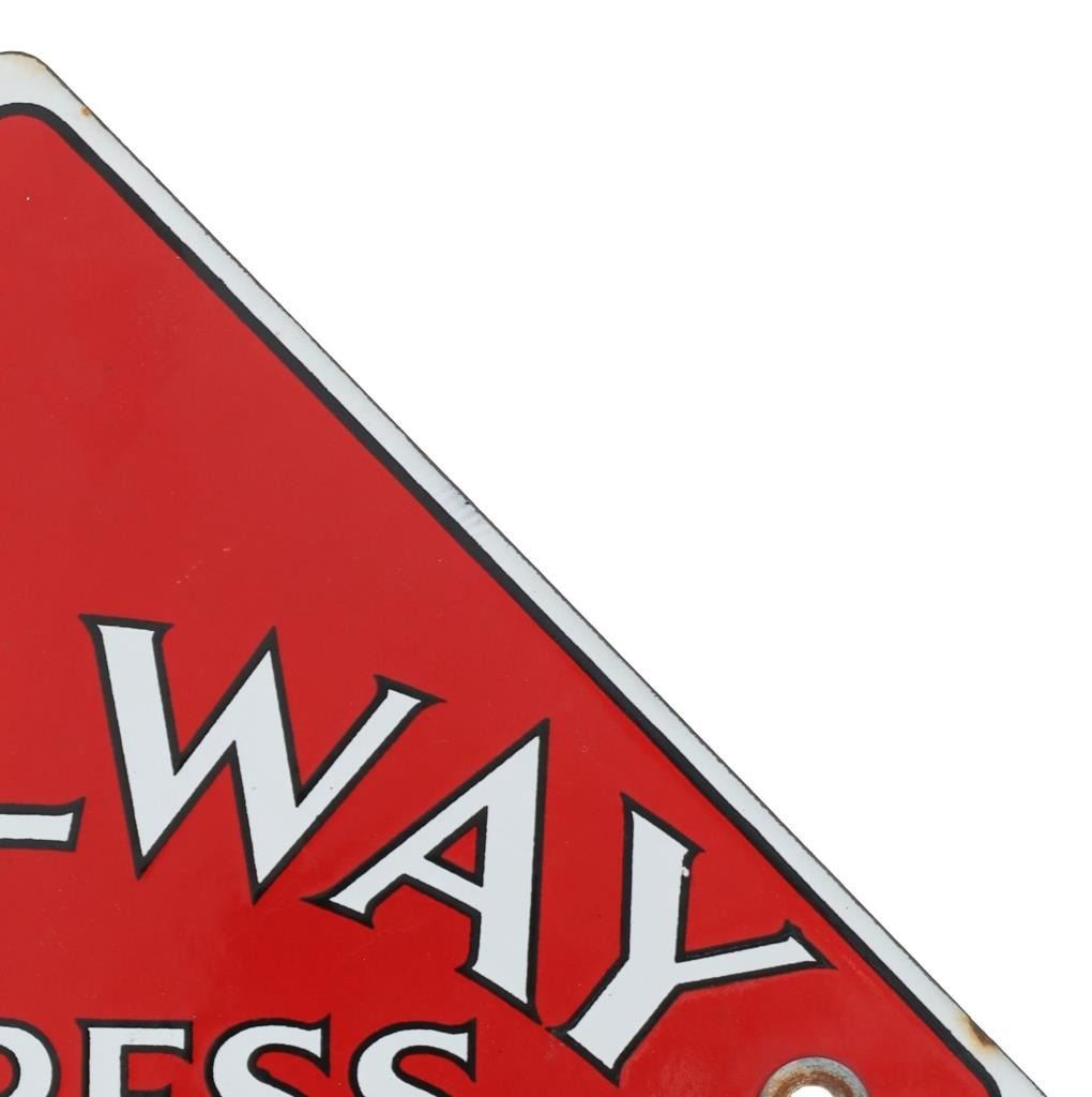 For your consideration is this Railway Express Agency porcelain enamel depot sign circa 1930s. From 1918 until 1975, the Railway Express Agency (REA), formerly known as the American Railway Express Agency and subsequently renamed the American Railway Express Inc., provided nationwide package delivery services throughout the United States. Similar to how modern UPS and DHL companies use roads and air travel, REA arranged transport and delivery via the already-existing railroad infrastructure. During World War I, it was established by forcibly combining pre-existing services into a nationwide quasi-monopoly to guarantee the quick and secure delivery of packages, cash, and merchandise. In March 1929, the assets and operations of American Railway Express Inc. were transferred to Railway Express Agency (REA). REA was owned by 86 railroads in proportion to the express traffic on their lines; no one railroad or group of railroads controlled the agency. In response to customer demand, REA added a Chicago, Illinois-based refrigerator car line. In 1927, REA began an Air Express Division. REA ceased operations in 1975, when its business model ceased to be viable. The sign shows a diamond shape and a red background with white lettering reading, "Railway Express Agency". There are two mounting holes, one on the left and one on the right. The sign shows good condition overall with some slight wear present, but no obvious signs of damage. The sign measures 11 1/8" L x 11 1/8" W and weighs 1 pound and 2 ounces.