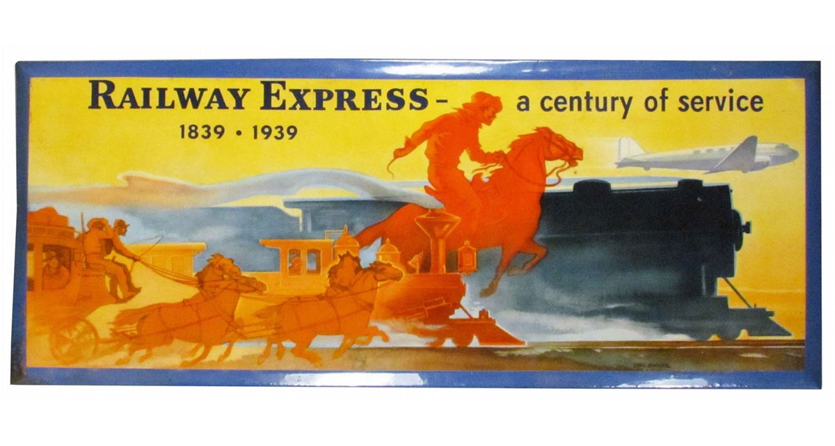 Railway Express Self Framed Celluloid Sign. "A Century of Service 1839-1939" Carl Burger artist. Some discoloration around perimeter edges and crease at 9:00 edge otherwise very good condition. 28 1/2 X 11 3/4 inches.