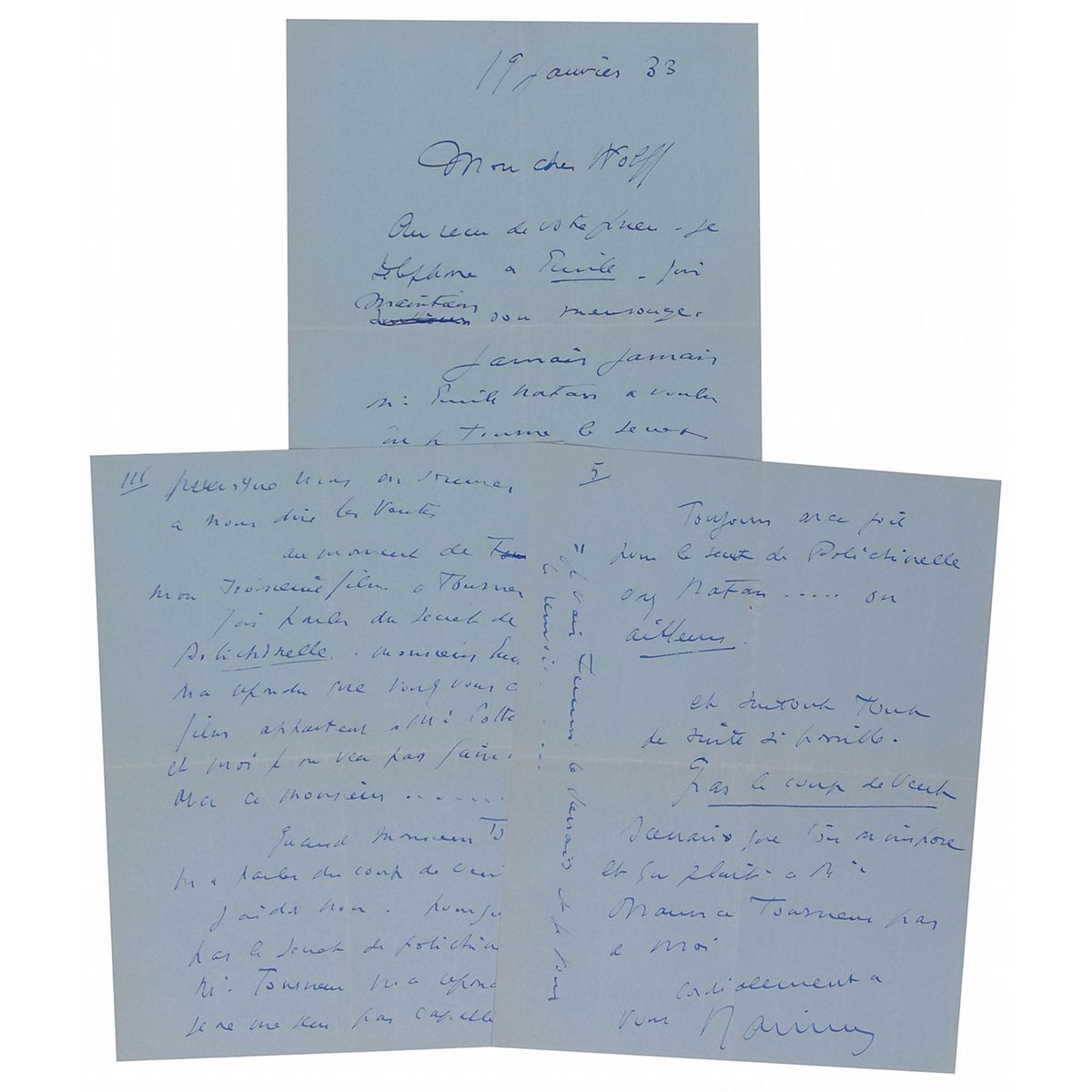 Famous French actor (1883–1946) thought to be one of the foremost practitioners of his craft by the likes of Orson Welles and Marlene Dietrich. ALS in French, five pages on three sheets, 8.25 x 10.5, January 19, 1933. Letter to actor Pierre Wolff related to his play Le secret de Polichinelle, which Raimu would like to adapt for the screen. He goes on to describe an argument he had with Emile Natan, and discusses his films for 1933. In fine condition, with central vertical and horizontal folds.