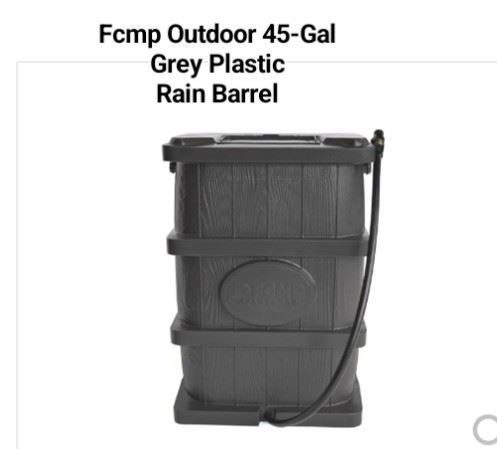 Fcmp Outdoor, 45-gallon capacity for rainwater collection, durable grey plastic, new.
