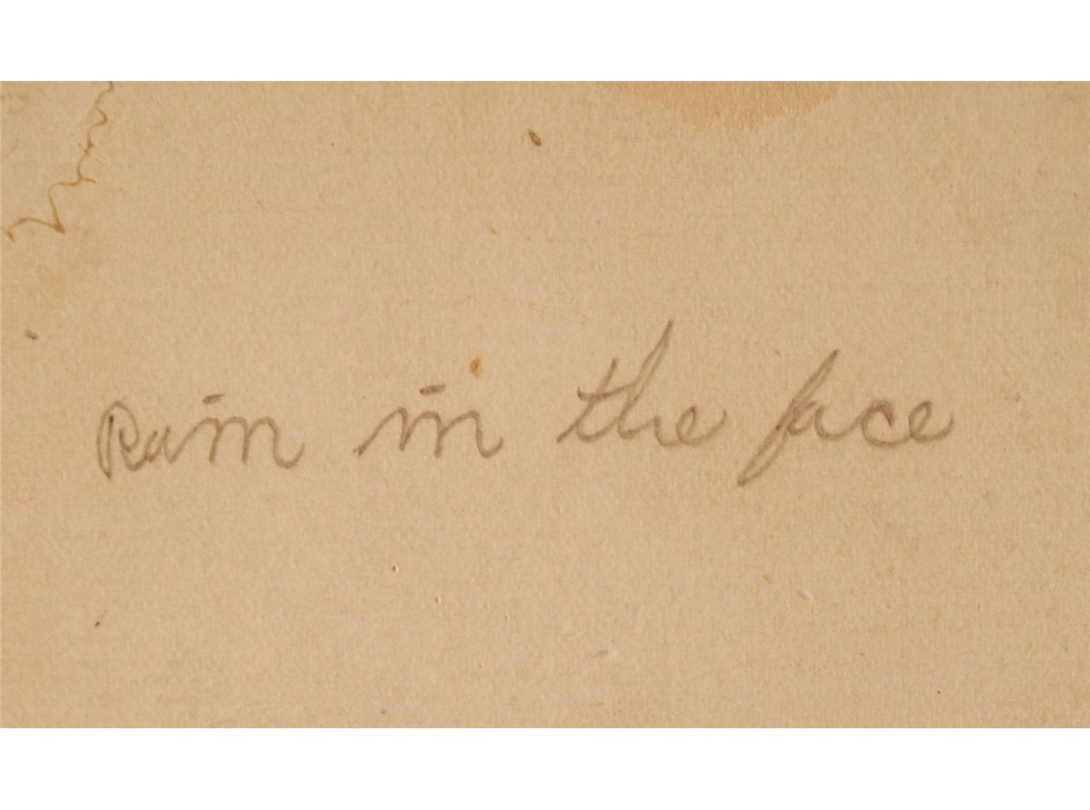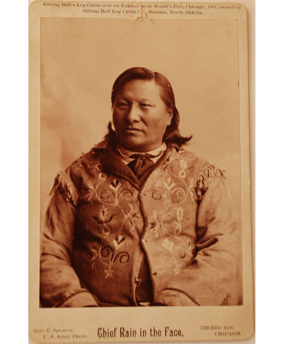 One of the most feared and respected Native American warriors of the late 19th century. A Hunkpapa Lakota, he was born in about 1835. His name may have been a result of a fight when he was a boy in which his face was splattered like rain with his Cheyenne adversary's blood. He has often been linked to the death of General George Custer, the United States Cavalry hero, at his defeat at the Battle of Little Bighorn in Montana in 1876. There is much argument about who actually killed Custer. The general's wife believed that Rain in the Face dealt the death blow and the American poet Longfellow wrote about his deeds in ‘The Revenge of Rain in the Face.’ Original 4.25 x 6.5 half-length cabinet photo of Chief Rain In The Face in a jacket and tie, imprinted in the lower border "Geo. E. Spencer, U.S. Army Photo, 7420 Ellis Ave. Chicago,” and “Sitting Bull's Log Cabin now on Exhibition at World's Fair, Chicago, 1893, owned by Sitting Bull Log Cabin Co., Mandan, North Dakota,” printed along the top edge. Signed on the reverse in pencil, “Rain in the Face.” In very good condition, with scattered surface marks and rubbing to image, a litlle area in top center affecting written caption, does not affect photograph, scattered light soiling to borders, and scattered soiling to reverse. Rain in the Face signed this rare cabinet photograph at the 1893 Columbian Exposition (World’s Fair) in Chicago, Illinois. The Hunkpapa Lakota Sioux chief was a participant in one of the cultural villages on exhibition at the fair meant to represent peoples from around the world. The Indian exhibit included ‘Sitting Bull’s Cabin,’ the actual cabin in which the Sioux chief died. A contemporary description of the Exposition said of the scene: “Sitting Bull’s Cabin was filled with a number of Indians, including Rain-in-the-Face. War dances were given daily.” Acknowledged as the grandest exhibition of the time, the 1893 World’s Fair was attended by 27 million people, nearly half of the U.S. population. Rain in the Face and his band had surrendered in 1880, after which he lived on the Standing Rock Reservation in North Dakota. He died in 1905 on the reservation after a protracted illness. An extremely rare signed photograph, one of a very few known examples