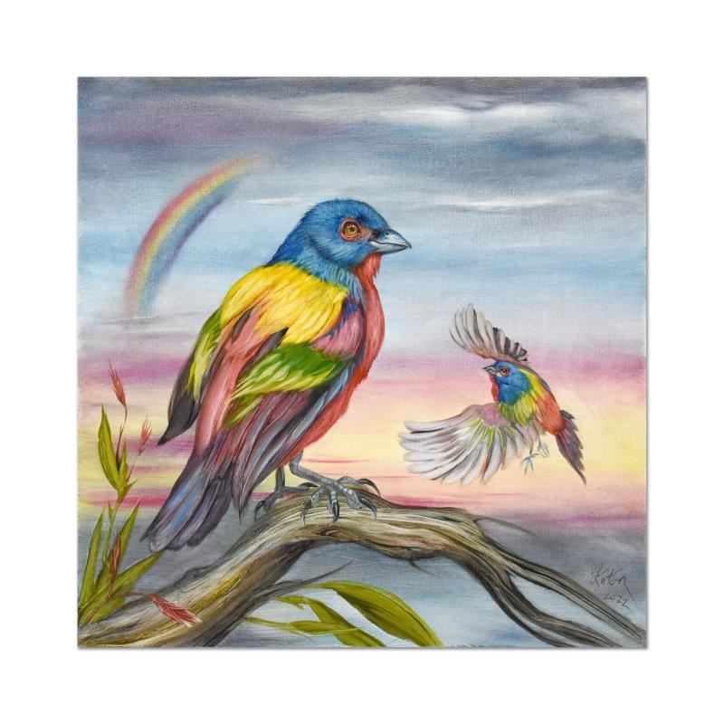 Rainbow Buntings by Katon Original. Please see photos and description for all available information. "Rainbow Buntings" is an original oil painting on stretched canvas by Martin Katon, hand signed by the artist. Includes Letter of Authenticity. Measures approx. 20" x 20" (image).