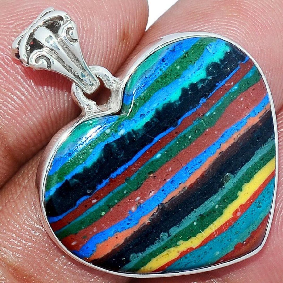 Rainbow calsilica created stone, set into a heart shaped sterling silver pendant.1 3/8" L. 6 grams weight, stone & silver. Rainbow calsilica is a man-made material created from carbonate rock (aka calcite or powdered limestone) & plastic set in resin & colored by artificial coloring pigments.