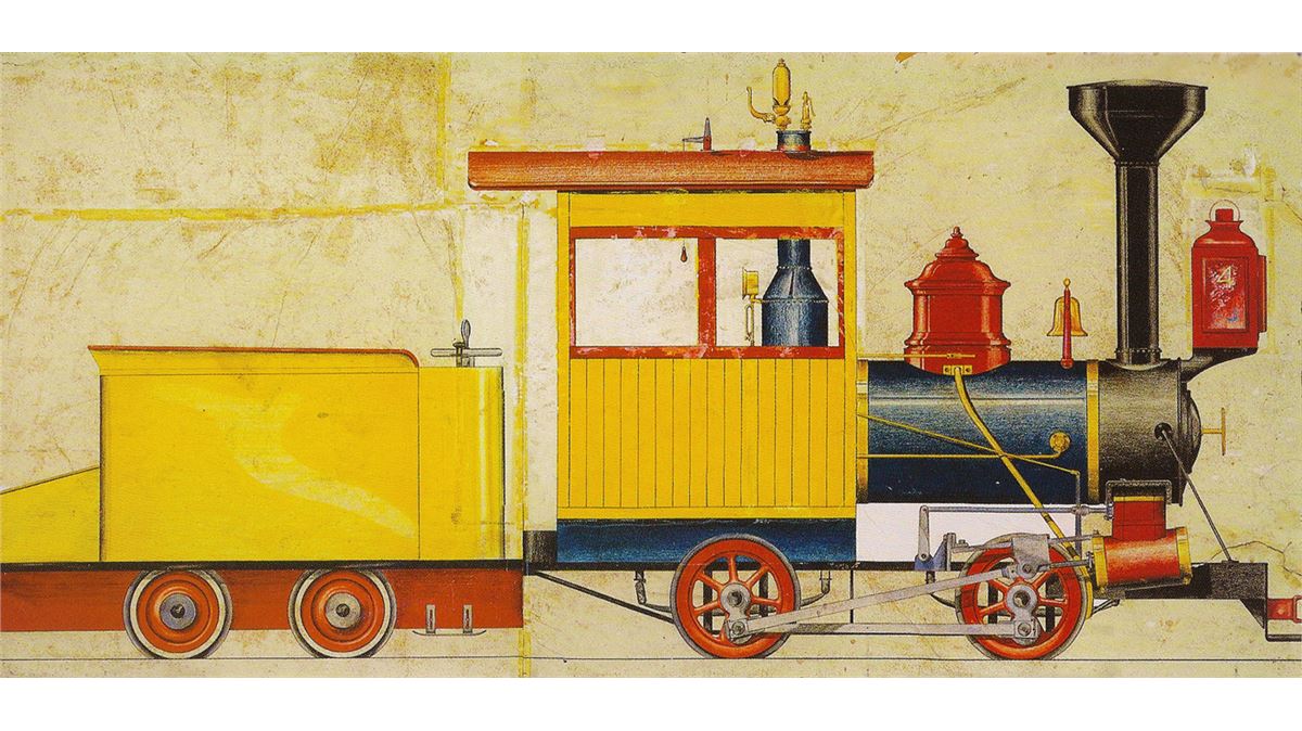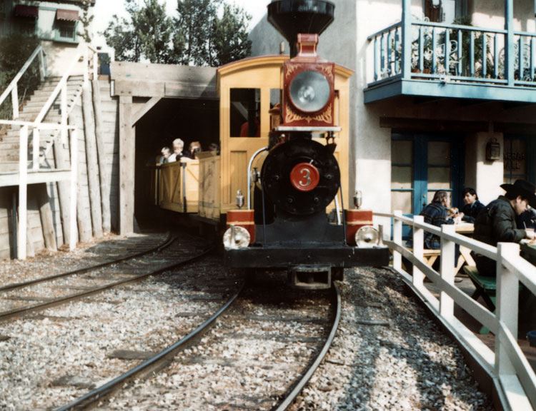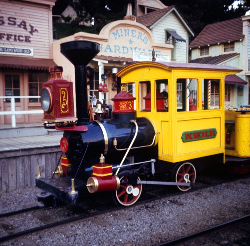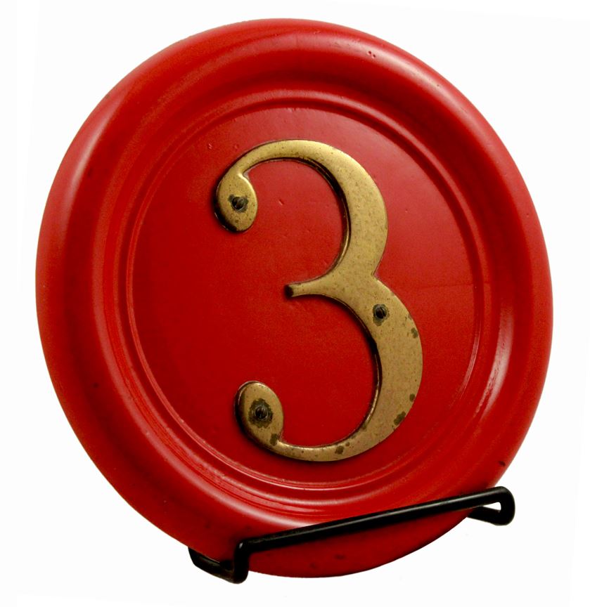 (Disneyland, 1956) Original badge prop from the #3 mine train on the Rainbow Caverns and later the Natures Wonderland attractions. This heavy porcelain steel badge with riveted brass numeral adorned the front of the locomotive. In very good condition overall.