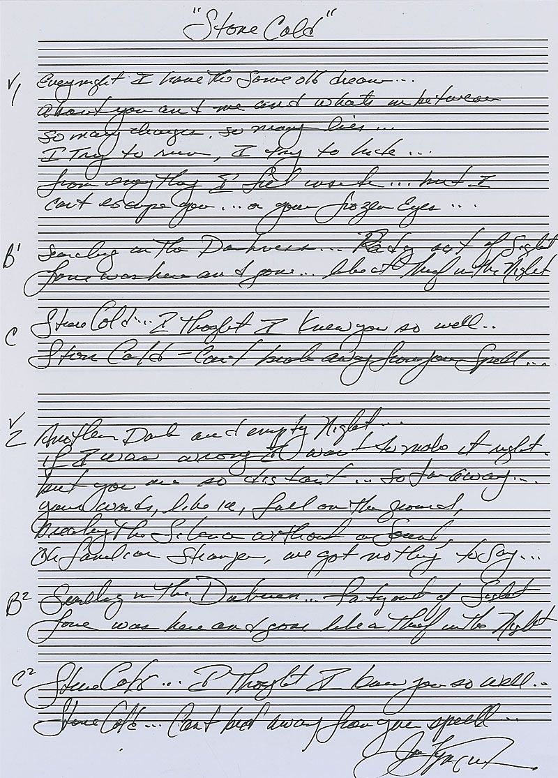 Souvenir handwritten lyrics to the entirety of ‘Stone Cold’ on an white 8 x 11 musically-lined sheet, written out by Turner and signed at the conclusion. The lyrics begin: “Every night I have the same old dream / About you and me and what's in between.” In fine condition.