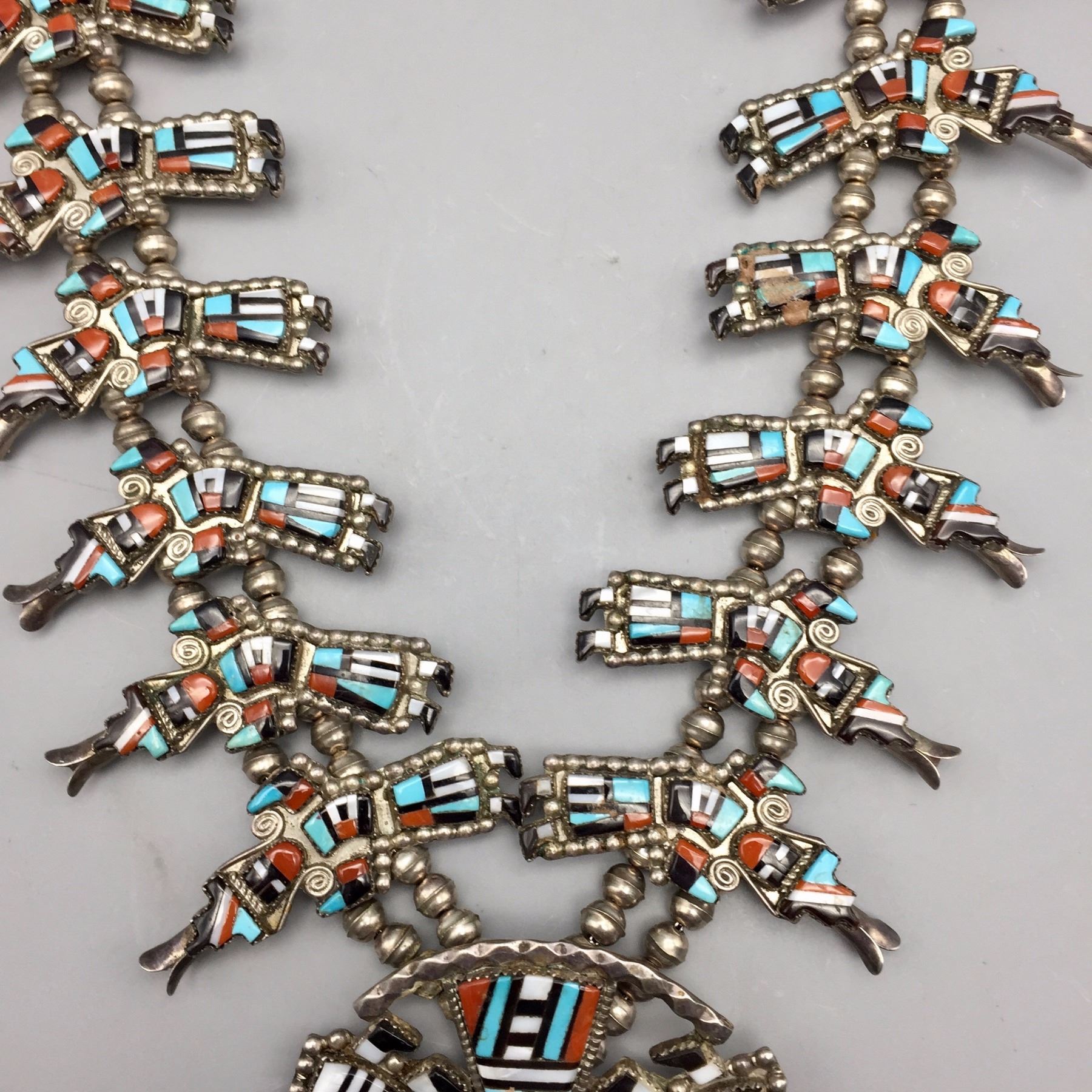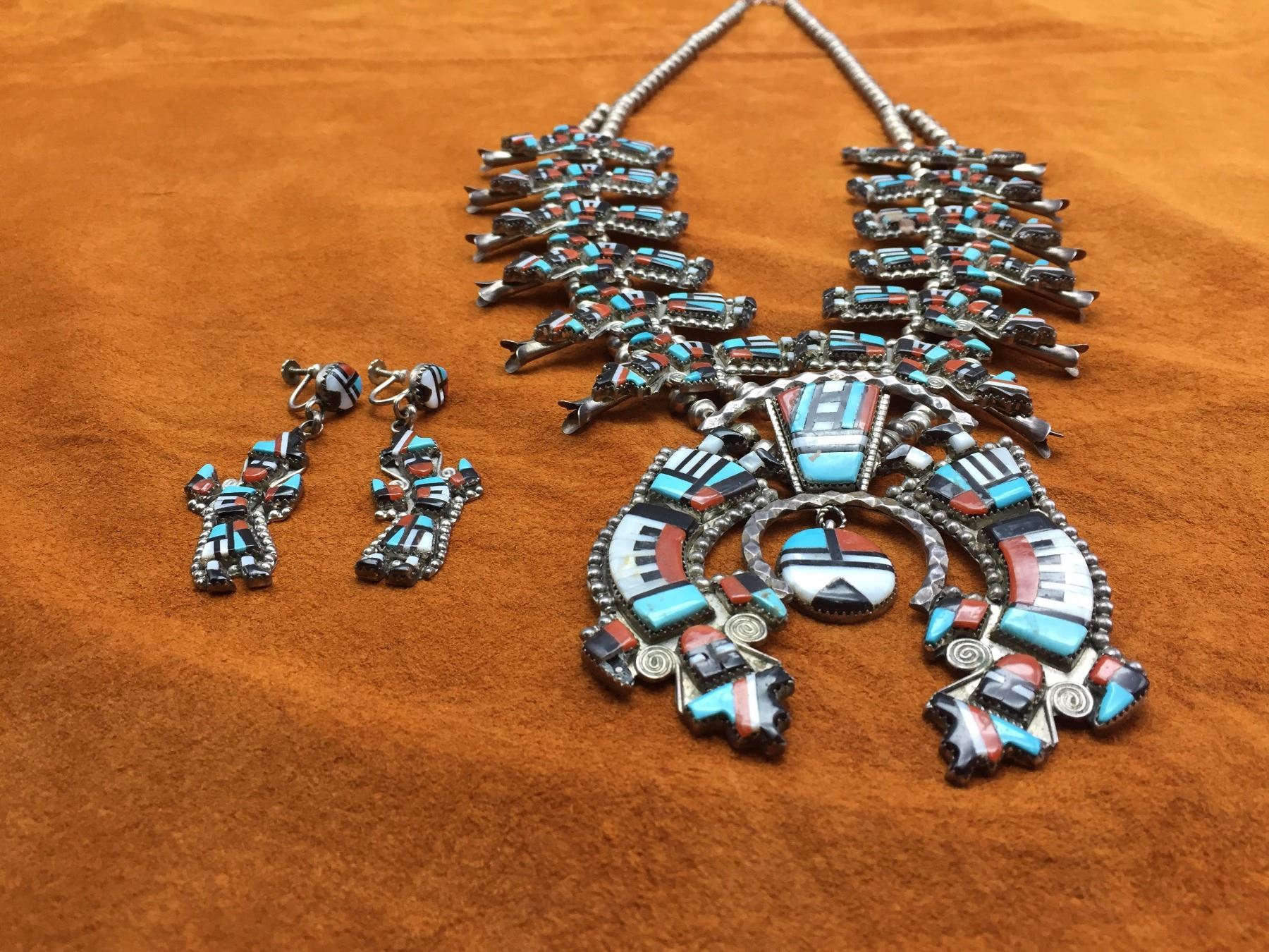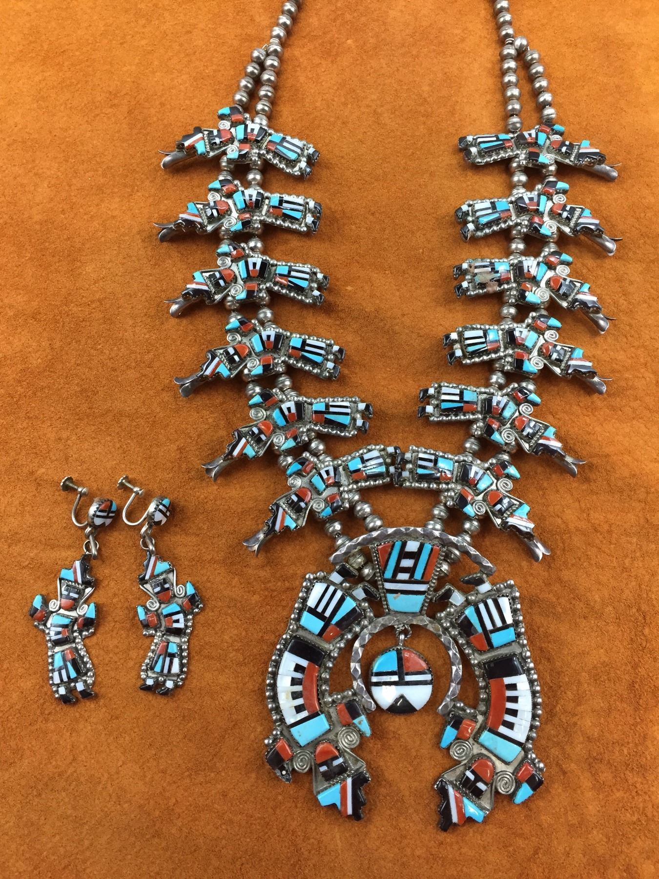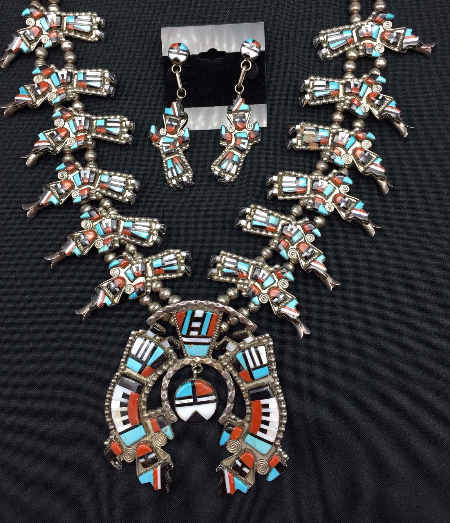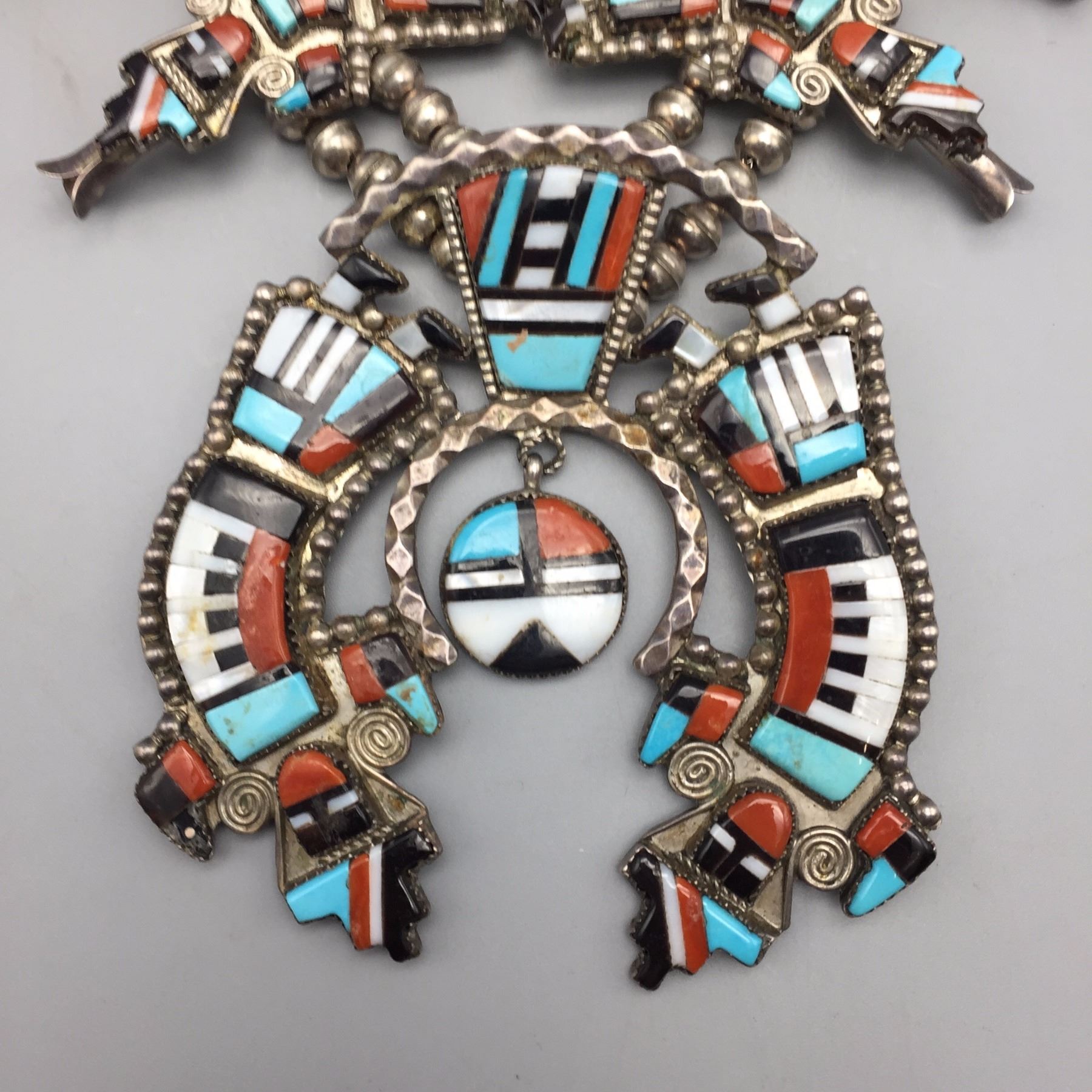 Maker: Herbert and Ester Cellicon, Zuni. Approx. Age: Circa 1960s. Size: Fits about 26” around the neck. Naja is an additional 3 1/4” wide and 3 1/2” h. Earrings are about 3/4” at their widest and dangle just over 2 1/2”. Weighs 192.6 g. Additional Info: Statement necklace by known makers! A Rainbow Man design. Made of turquoise, coral, MOP and onyx inlay set in hand-embellished sterling silver. Necklace is made of sterling silver beads. Earrings are screw-backs. Condition: Good for their age, normal wear expected. Please look closely at the pictures - they are an important part of our description. Shipping: There will be a $7 handling / packaging fee for shipping this lot. The actual cost of postage will be added on top of that.
