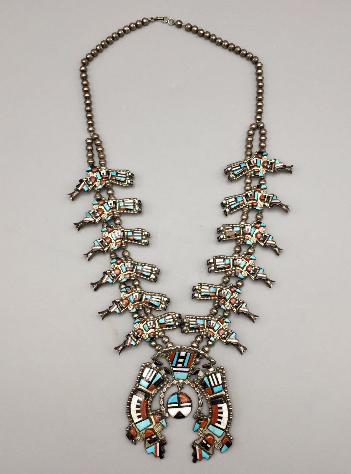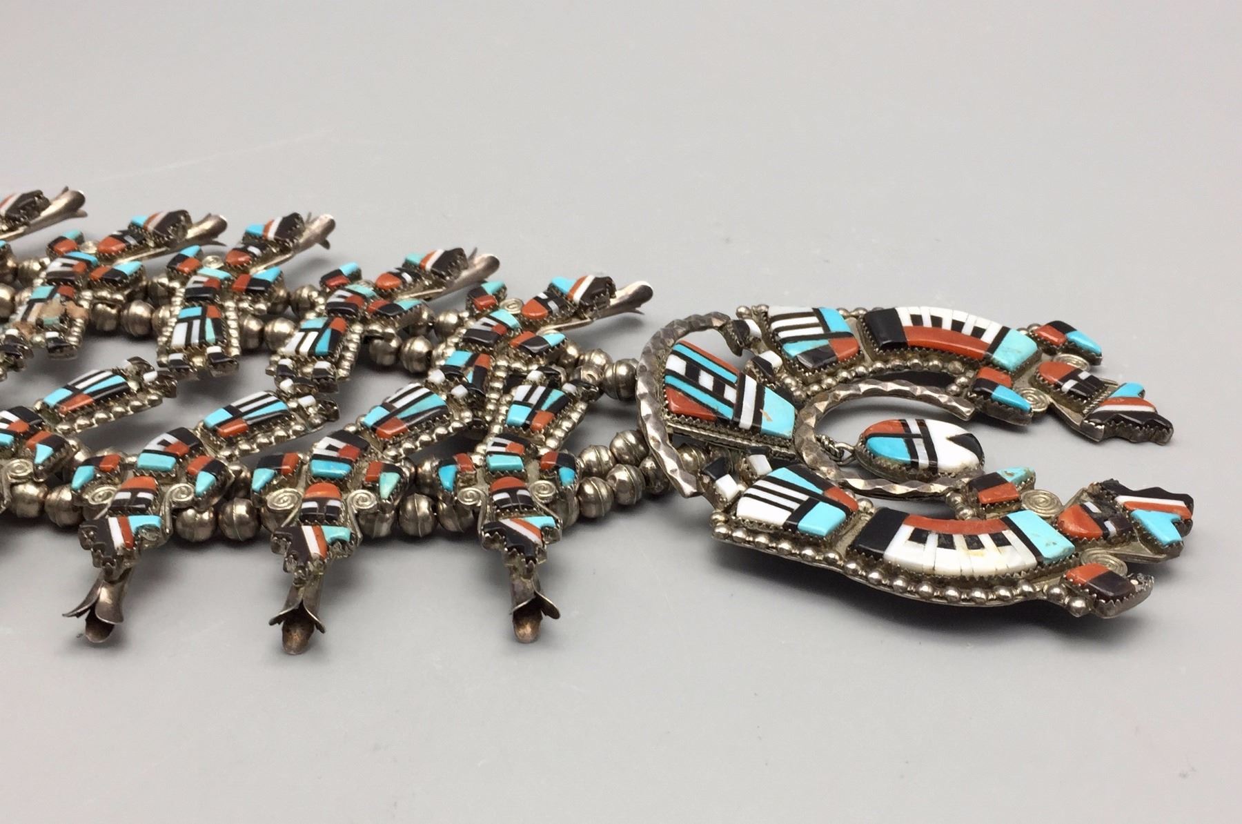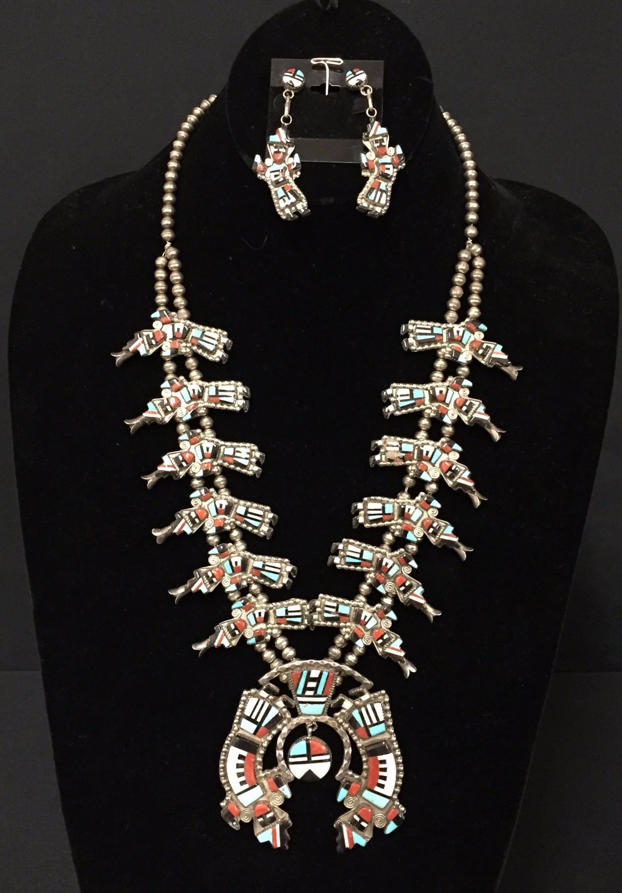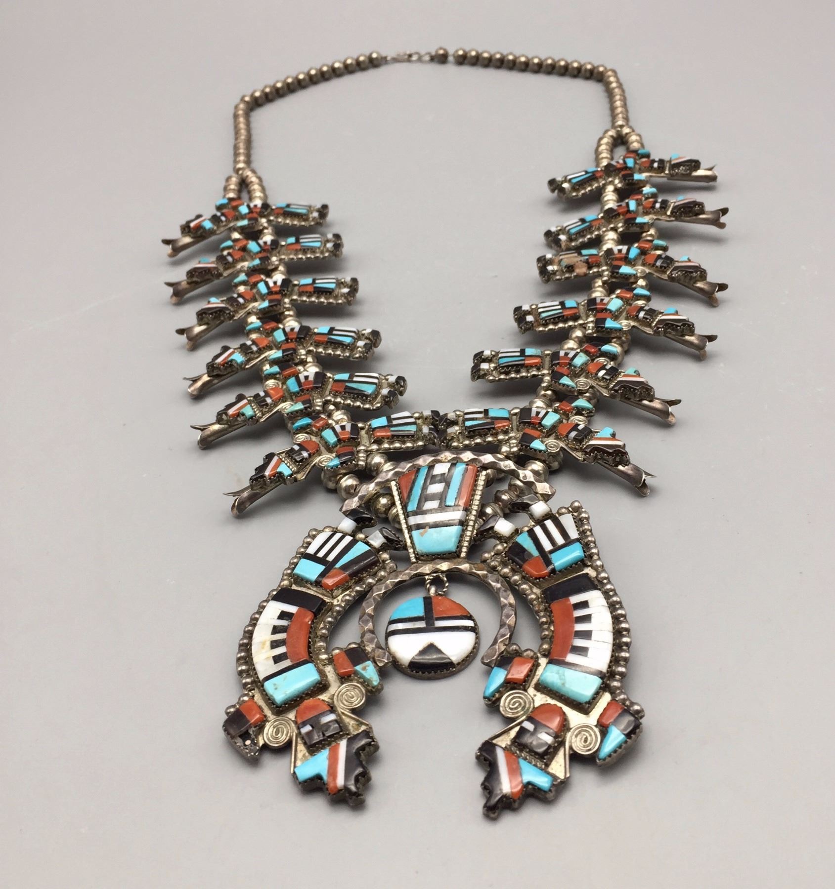 Maker: Herbert and Ester Cellicon, Zuni. Approx. Age: Circa 1960s. Size: Fits about 26” around the neck. Naja is an additional 3 1/4” wide and 3 1/2” h. Earrings are about 3/4” at their widest and dangle just over 2 1/2”. Weighs 192.6 g. Additional Info: Statement necklace by known makers! A Rainbow Man design. Made of turquoise, coral, MOP and onyx inlay set in hand-embellished sterling silver. Necklace is made of sterling silver beads. Earrings are screw-backs. Condition: Good for their age, normal wear expected. Please look closely at the pictures - they are an important part of our description. Shipping: There will be a $7 handling / packaging fee for shipping this lot. The actual cost of postage will be added on top of that.
