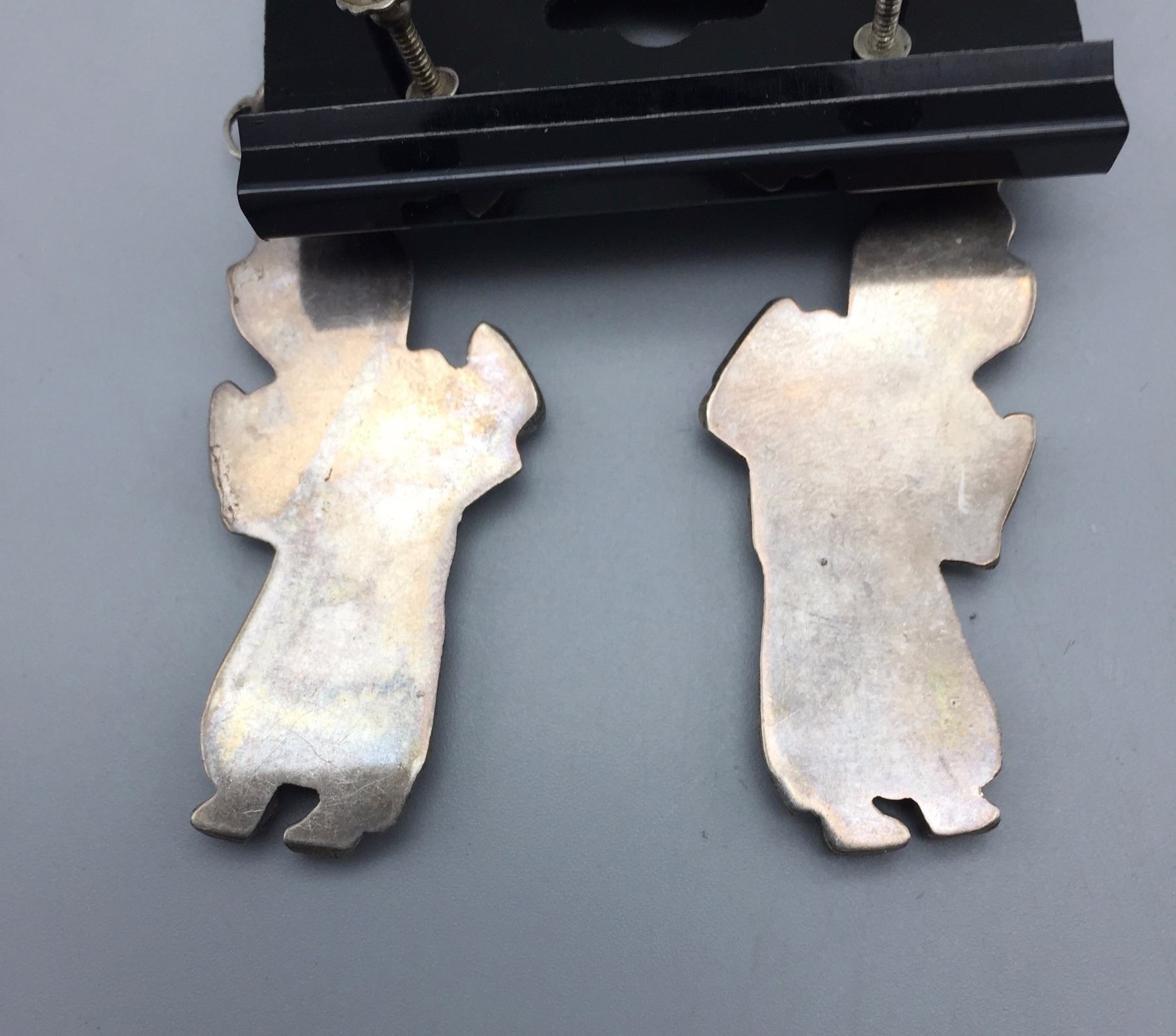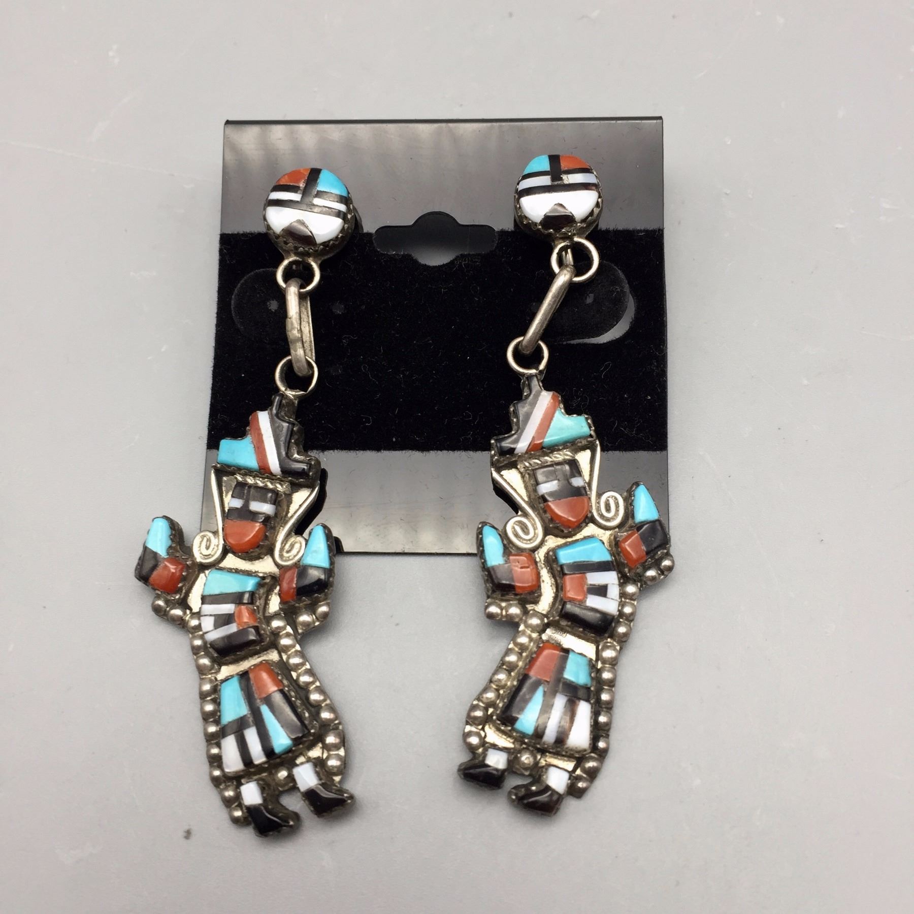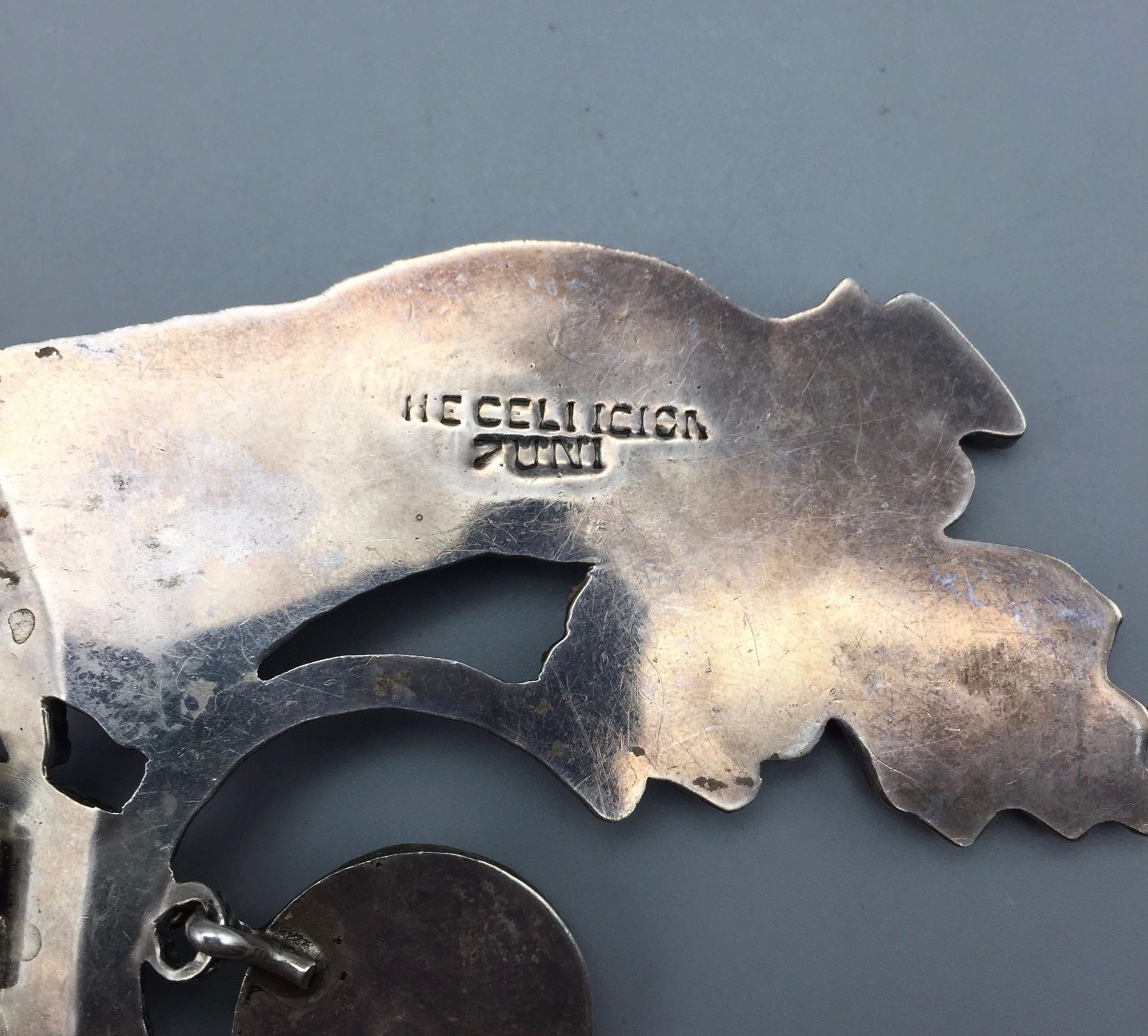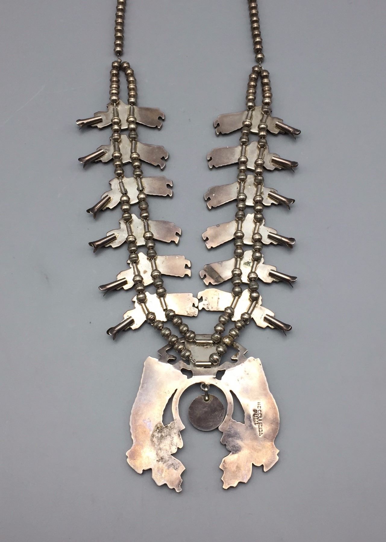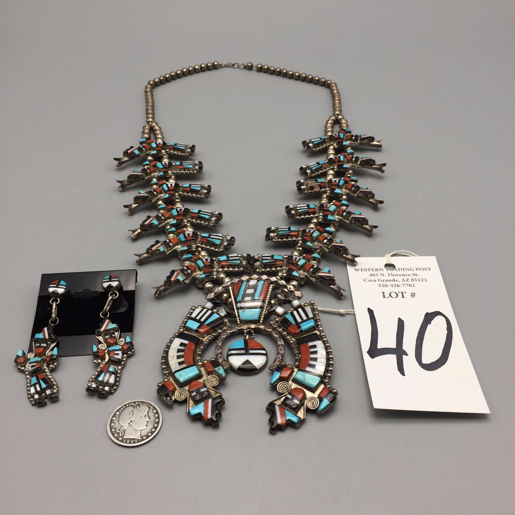 Maker: Herbert and Ester Cellicon, Zuni. Approx. Age: Circa 1960s. Size: Fits about 26” around the neck. Naja is an additional 3 1/4” wide and 3 1/2” h. Earrings are about 3/4” at their widest and dangle just over 2 1/2”. Weighs 192.6 g. Additional Info: Statement necklace by known makers! A Rainbow Man design. Made of turquoise, coral, MOP and onyx inlay set in hand-embellished sterling silver. Necklace is made of sterling silver beads. Earrings are screw-backs. Condition: Good for their age, normal wear expected. Please look closely at the pictures - they are an important part of our description. Shipping: There will be a $7 handling / packaging fee for shipping this lot. The actual cost of postage will be added on top of that.