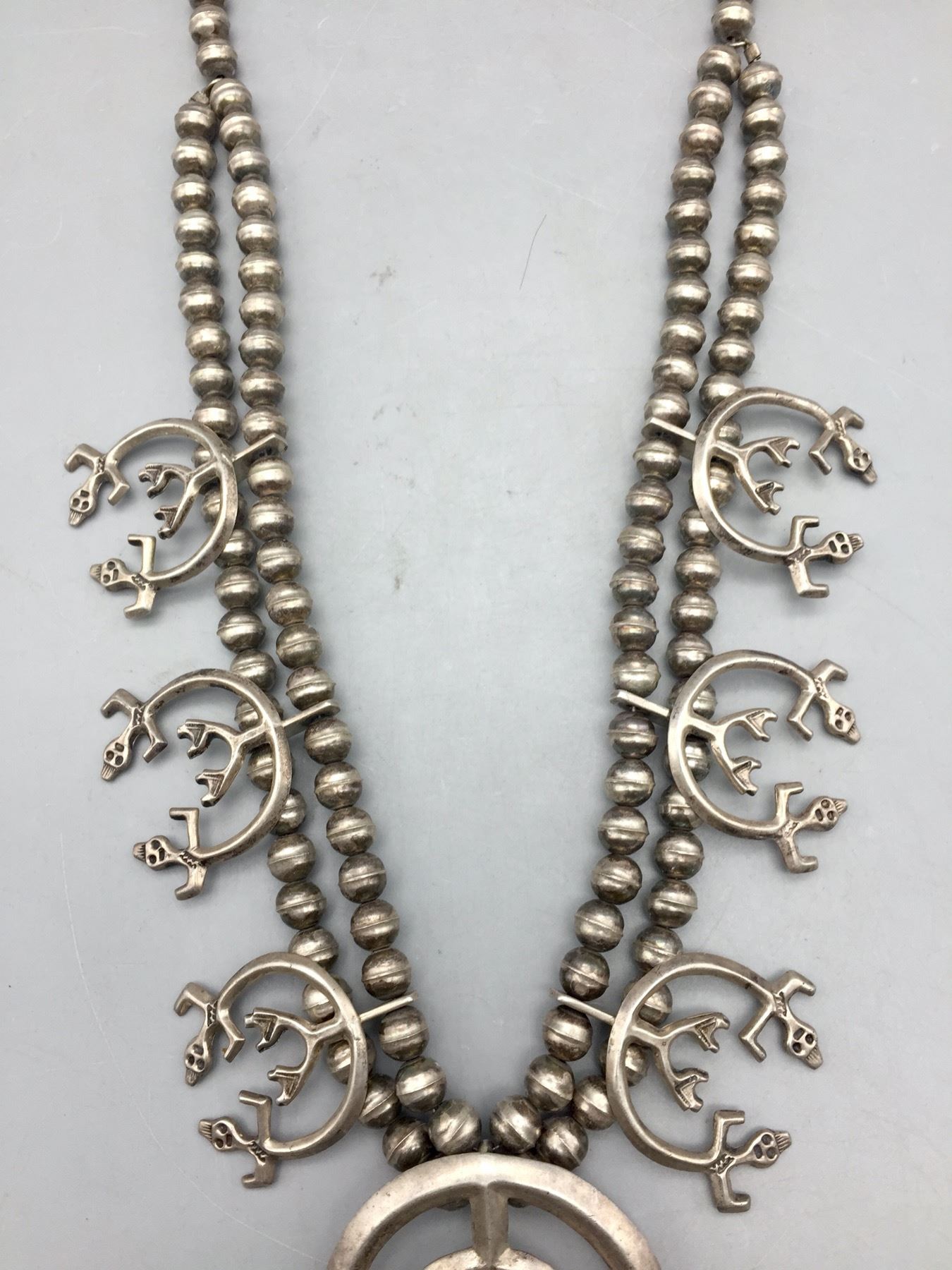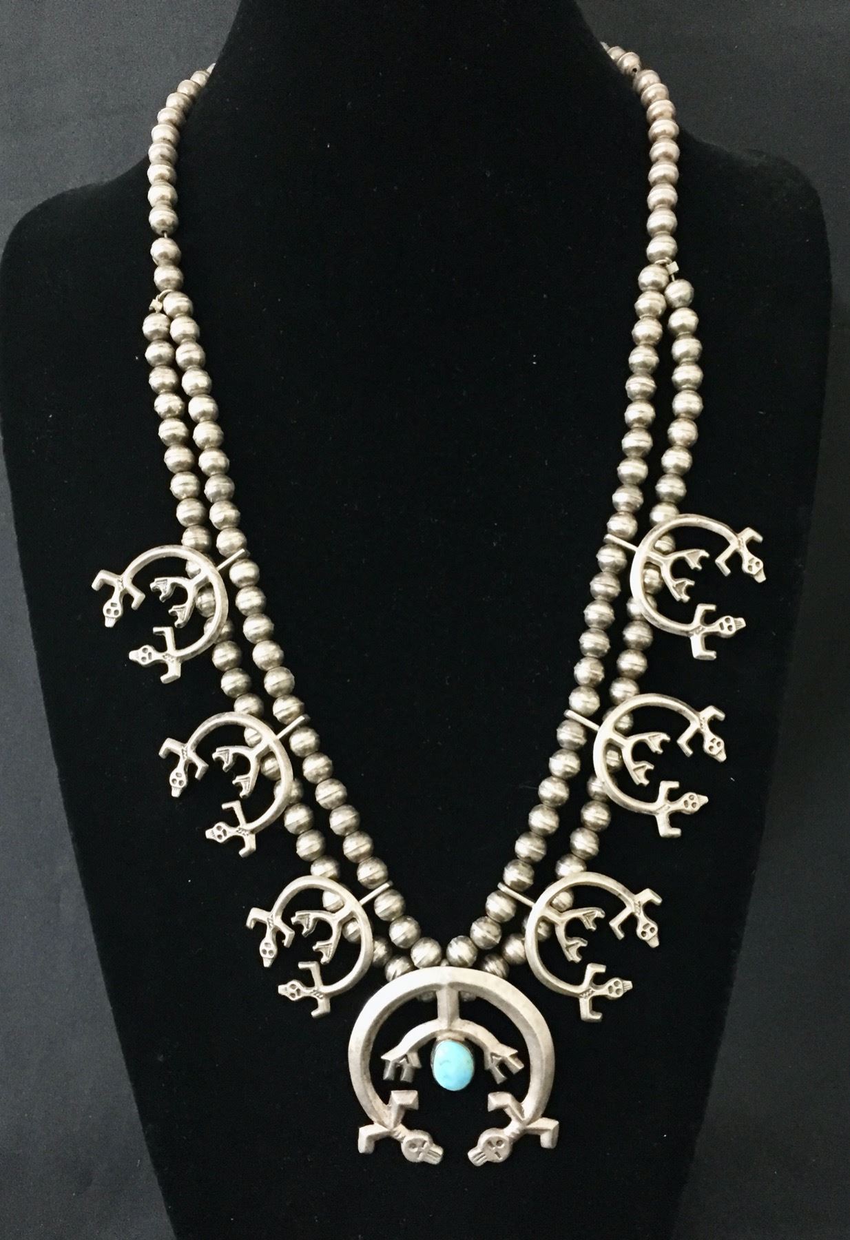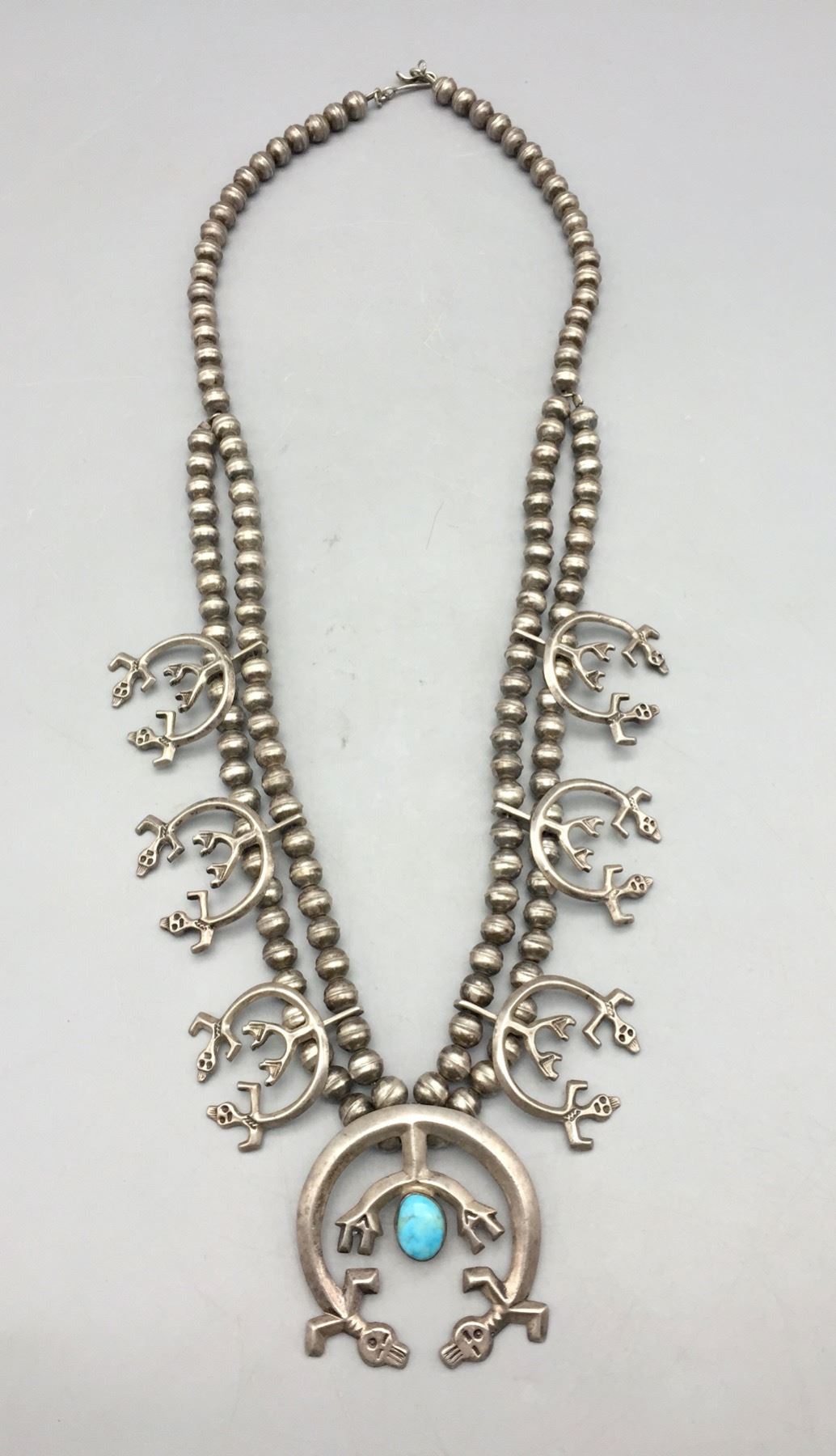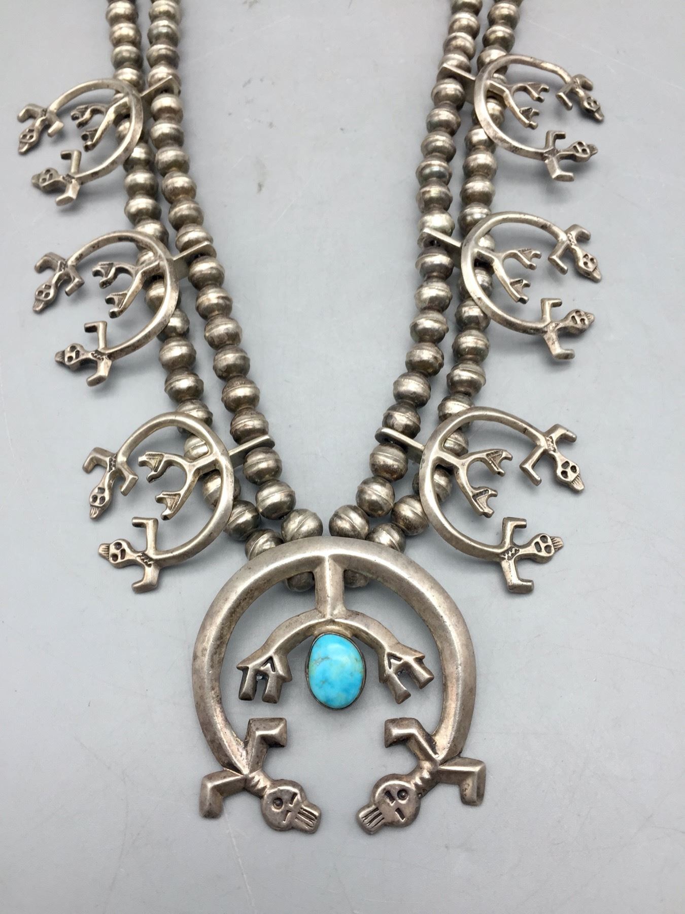 Description: For sale in this lot we have a unique rainbow man style squash blossom necklace. It features a turquoise stone in the naja and each “blossom” depicts a double figure. It is sterling silver.                                                                                         Maker: Unmarked.                                                                                                                  Approx. Age: Vintage to modern.                                                                                                            Size: Fits approx. a 27 inch neck. Naja measures 2-1/8 inches wide x 2-1/8 inches long. Weighs 146.4 grams.                                                                                                                                                                                                                                  Condition: Good for its age, normal wear expected.                                                                                                                Please look closely at the pictures - they are an important part of our description.                                Shipping: There will be a $5 handling, packaging fee for shipping this lot. The actual cost of postage will be added on top of that.