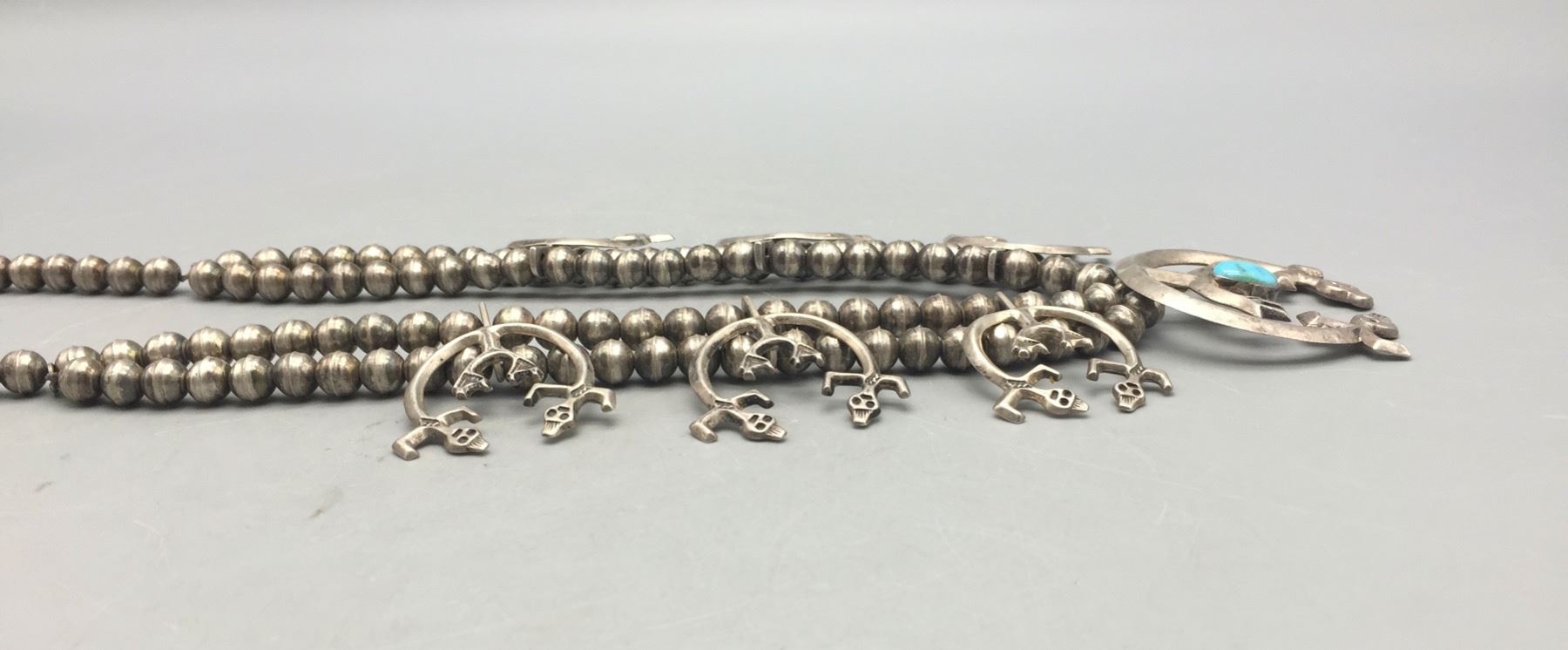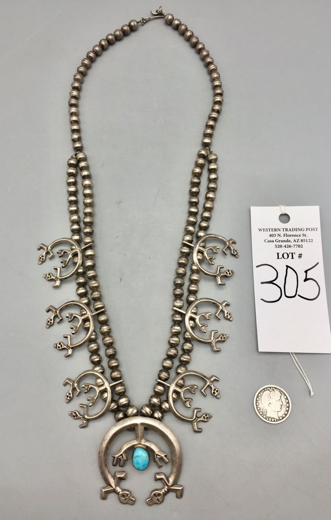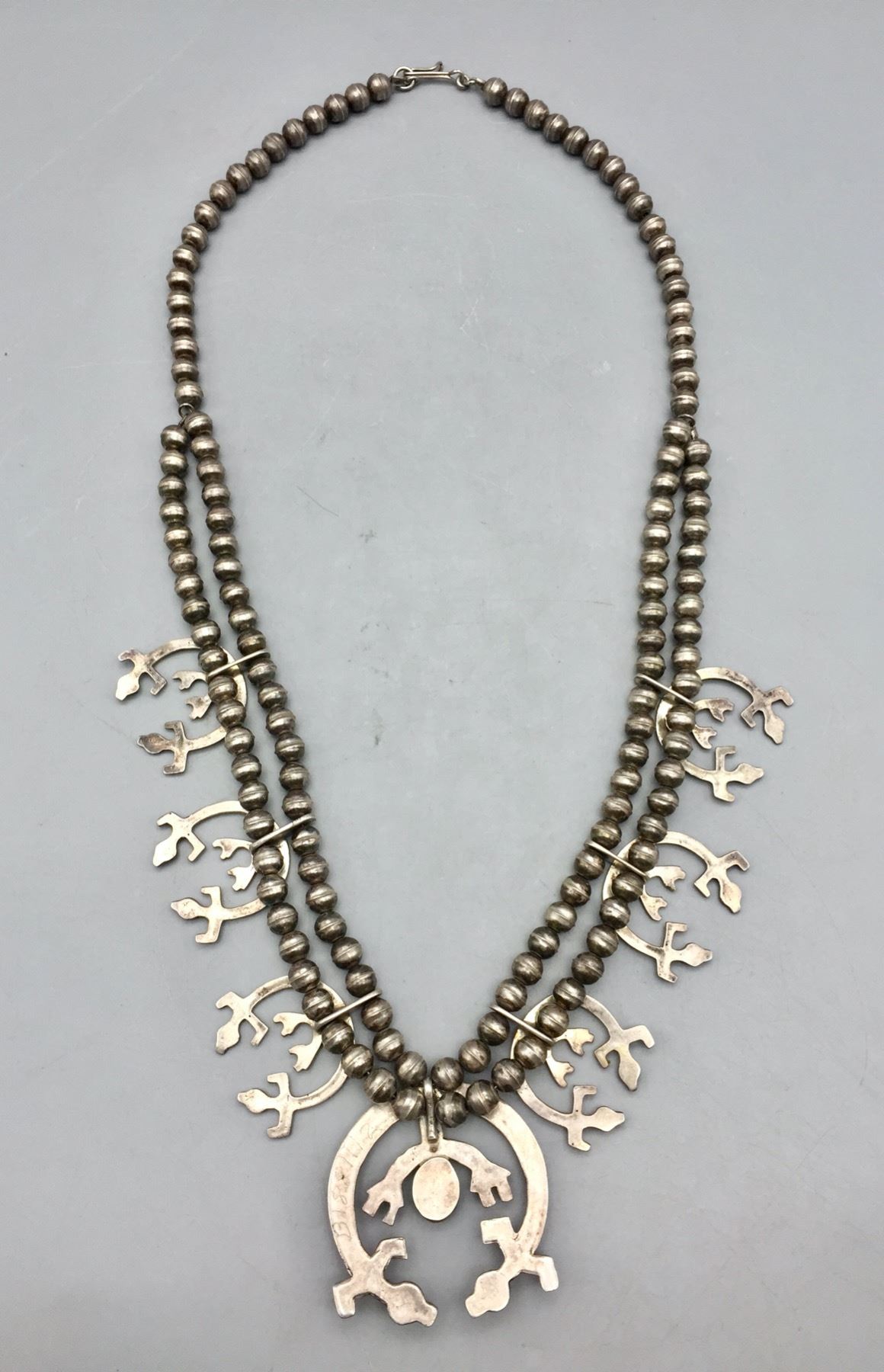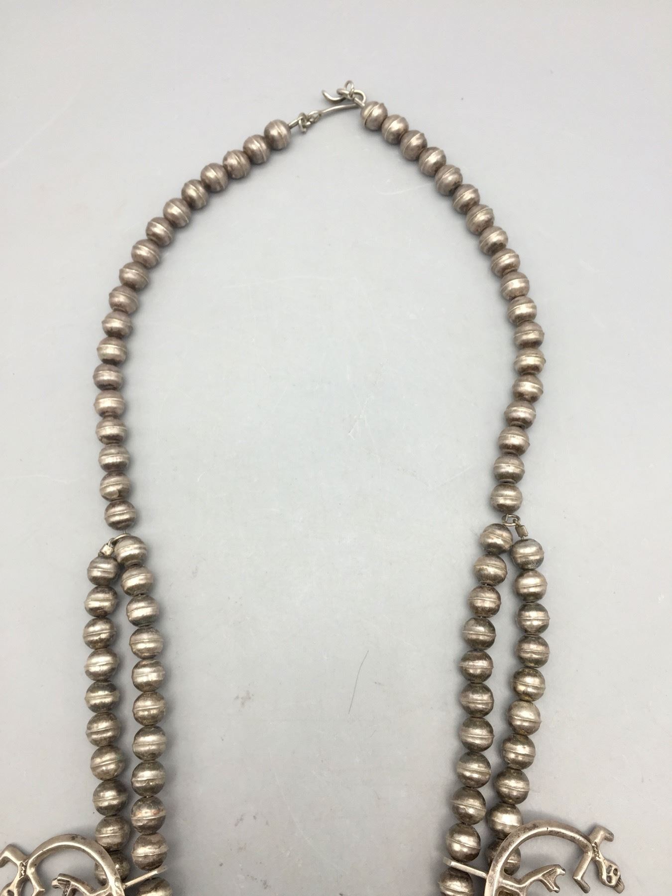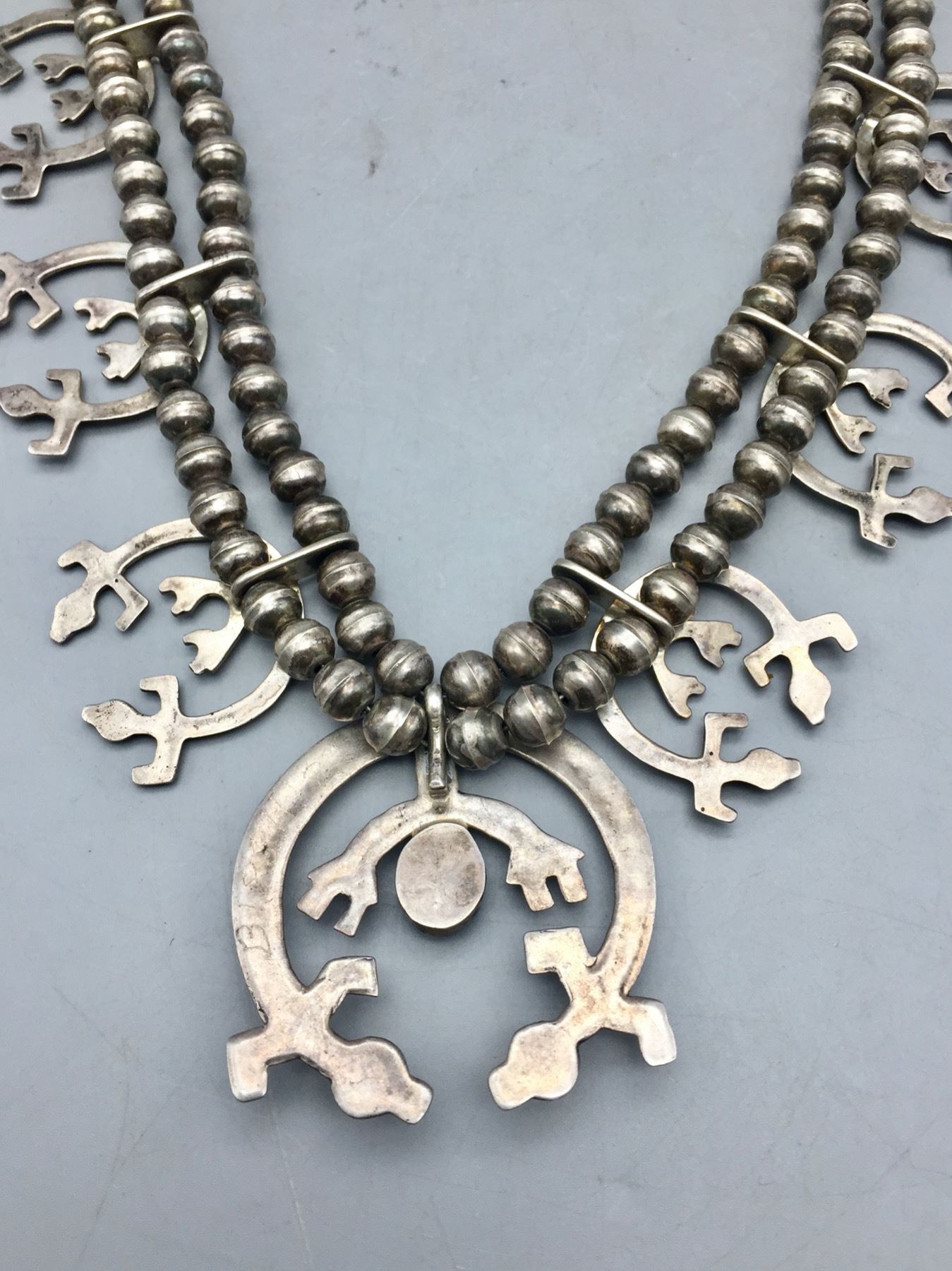 Description: For sale in this lot we have a unique rainbow man style squash blossom necklace. It features a turquoise stone in the naja and each “blossom” depicts a double figure. It is sterling silver.                                                                                         Maker: Unmarked.                                                                                                                  Approx. Age: Vintage to modern.                                                                                                            Size: Fits approx. a 27 inch neck. Naja measures 2-1/8 inches wide x 2-1/8 inches long. Weighs 146.4 grams.                                                                                                                                                                                                                                  Condition: Good for its age, normal wear expected.                                                                                                                Please look closely at the pictures - they are an important part of our description.                                Shipping: There will be a $5 handling, packaging fee for shipping this lot. The actual cost of postage will be added on top of that.