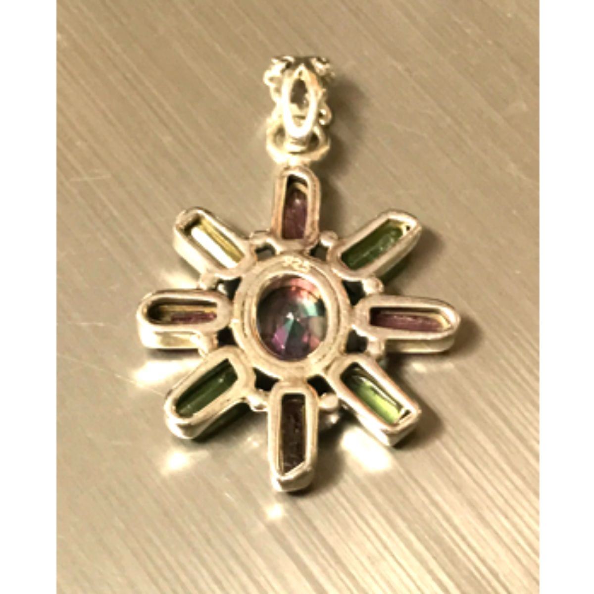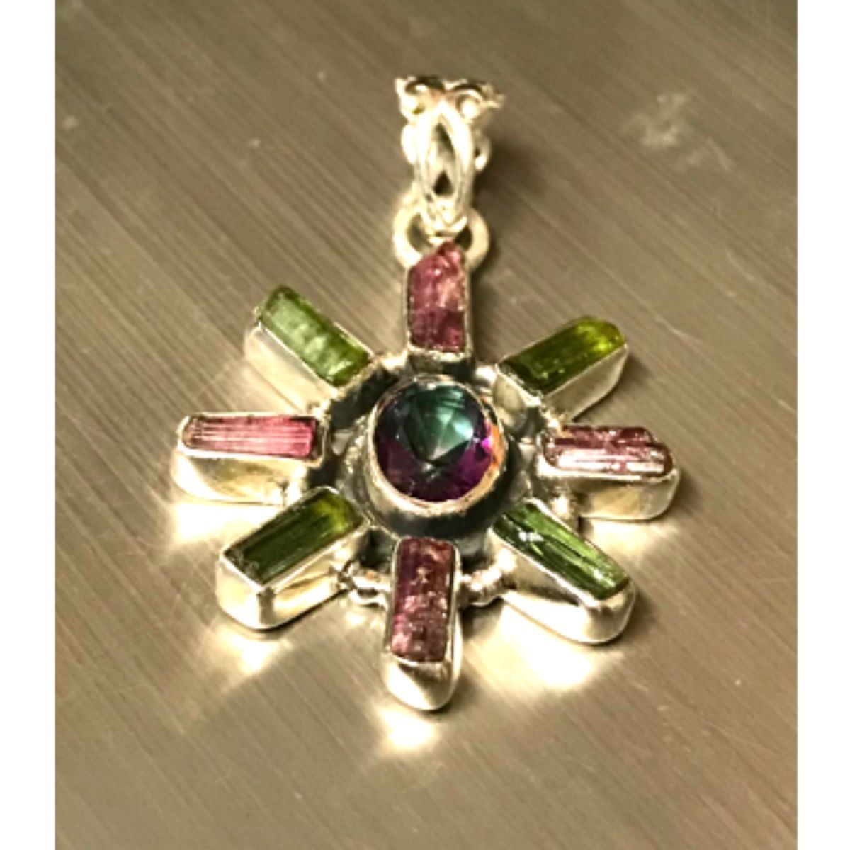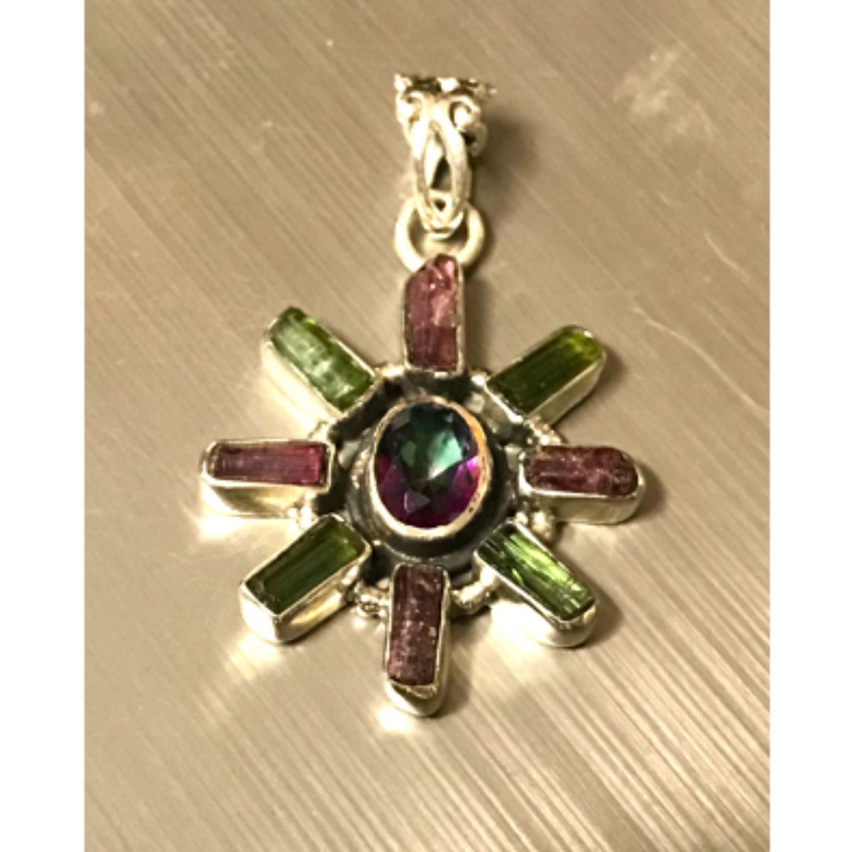 Oval faceted Rainbow Topaz (5x7m) focal stone, surrounded by 8 tiny, natural tourmaline (3x6mm) points, set into a mid century modern style stamped 925 sterling silver sunburst pendant. 1 1/2" H X 7/8" W.