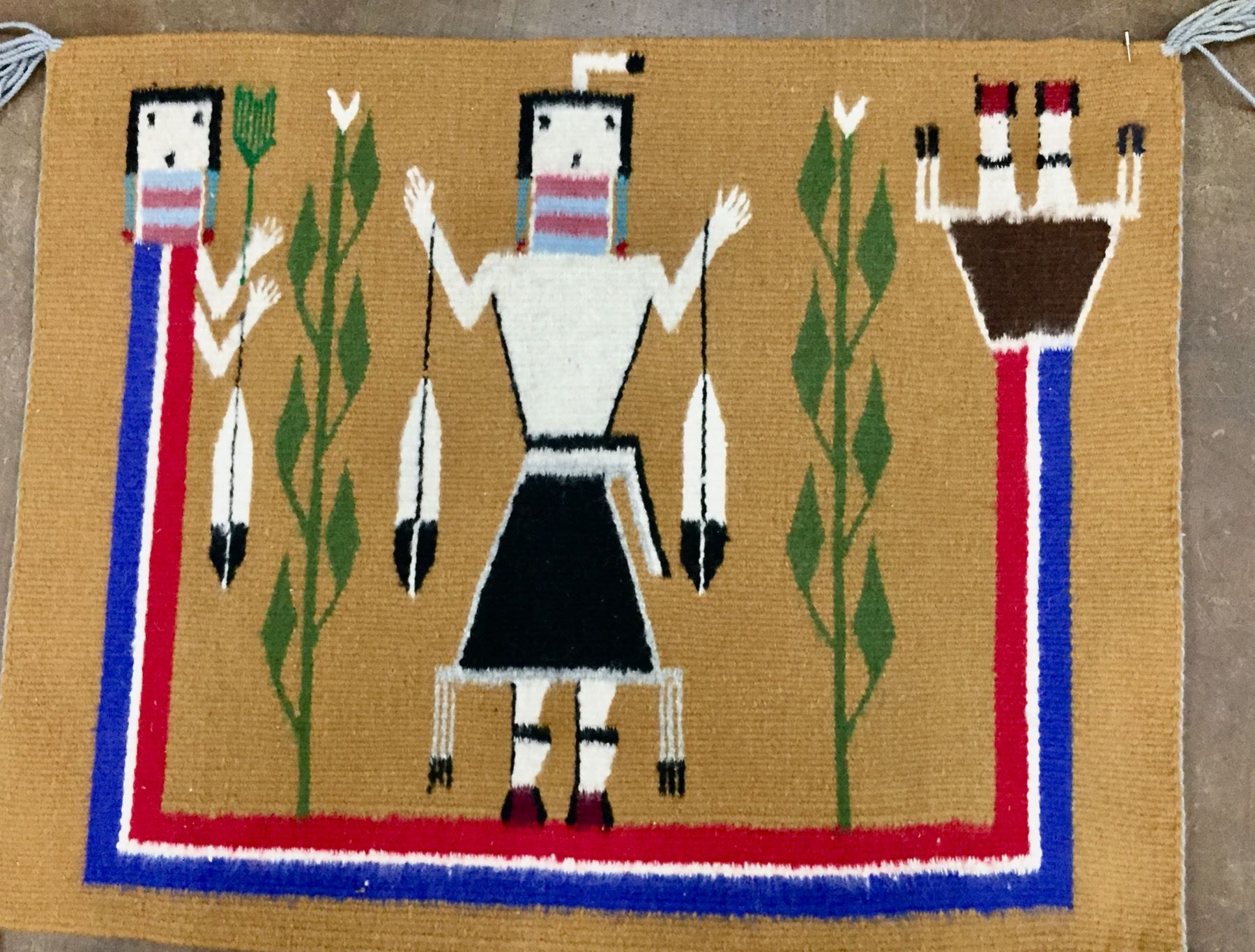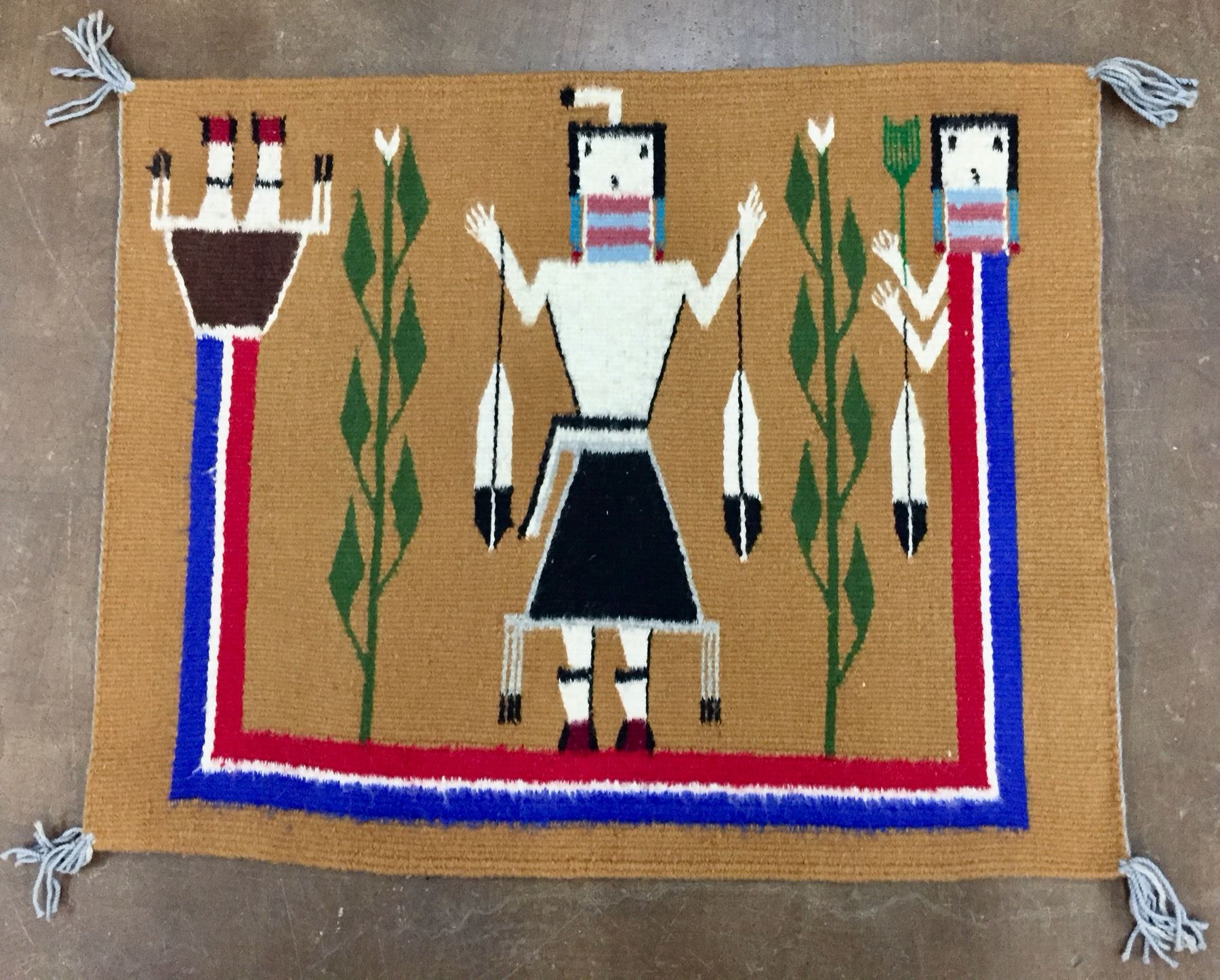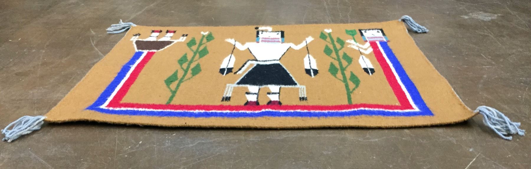 Description: Offered for sale in this lot is a nice little and colorful Rainbow Yei Navajo Textile that would make a great addition to your collection. Maker: Unknown Navajo Weaver. Approx. Age: Circa 1970s. Size: 25”w x 20” long. Condition: Good for its age, normal wear expected. Please look closely at the pictures - they are an important part of our description. Shipping: There will be a $5 handling / packaging fee for shipping this lot. The actual cost of postage will be added on top of that.