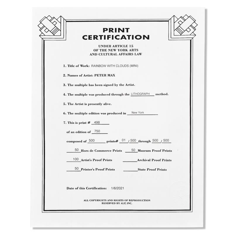 "Rainbow with Clouds" is a limited edition lithograph on paper by Peter Max, numbered 498/500 and hand signed by the artist. This piece comes framed. Includes Certificate of Authenticity from Peter Max Studios. Measures approximately 15" x 16" (frame), 4.5" x 5" (image).