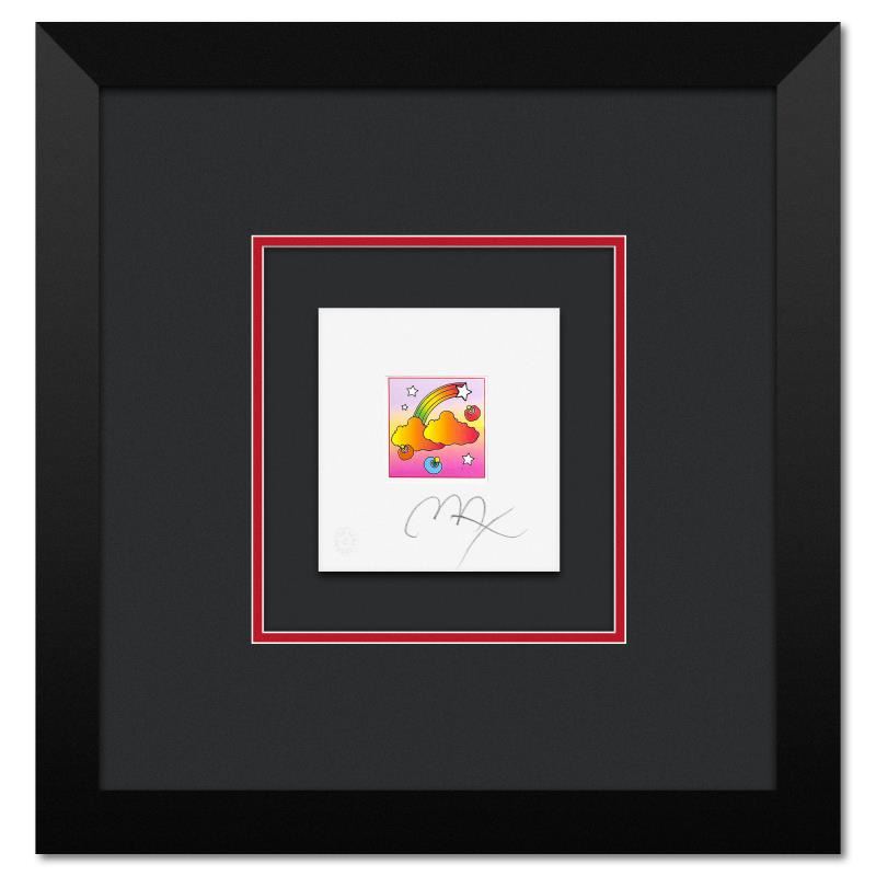 "Rainbow with Clouds" is a limited edition lithograph on paper by Peter Max, numbered and hand signed by the artist. This piece comes framed. Includes Certificate of Authenticity from Peter Max Studios. Measures approx. 14" x 13.5" (frame), 5" x 4.5" (image).