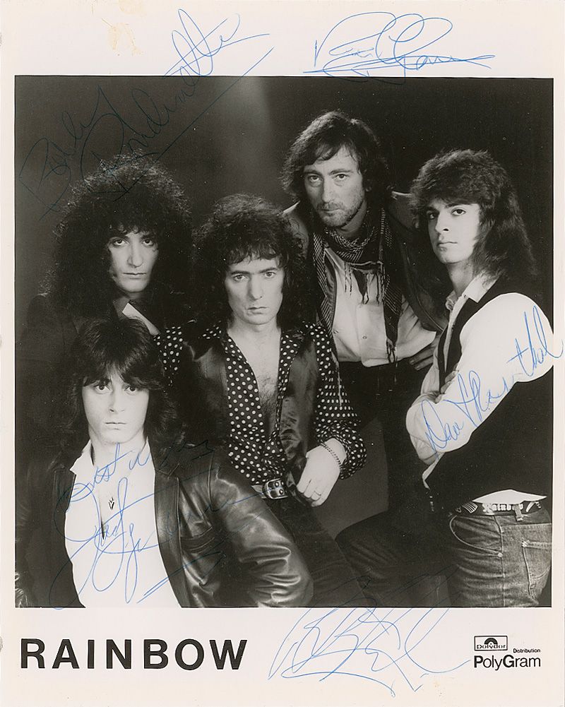 Glossy 8 x 10 PolyGram publicity photo, signed in blue ballpoint by the early 1980s lineup of Ritchie Blackmore, Bobby Rondinelli, David Rosenthal, Joe Lynn Turner, and Roger Glover. In fine condition, with a few spots of soiling to the upper and lower borders, and light binder dings to the left edge.