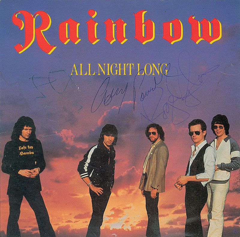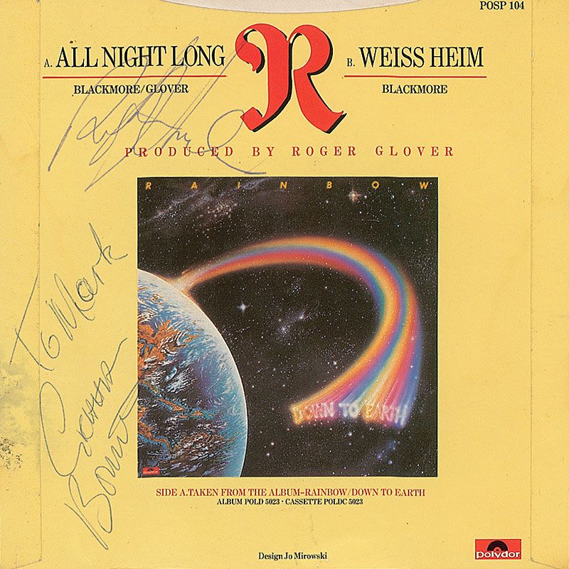 Color 45 rpm record sleeve for ‘All Night Long,’ signed on the front cover in blue ballpoint by Ritchie Blackmore, Cozy Powell, Roger Glover, and Don Airey, and signed on the back cover by Blackmore and Graham Bonnet (ins). In fine condition, with light skipping to a couple of the signatures. Accompanied by a full letter of authenticity from Roger Epperson/REAL.