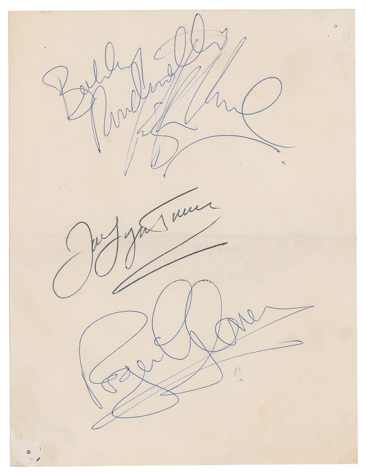 Ballpoint signatures, "Bobby Rondinelli," "Ritchie Blackmore," "Joe Lynn Turner," and "Roger Glover," on an off-white 5.25 x 6.75 sheet. In fine condition, with a central horizontal fold and tack holes to two corners. Accompanied by a ticket for a Rainbow concert at Bingley Hall in Stafford, England on July 18, 1981.