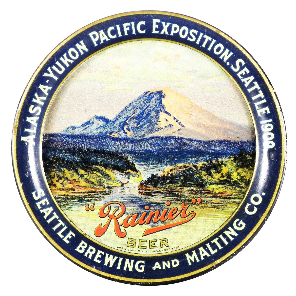 Rainer Beer Tin Tip Tray. Seattle Brewing and Malting Company. Alaska-Yukon Pacific Exposition, Seattle 1909. Several dents in center and minor edge ware otherwise good condition. 4 1/4 inch diameter.
