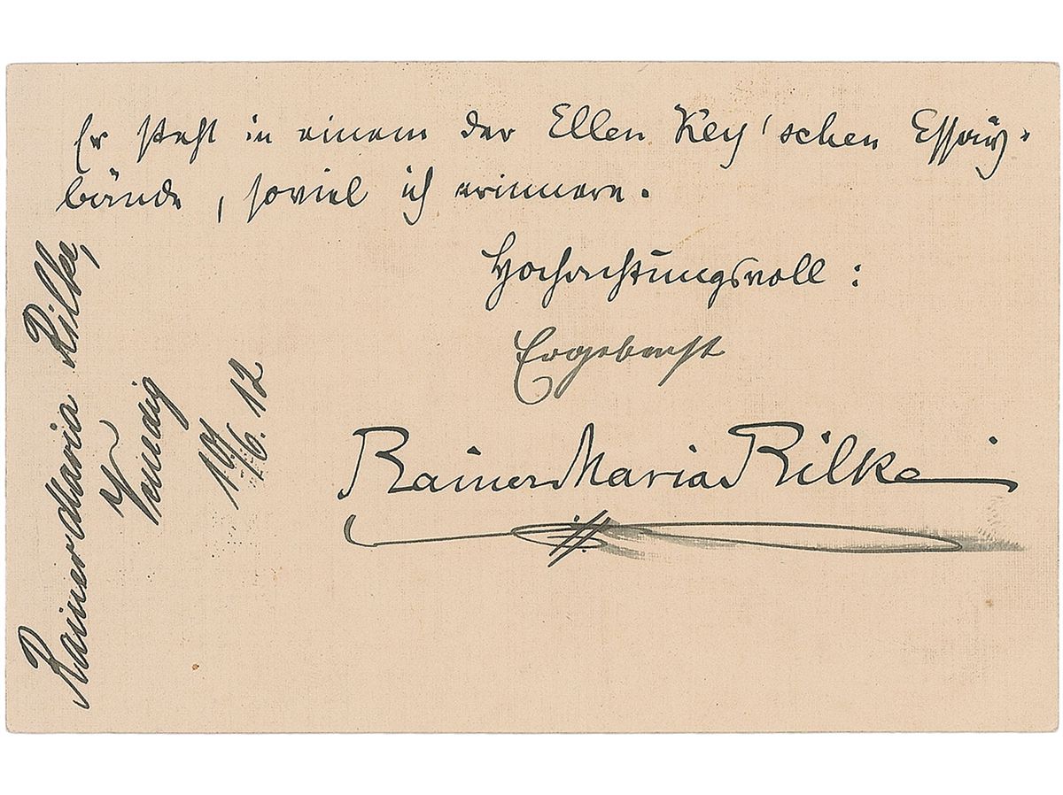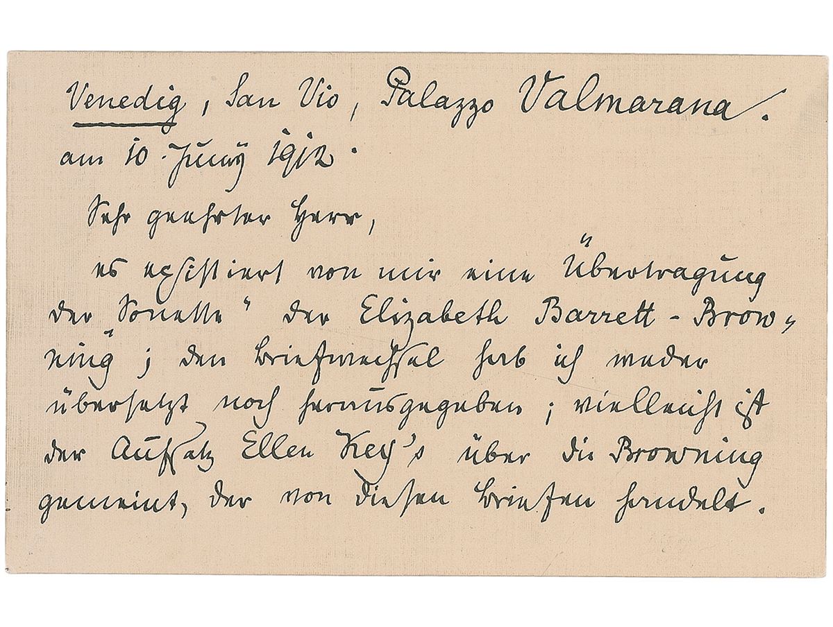 Scarce ALS in German, both sides of a 5.25 x 3.5 card, June 12, 1912. Letter to a gentleman. In part (translated): “There exists a translation of the ‘Sonnets’ of Elizabeth Barrett Browning done by me; I neither translated nor published her correspondence; perhaps what is meant is Ellen Key’s essay on Mrs. Browning, which discusses these letters. So far as I remember, it is to be found in one of the volumes of Ellen Key’s essays.” In fine condition. Ellen Key was a prominent Swedish feminist writer who encouraged the young Rilke, who was likely drawn to Browning’s poetry by the concepts of love it projects. Rilke published Browning’s ‘Sonnets from the Portuguese’ in translation in 1908. A beautifully penned letter with fantastic literary associations.