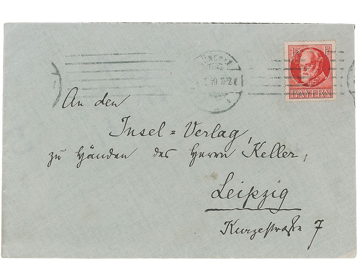Influential poet (1875–1926) who takes a place among the most highly regarded figures in early modern literature. Uncommon hand-addressed mailing envelope, 5.5 x 3.75, addressed by Rilke to the director of publisher Insel-Verlag in Leipzig. Postmarked Munich, January 3, 1919. In fine condition, with a couple tiny stains.