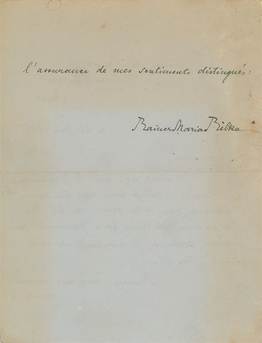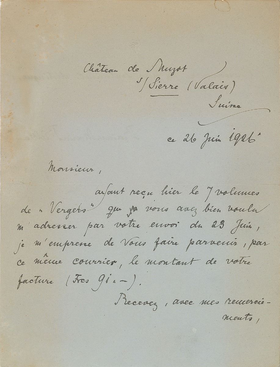 ALS in French, one page both sides, 6.25 x 8.25, June 26, 1926. Letter to publisher Gaston Gallimard, telling him that he has received “the 7 volumes of ‘Vergers.’” In very good to fine condition, with light toning and staining to the edges.