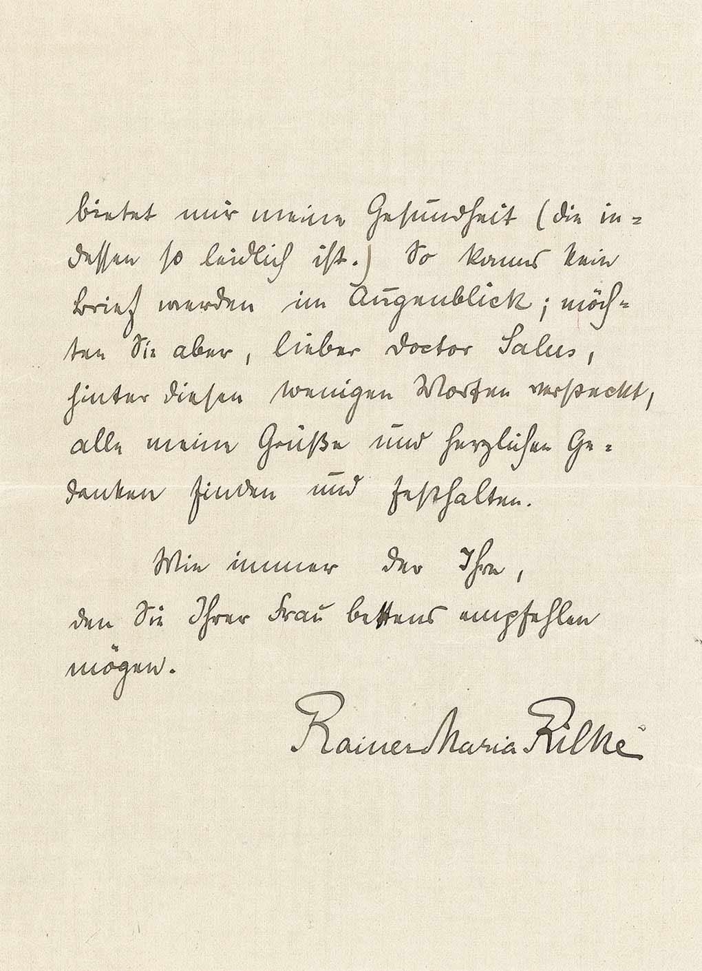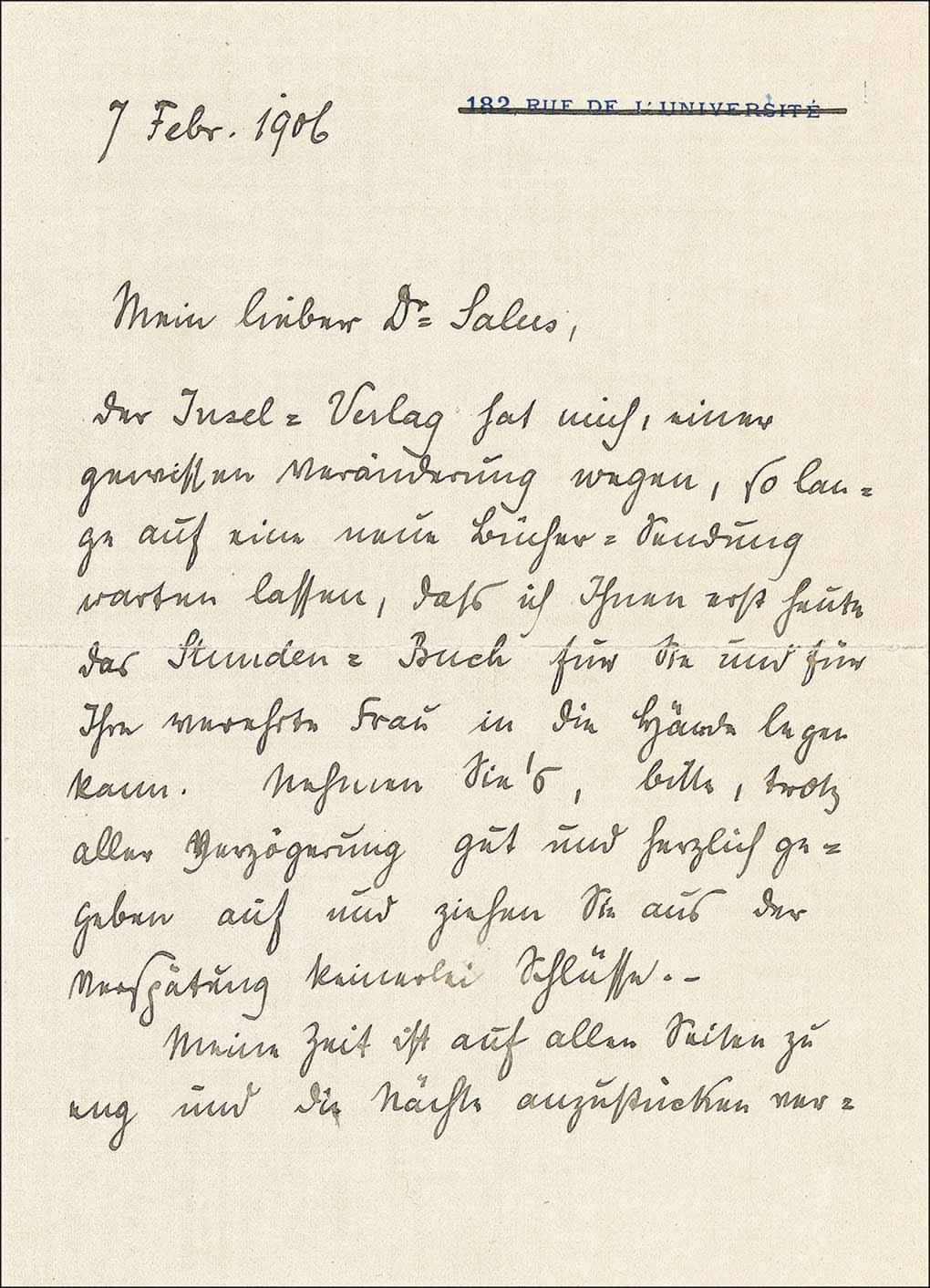 ALS in German, two pages on adjoining sheets, 5 x 6.75, February 7, 1906. Letter to writer and physician Hugo Salus. In part (translated): “Due to a certain change, the Insel publishing house has kept me waiting for a new lot of books, so it is only today that I can present to you and your dear wife the Book of Hours. Please, accept it as given with sincere affection, in spite of the late arrival, and do not draw any conclusions from the delay. My time is too strained, and my health (otherwise tolerable) forbids me to extend my work into night. Thus, this cannot be a proper letter, just now.” In fine condition.