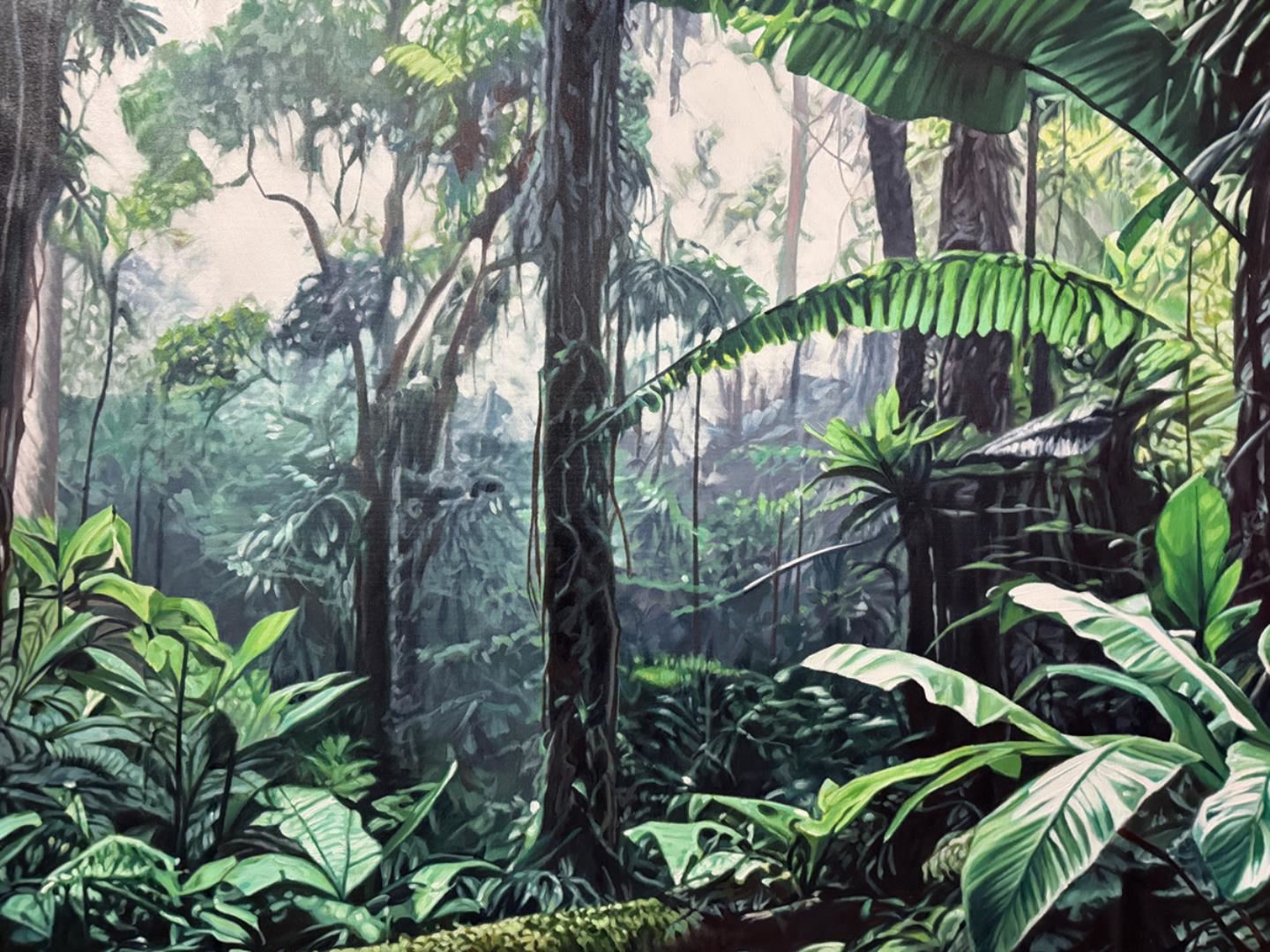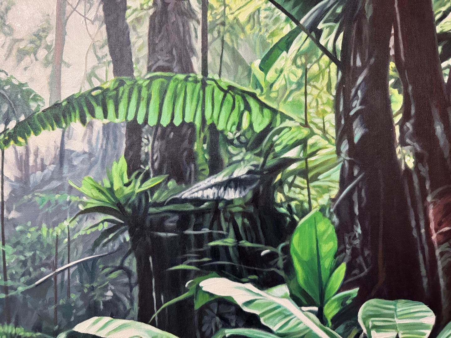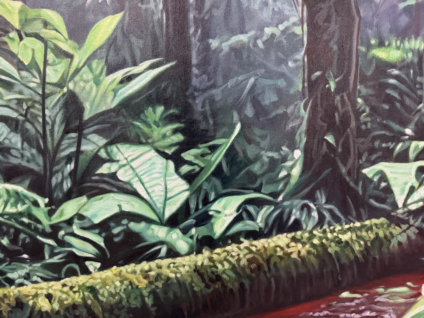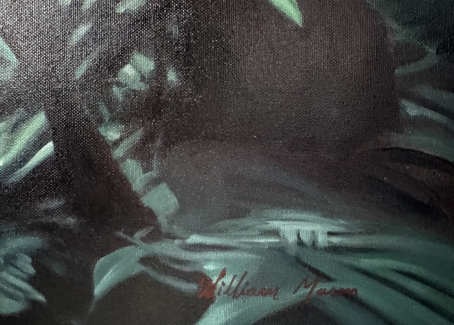 Brilliant original oil on linen, showcases Mason's unique vision and skillful technique. Hand-signed by the artist. The piece elegantly comes framed in esperesso floater. Art size 70x40" framed size72x42"