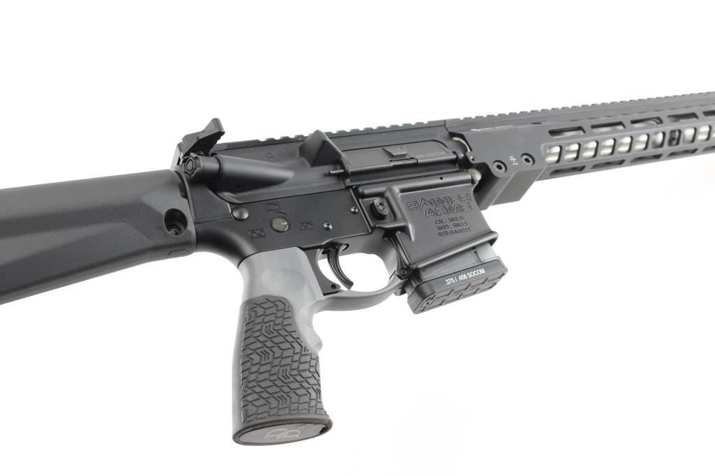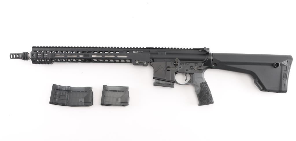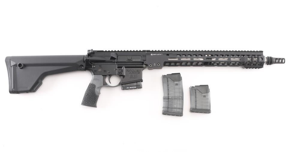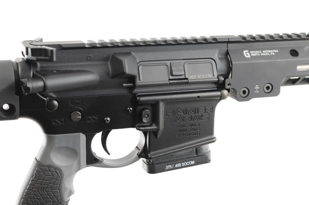 Deluxe Big Bore AR15 style rifle with premium components. Features 16.5" fluted stainless Wilson Combat barrel, Wilson Combat Bolt Carrier Group, muzzle brake with external threads for suppressor mounting (possibly by SilencerCo), Giessele Super Modular MK13 15" rail, SN-ATCH ambi tac-latch charging handle, ejection port cover marked "458 SOCOM", Daniel Defense pistol grip, single stage drop-in trigger & hammer with anti-walk pins, Magpul MOE Rifle stock (fixed, hinged floorplate allows access to compartment in butt). Provided magazines are caliber marked, Lancer L5-AWM polymer, possibly CMMG modified, one 7 and two 5 rd. No optics or sights provided. Overall condition is excellent with few observed minor handling marks. Condition is NRA Excellent *** Modern Firearm ***