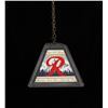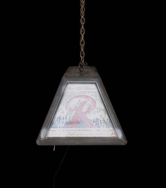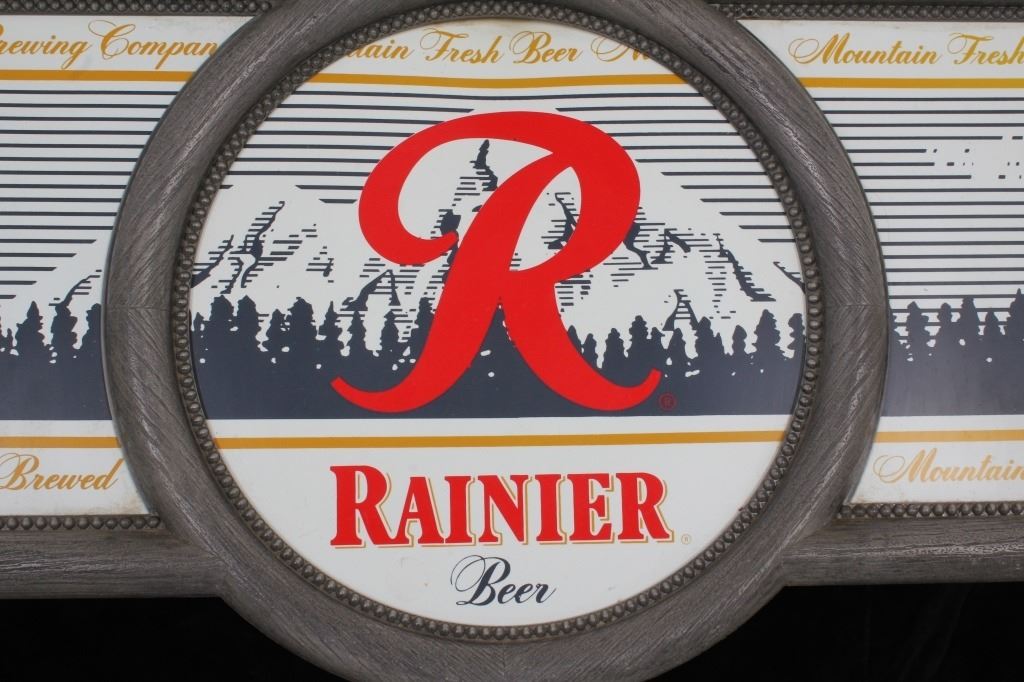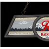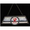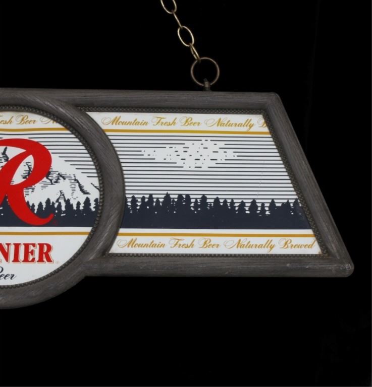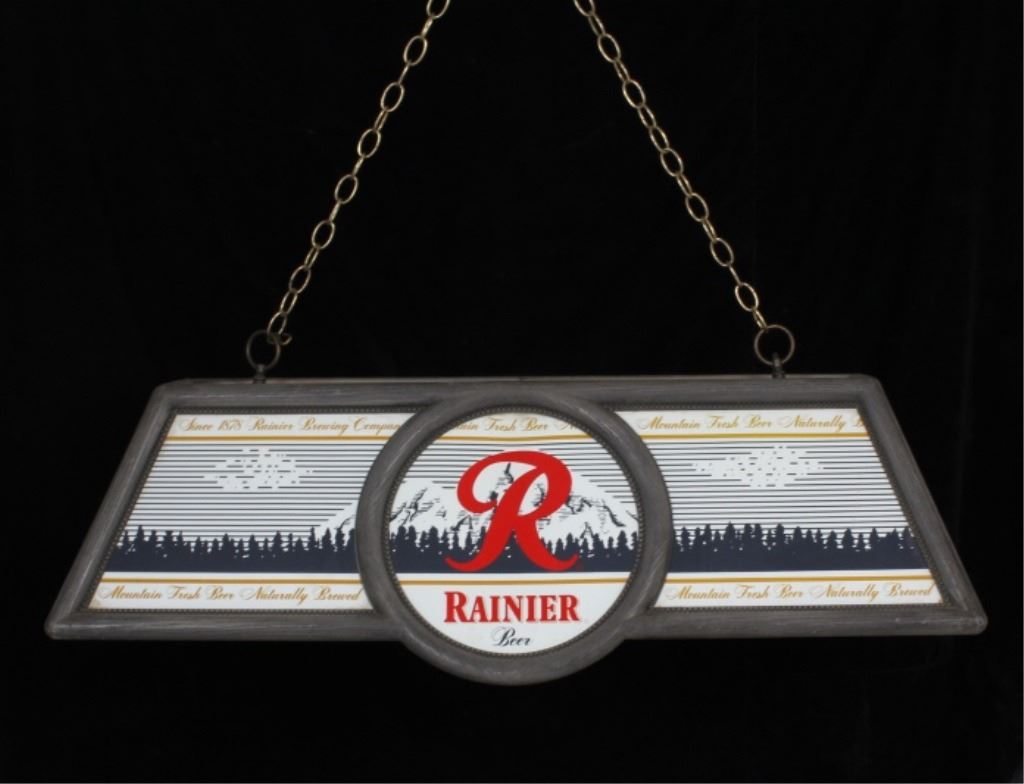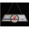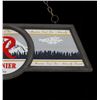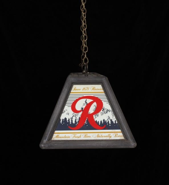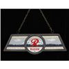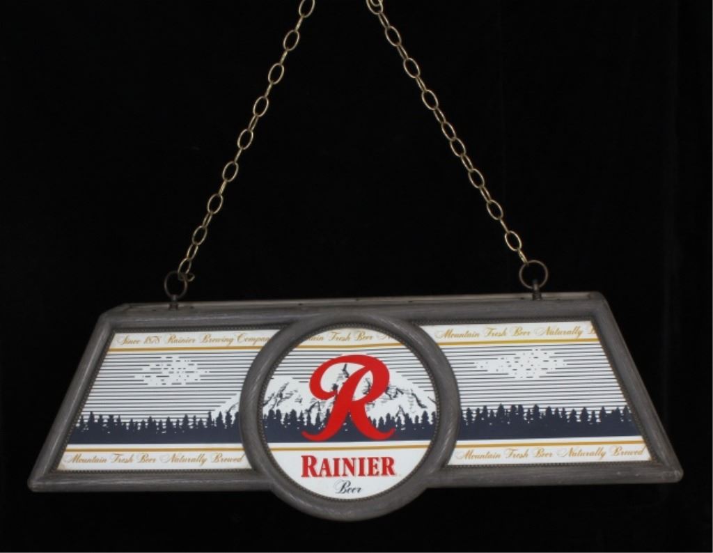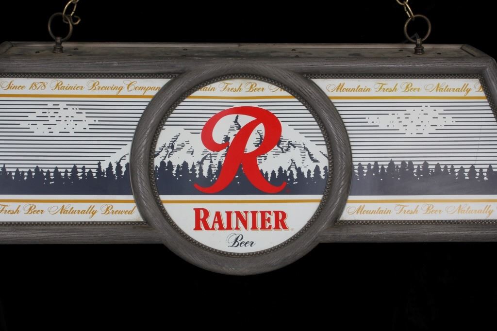 Offered for your bidding pleasure is this Rainier Beer Billiards Table Fluorescent Light. The light displays a beautiful mountain depiction with a forest surrounding. This piece shows red, navy blue, yellow and cream colors. The light is designed to hang above a pool table to illuminate the playing surface. The light is in good condition overall and is in good working order. The piece measures 40 1/2" wide, 15" deep, 14" tall.