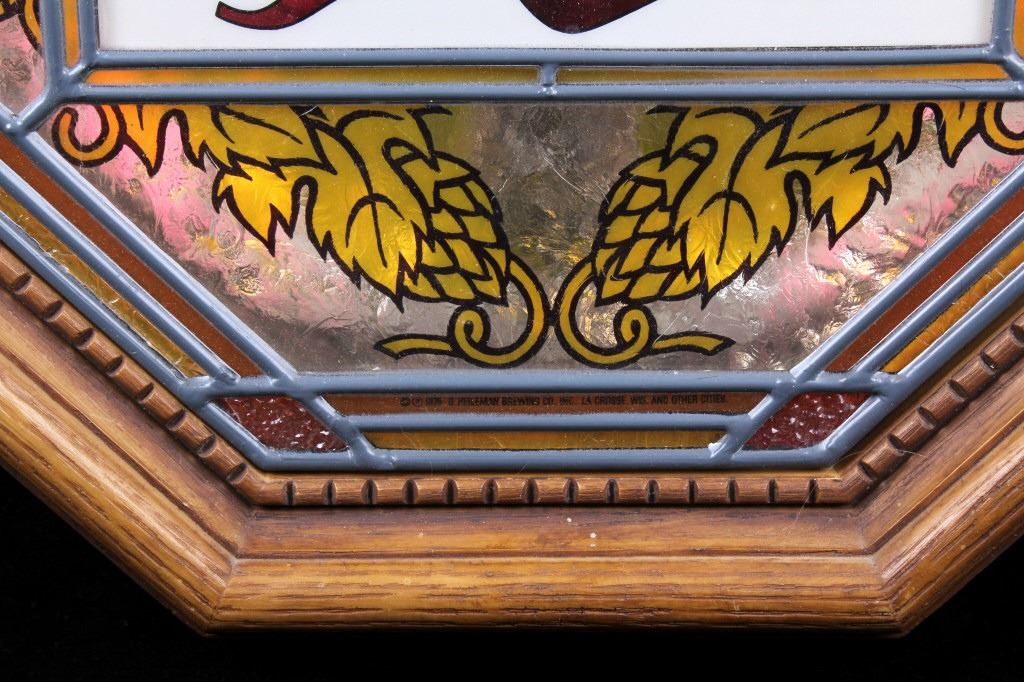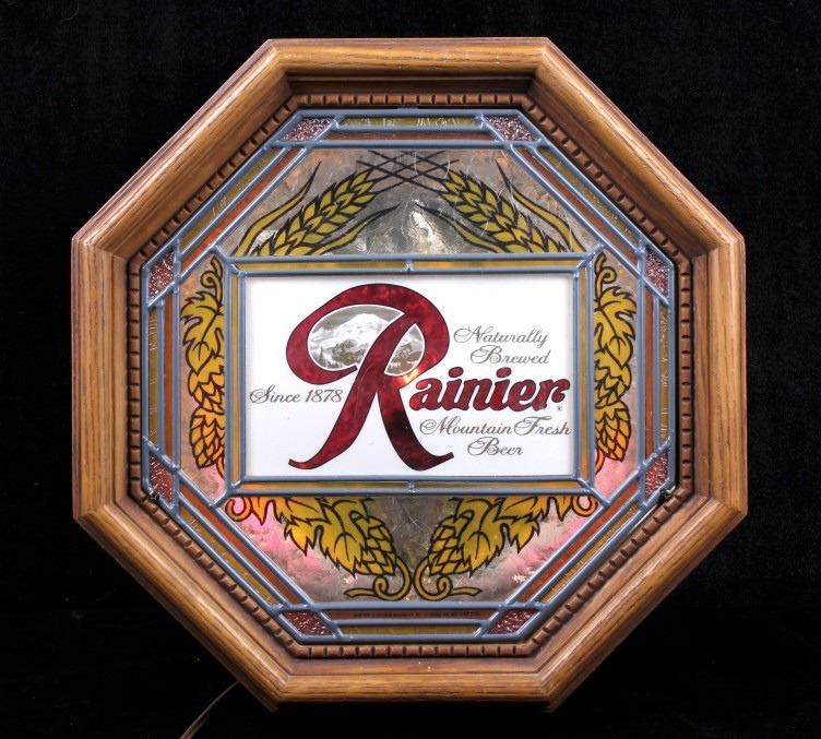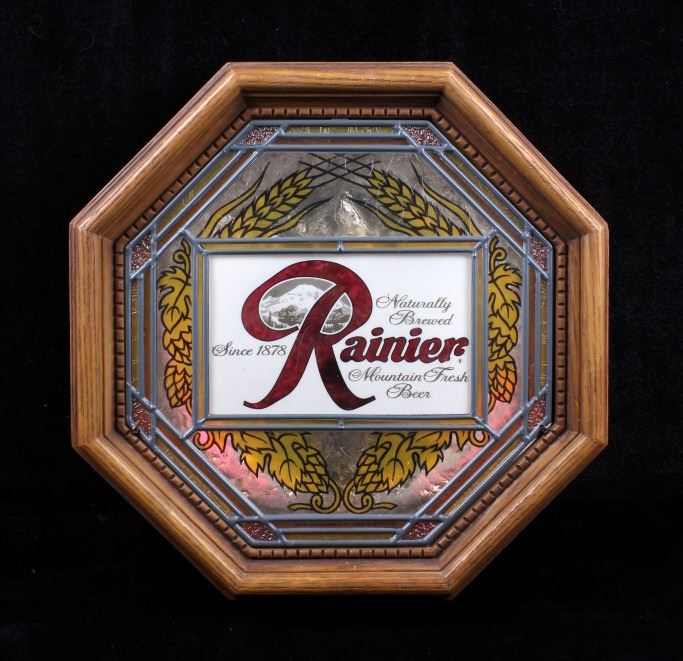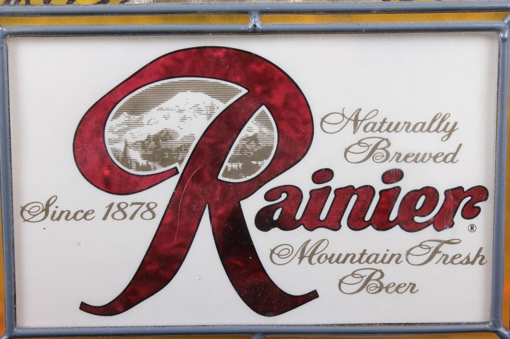 For your consideration in this lot is a Rainier Beer light up advertising sign. The sign reads "Naturally Brewed Rainier Mountain Fresh Beer Since 1878". Rainier Beer was located and brewed in Seattle, Washington until the late 1990's. This sign takes an octagon shape and shows painted plastic to resemble stained glass. The item has been tested and it is in good working condition. It measures 16".