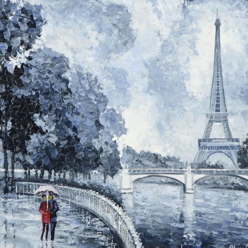 "Rainy Day by the Eiffel Tower" is an original oil painting on canvas by Alexander Antanenka, hand signed by the artist. The framed for this piece was hand painted by Antanenka. Includes Certificate of Authenticity. Measures approx. 43" x 37" (frame), 30" x 24" (image).
